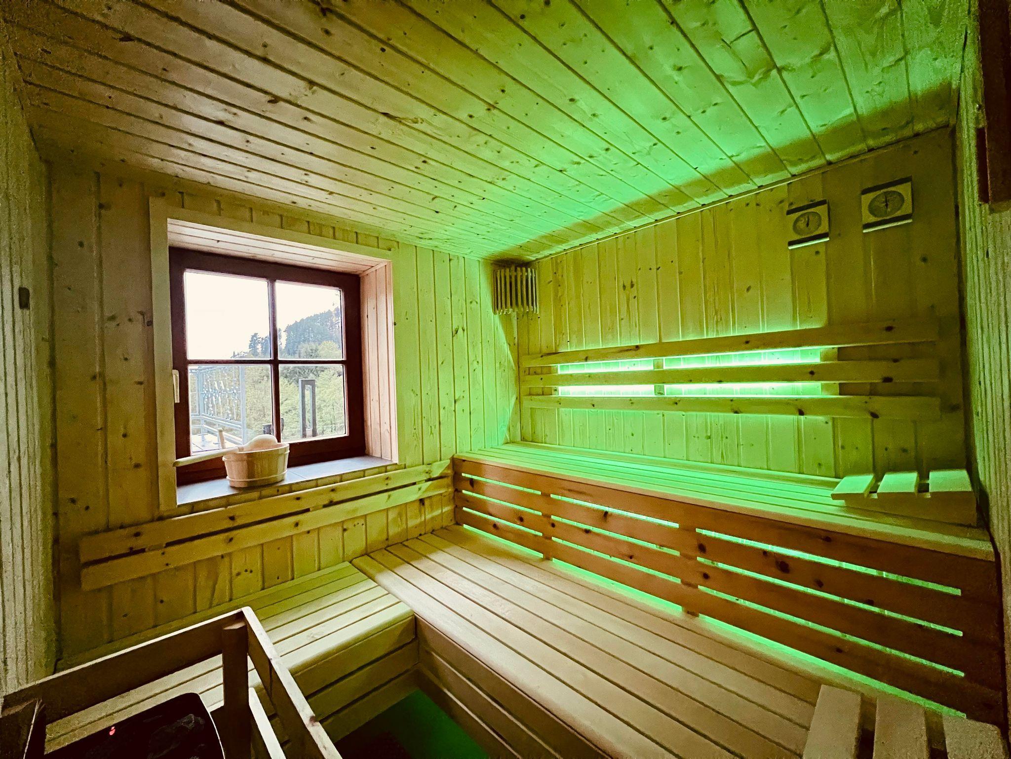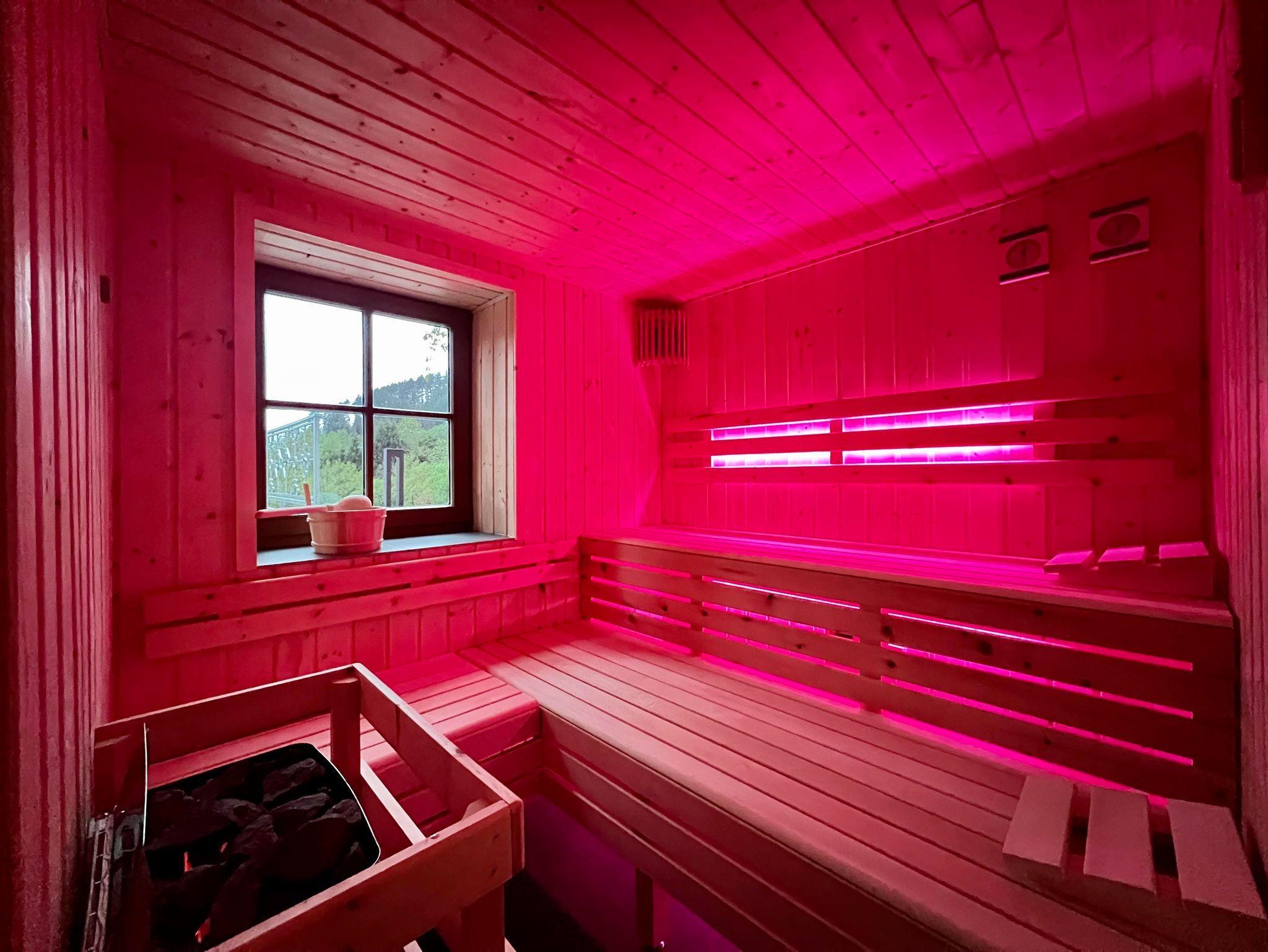 2023 wurde ein kleiner feiner Saunabereich im Keller geschaffen. Die Sauna hat ein Fenster nach draußen, so macht das saunieren mit Blick auf die Natur doppelt Freude. Sie bietet Platz für bis zu 6 Personen.