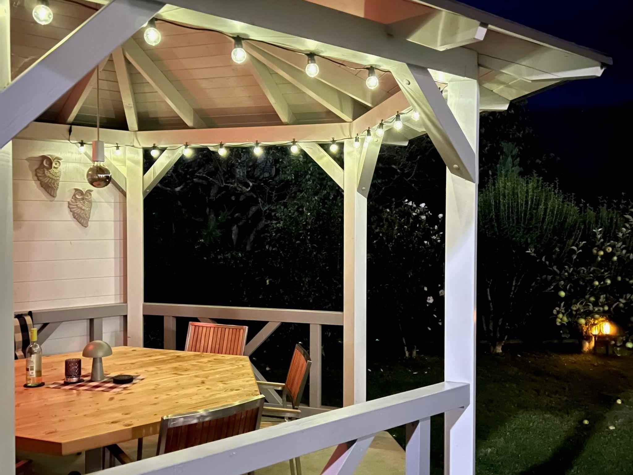 Terrasse möbliert mit Esstisch, Stühlen und Sonnenschirm; Sonnenliegen im Garten, Holzpavillon komplett ausgestattet mit Esstisch und Stühlen, Bäume als natürliche Schattenspender. Grill, Gartenfläche 2/3 eingezäunt; 1 abschließbare Garage und 2 kostenlose Autostellplätze im Freien;