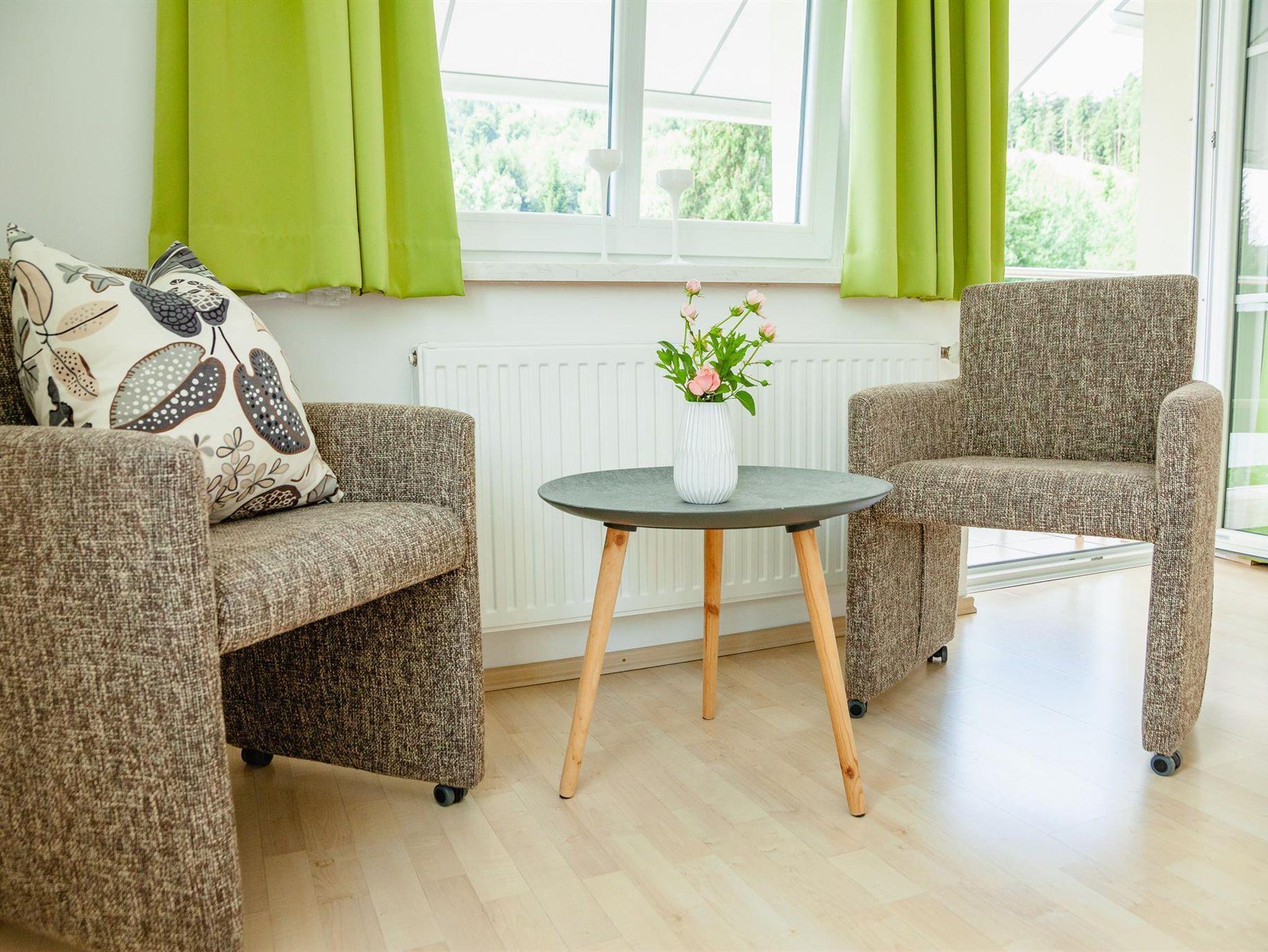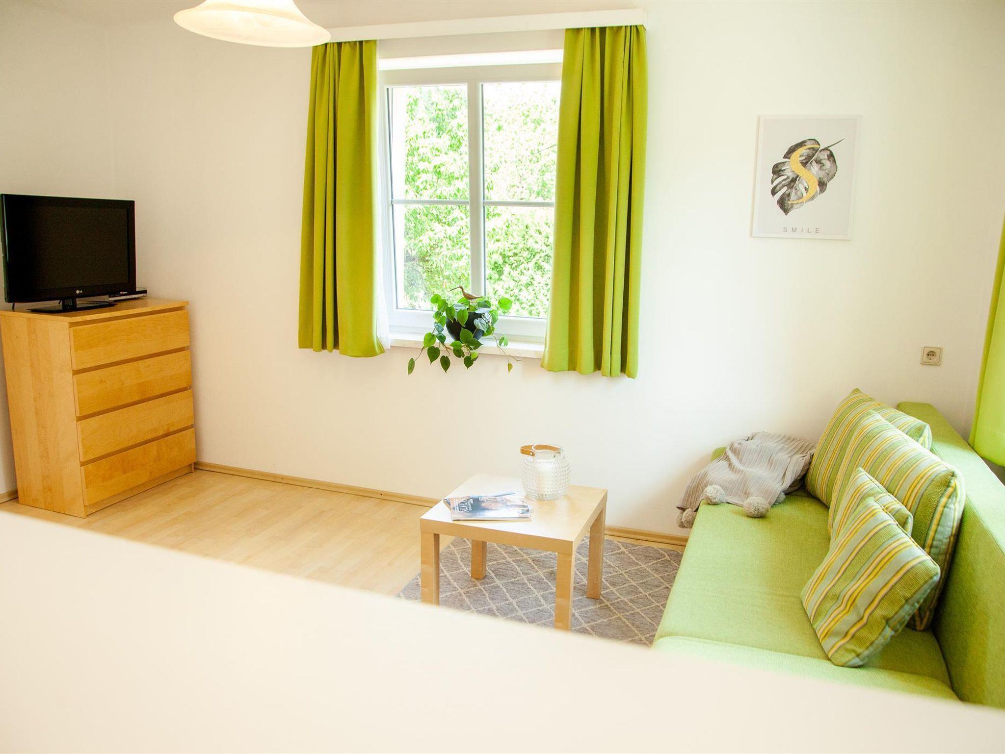 * Wohn-Esszimmer (mit Essecke, bequemer Couch, Flatscreen-Sat-TV und Radio)