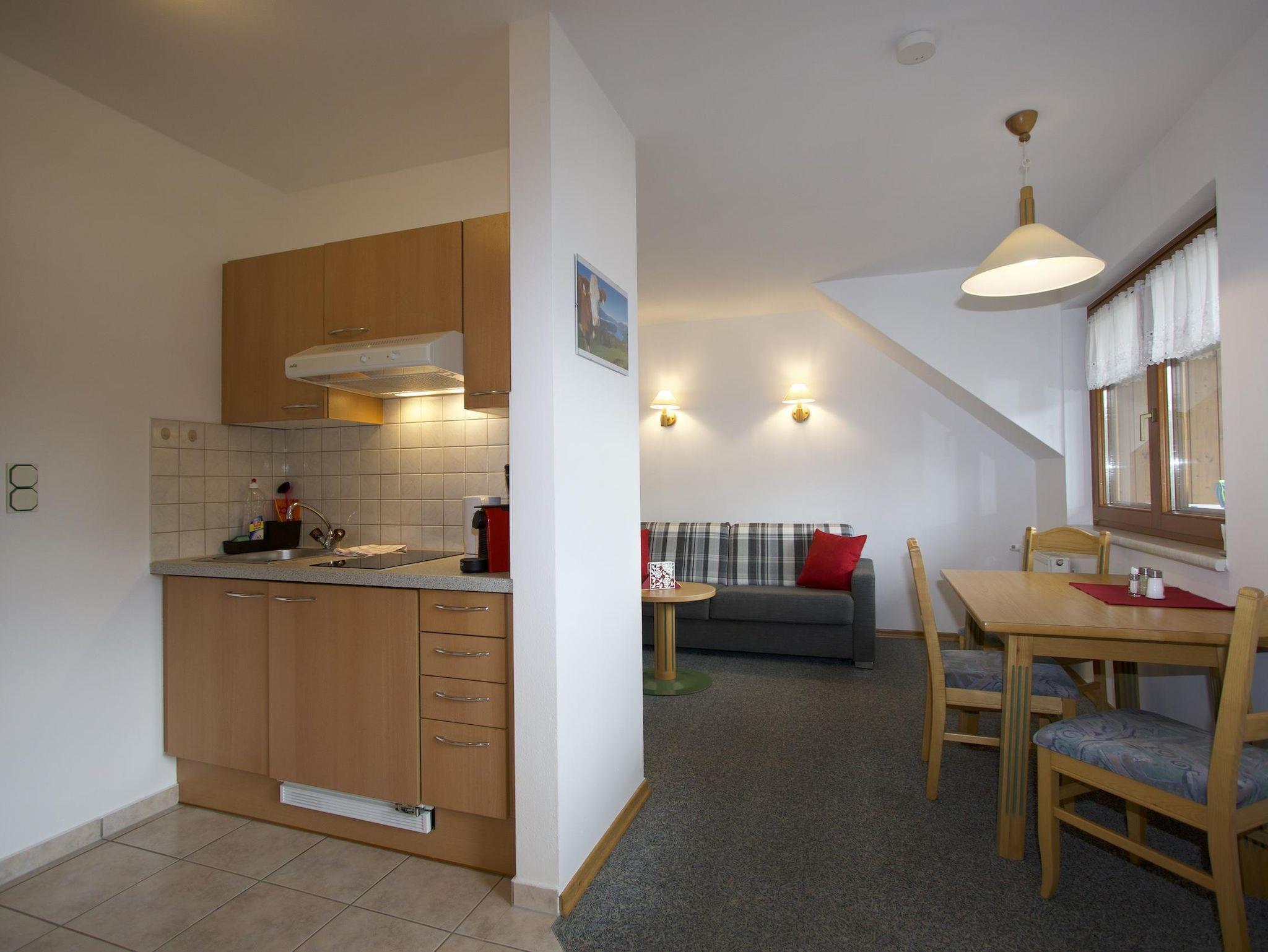 Appartement “Bergkristall” ca. 23 m2 Wohnung für zwei Personen im 2. Obergeschoss, 1 Schlafraum, 1 kleine Wohnküche, Nespressomaschine, Dusche und WC, SAT-TV, herrlicher Blick in die Berge, nordseitig, kein Balkon
