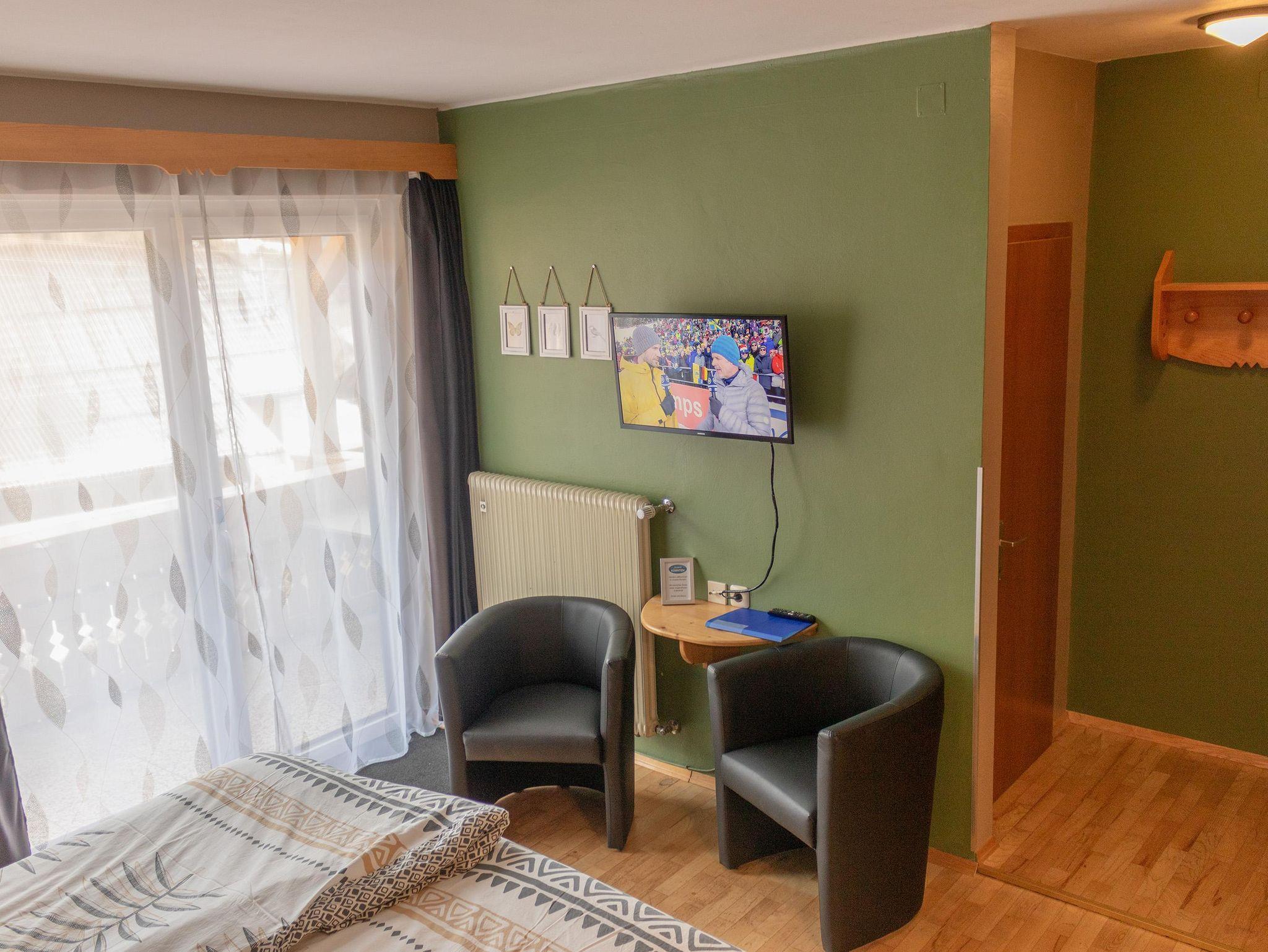Doppelzimmer mit eigenem Badezimmer und Südbalkon mit Blick auf die Burg Sommeregg und das Goldeckgebirge.