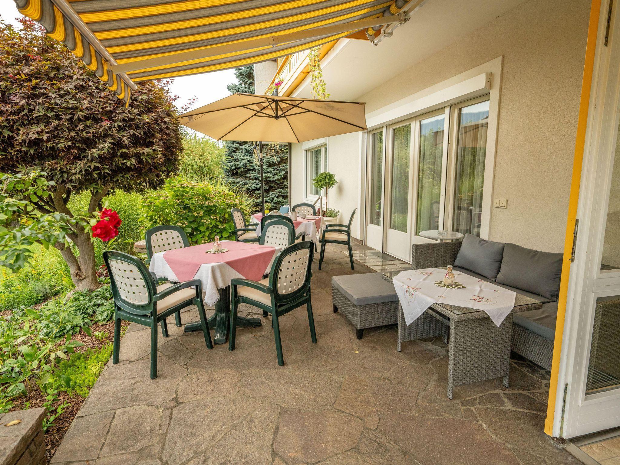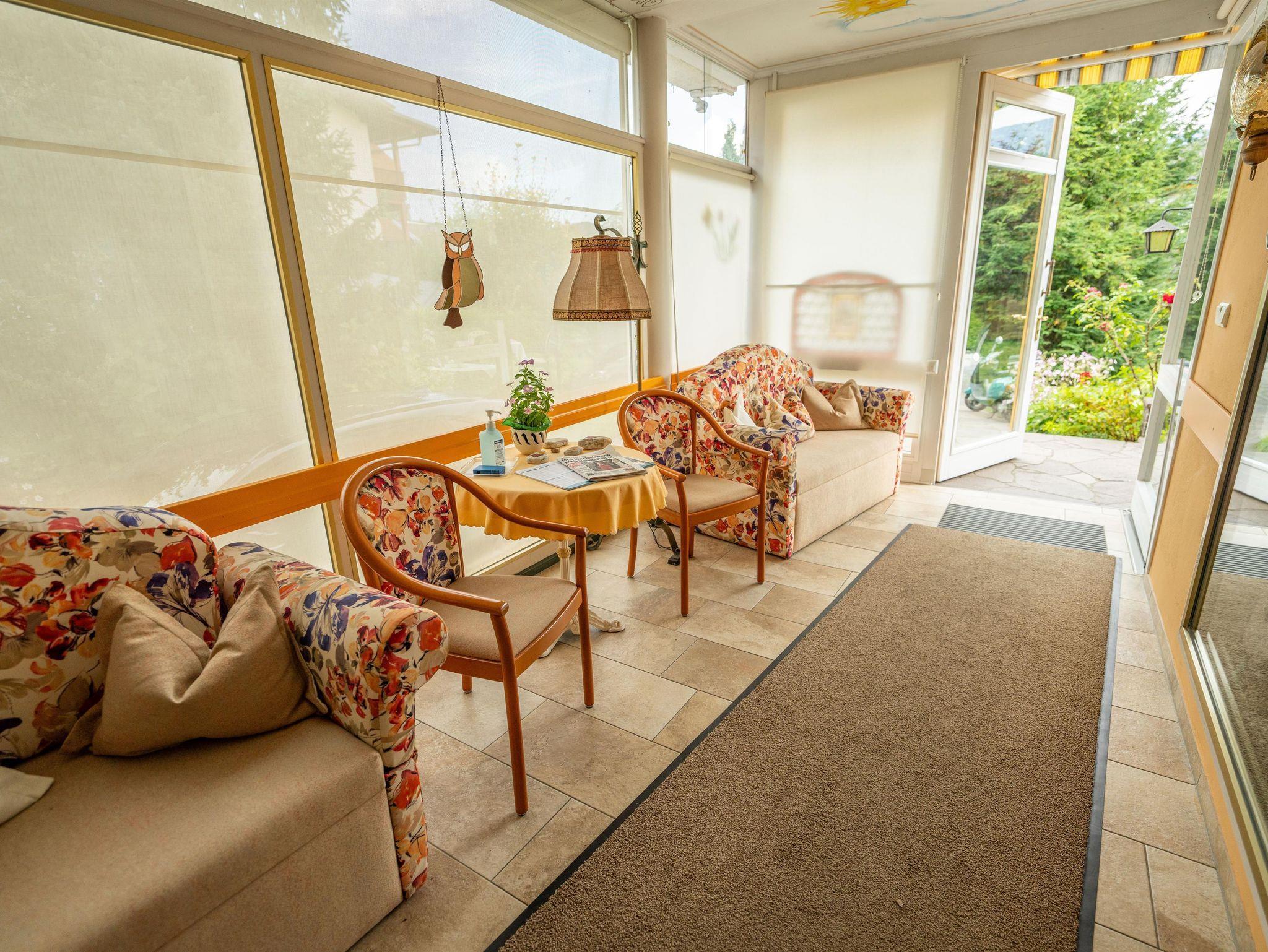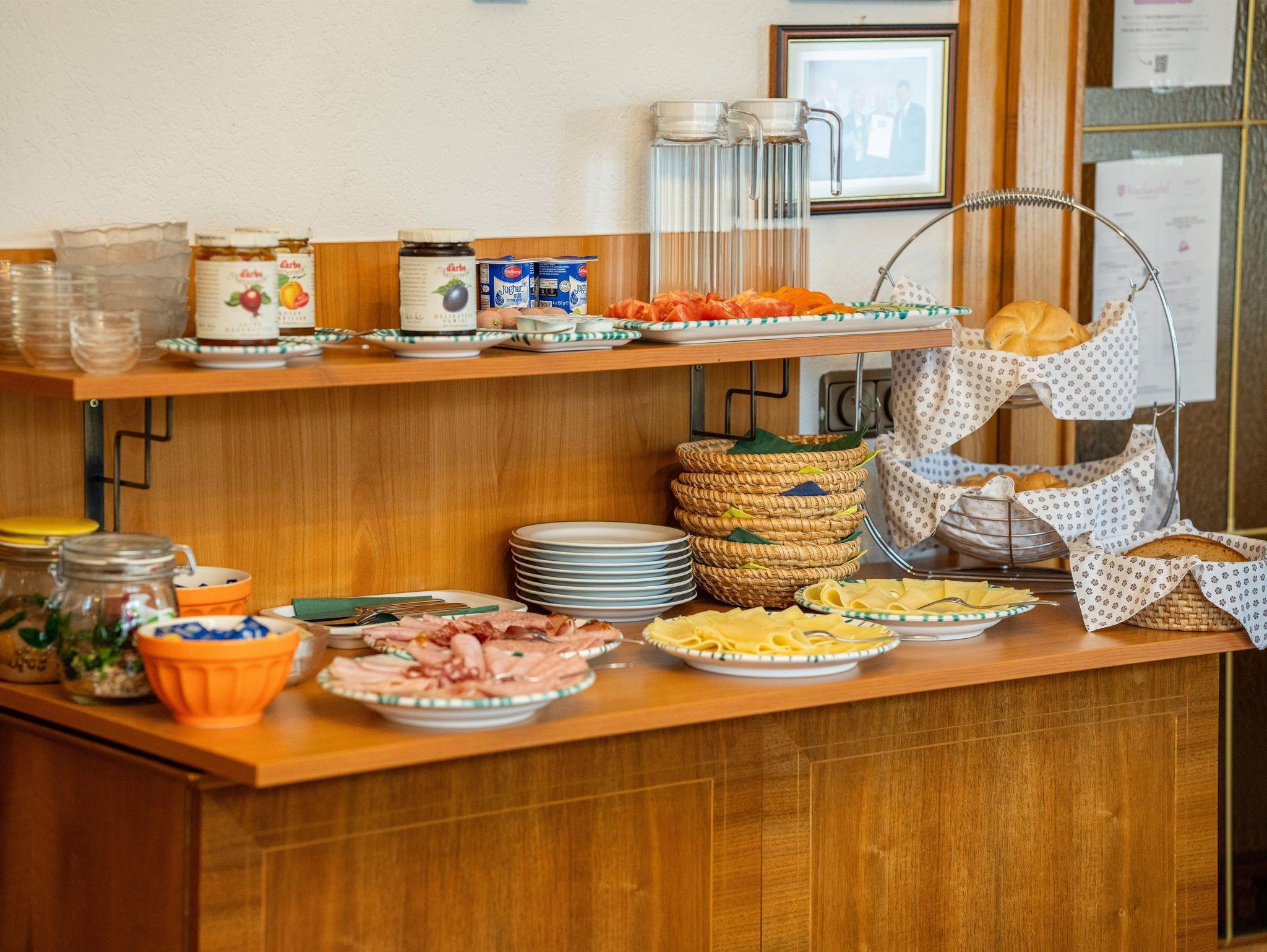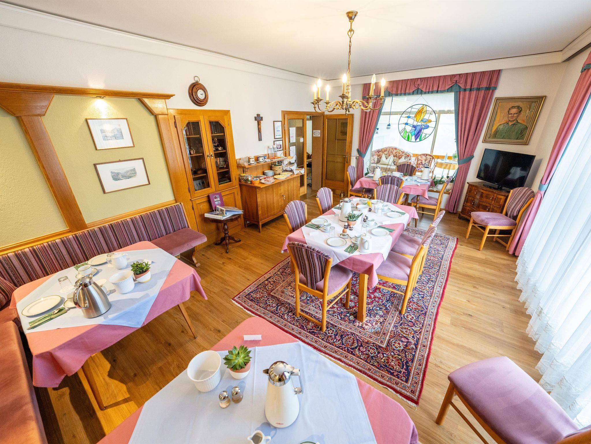 Das schöne und gemütlich eingerichtete Zimmer ist ausgestattet mit Dusche/WC, Zentralheizung, Sat/TV, kostenlosen W-LAN und Blick auf den Garten und die umliegende Bergwelt, Frühstücksbuffet. Gästekühlschrank. Frühstücksraum mit SAT/TV.