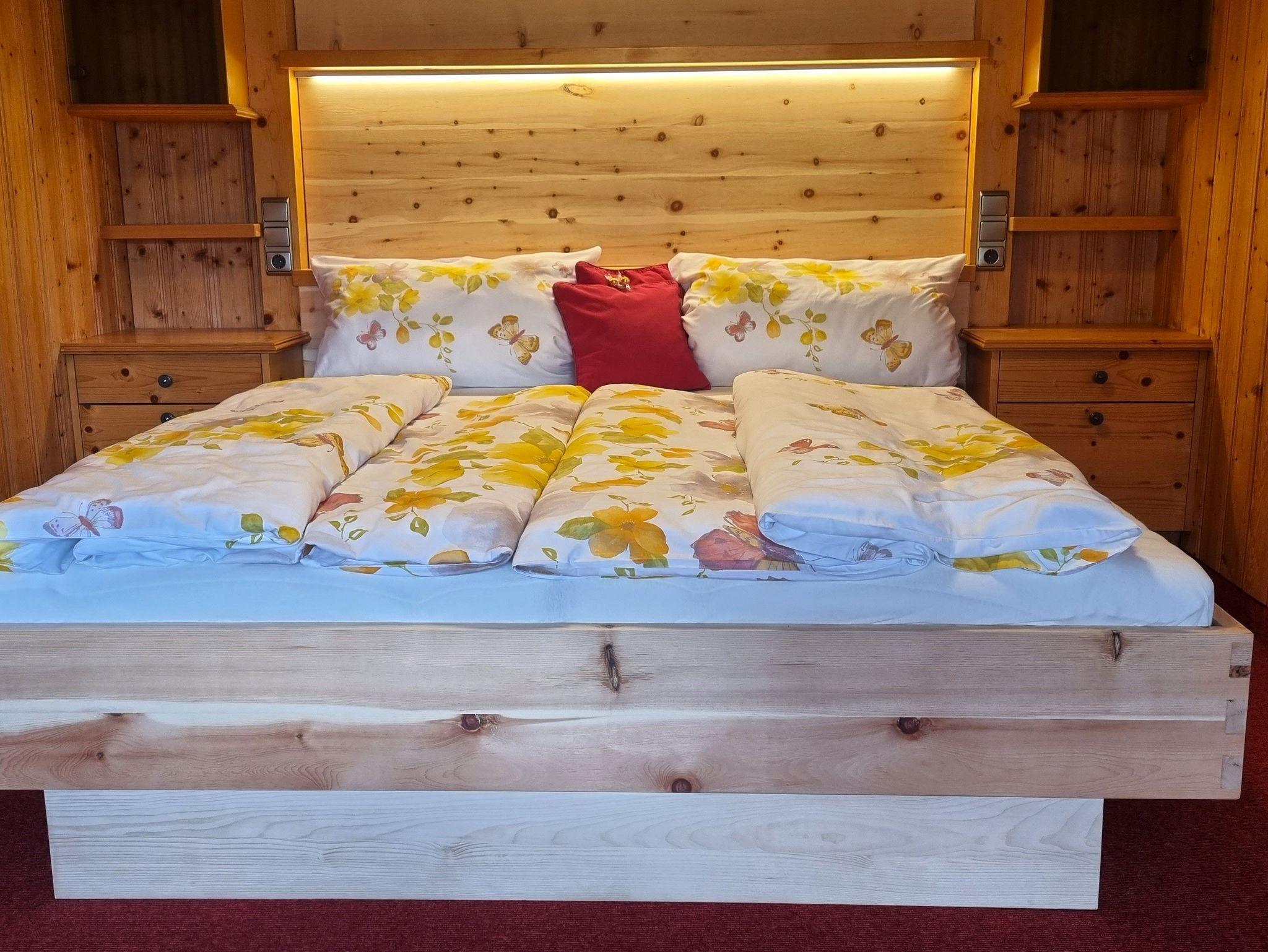 Im Erdgeschoss befindet sich eine kleine Tischlerei (Einmannbetrieb) sowie ein Schuh- bzw. Skiraum, der auch ideal zum Abstellen von Fahrrädern genutzt werden kann. Unsere beliebten Betten aus Zirbenholz, handgefertigt vom Hausherrn, sorgen für besonders erholsame Nächte und zusätzliche Entspannung.