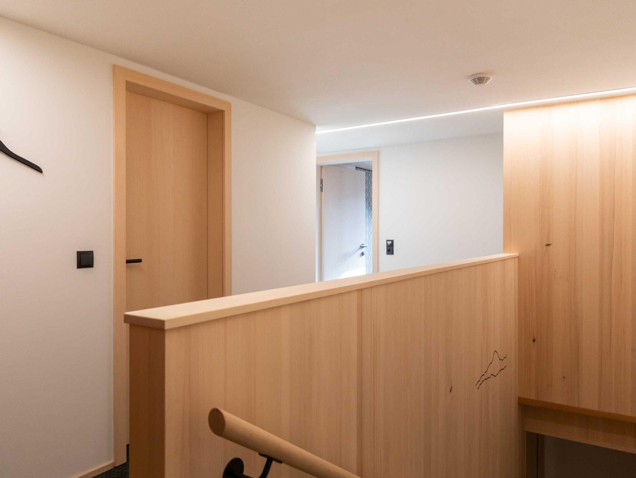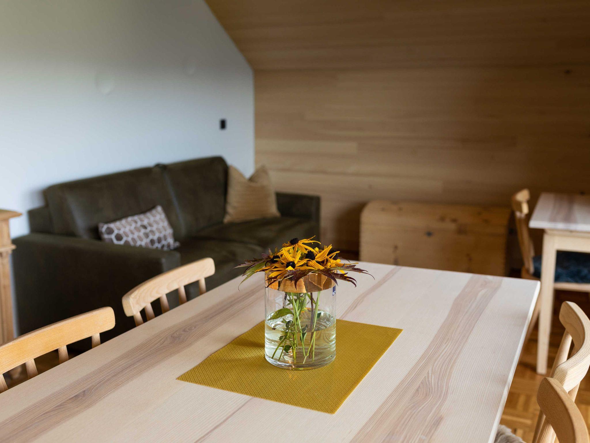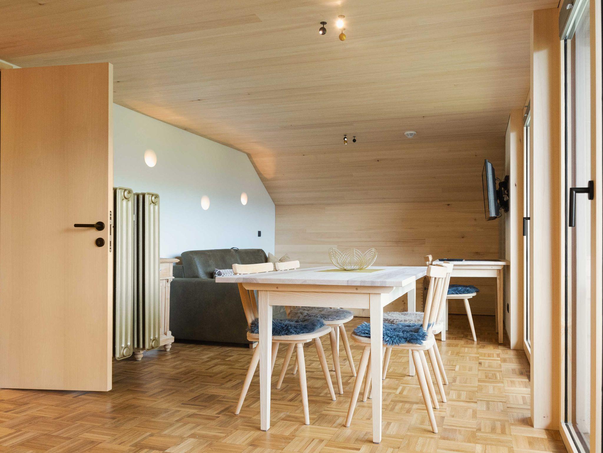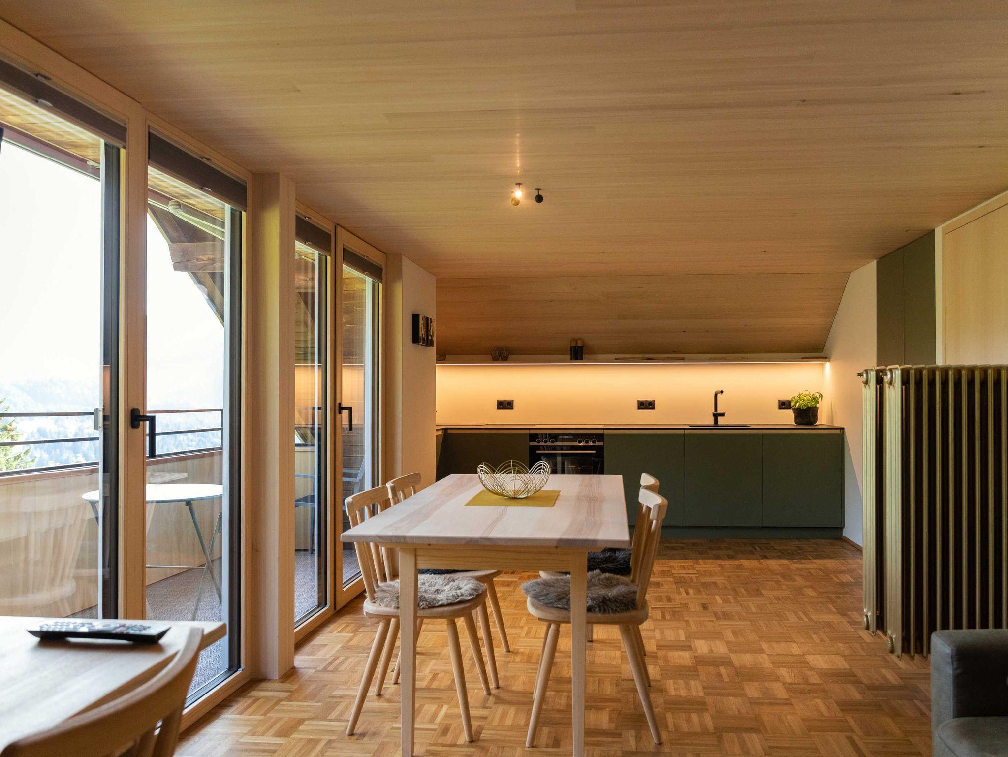 Die Ferienwohnung Ifen wurde 2021 vollständig renoviert und umgestaltet. Es steht nun ostseitig ein großzügiger Wohn-, Ess- und Schlafraum mit integrierter Küche und Balkon und ein Schlafzimmer zur Verfügung. Die Räume sind hochwertig mit heimischem Holz aus Weißtanne getäfert. Die Möbel und die Küche stammen vom Bregenzerwälder Tischlermeister. Die Planung und die Beleuchtung stammt von Georg Bechter Licht und Architektur aus Hittisau.