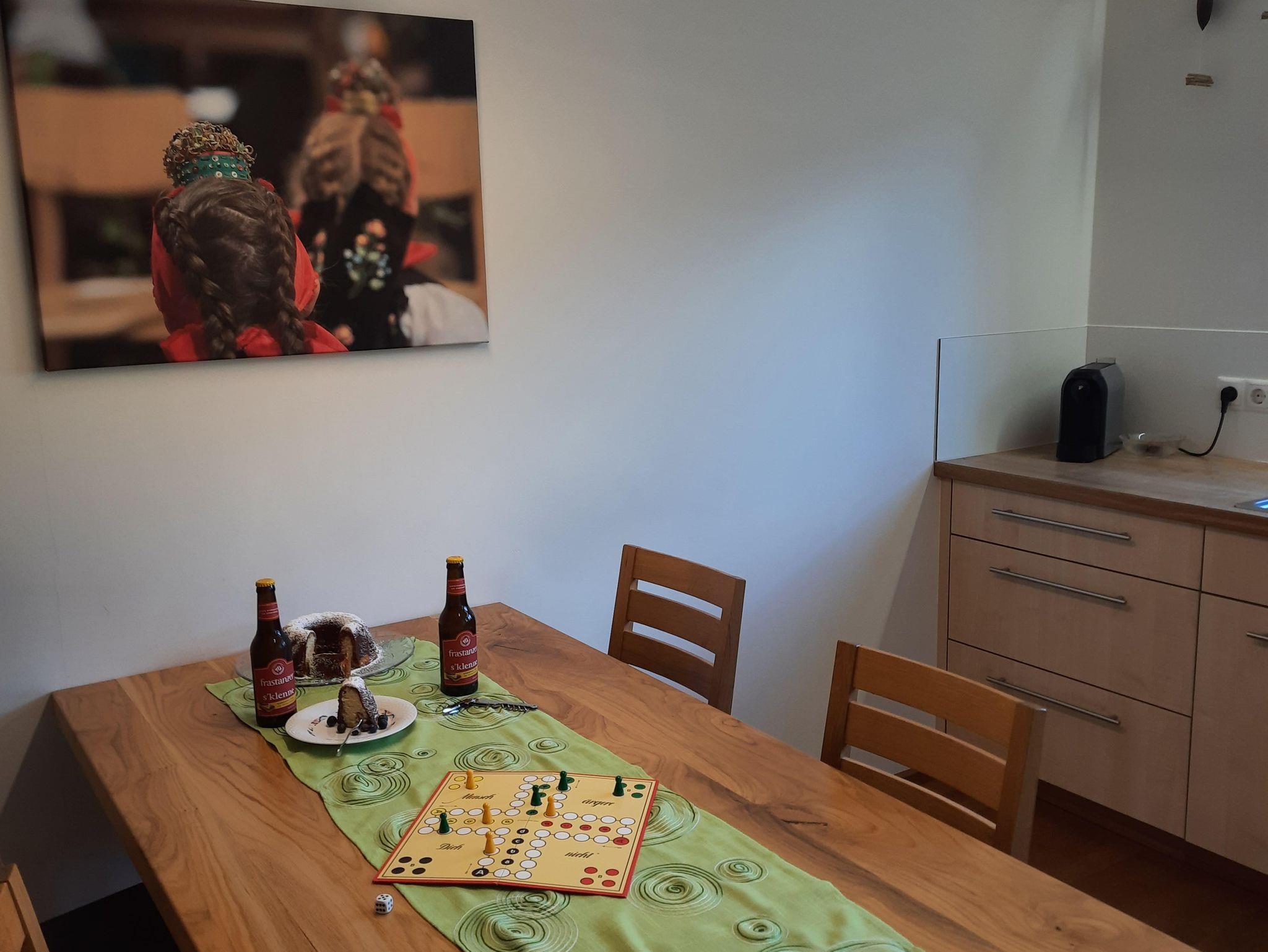 Unsere Ferienwohnung für 5 Personen auf 65 m², besteht aus 2 Schlafzimmern, separatem WC, Wohnküche mit Sat-TV und W-Lan. Die Küche ist mit einem E-Herd, Backofen, Geschirrspüler, Kapselkaffeemaschine, Wasserkocher sowie einem Toaster ausgestattet. Ein Haarfön, Bettwäsche, Geschirrtücher, Hand- und Duschtücher sind ebenfalls vorhanden. Unsere Fußbodenheizung sorgt für wohlige Wärme.