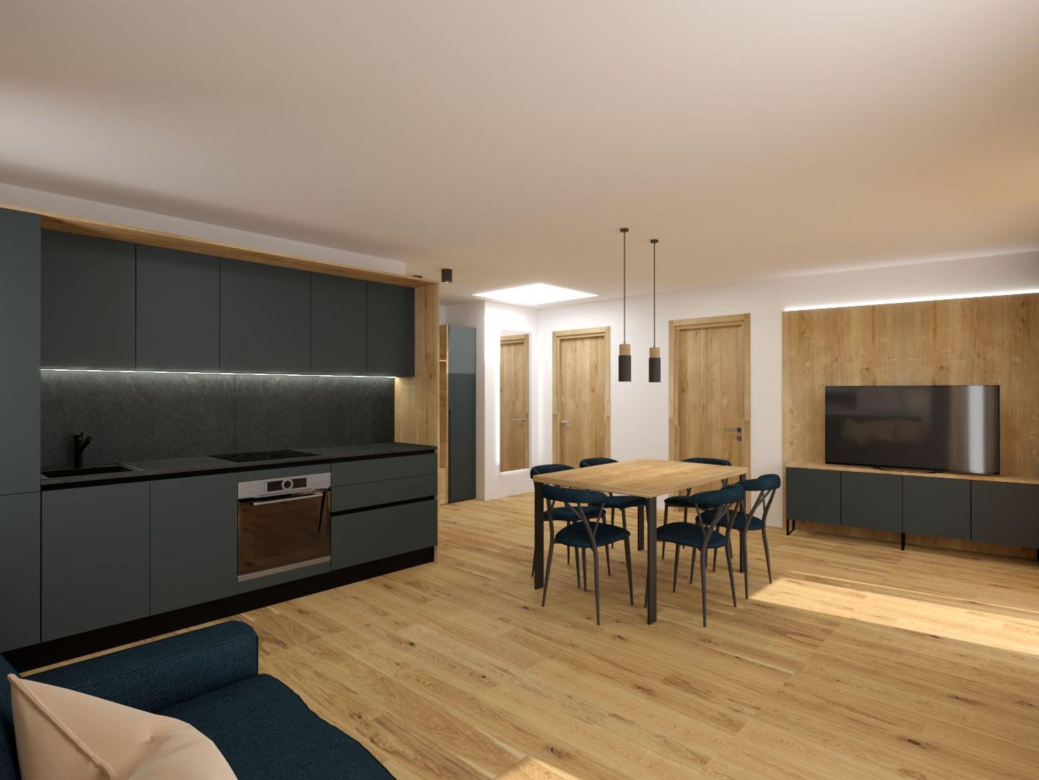 Das Apartement verfügt über einen großen Balkon, Wohnraum mit Ausziehsofa, Essecke und eine ausgestattete Küche, zwei geräumige Schlafzimmer und ein helles Bad.