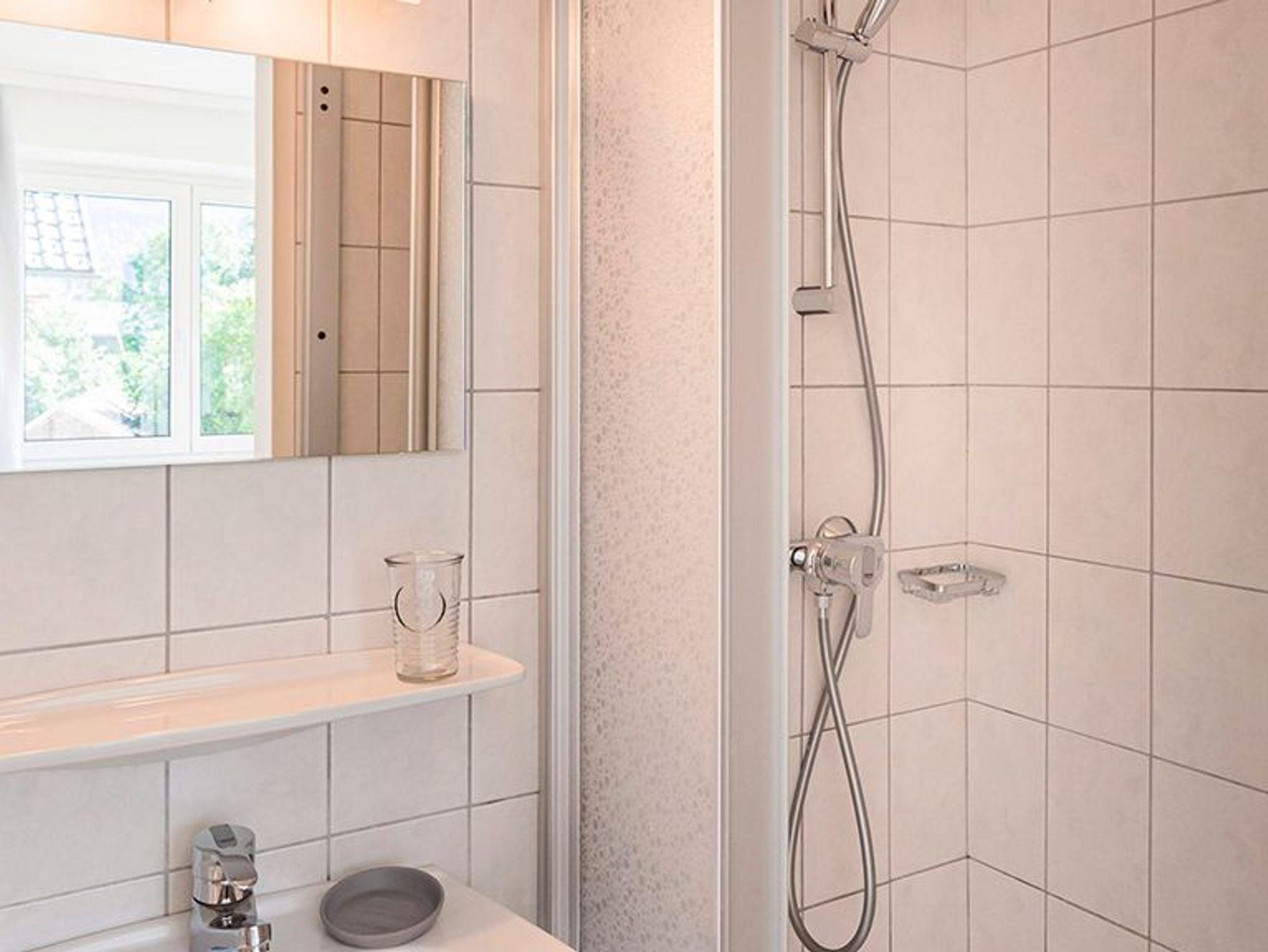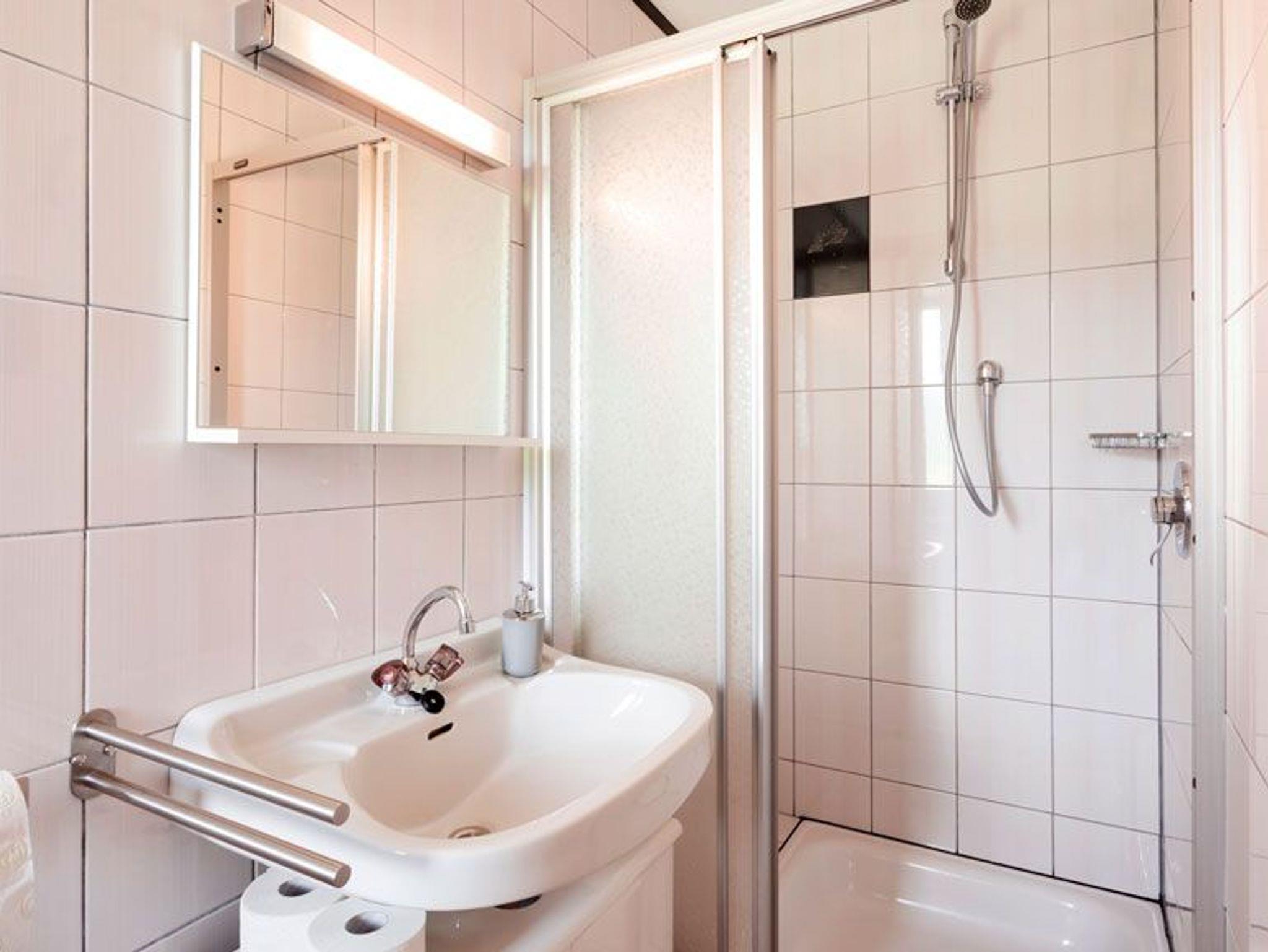 Kleines Badezimmer mit Milchglas-Schiebetür vom Raum getrennt
