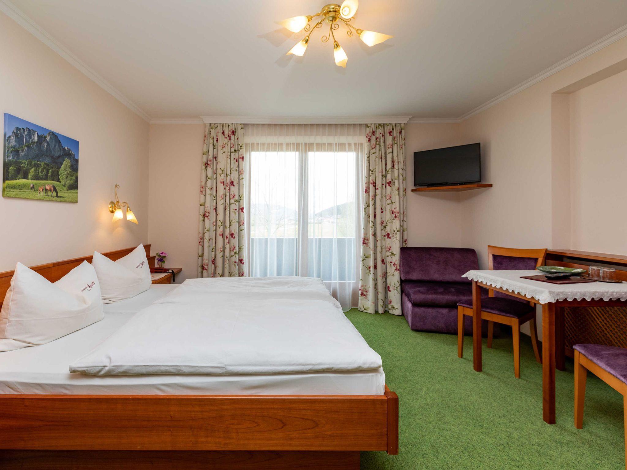 Unsere Doppelzimmer sind im ersten Stock unseres Hauses. Der Blick richtet sich auf eine herrliche Berglandschaft und in die großzügige Gartenanlage mit neuem beheiztem Pool. Die Zimmer sind gemütlich eingerichtet. Einen schönen Balkon hat jedes Zimmer. Ein Gästekühlschrank ist am Gang.
