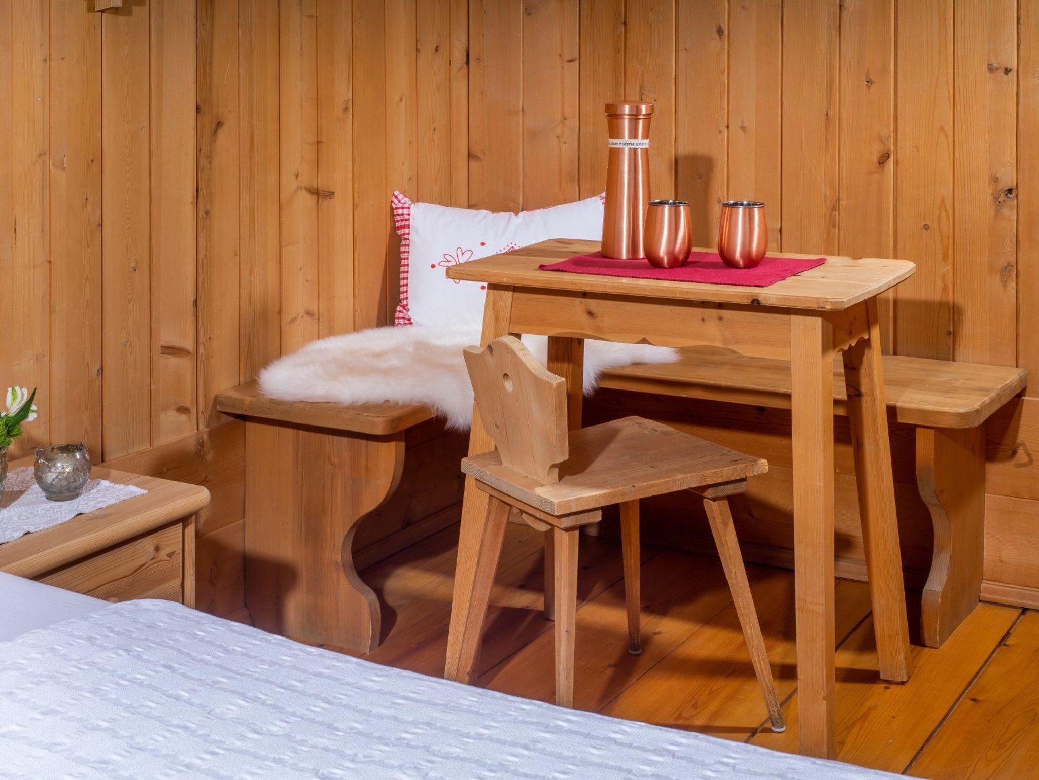 Knarrendes Holz. Natürliche, ausgewählte Materialien aus der Region. Der intensive Duft von Zirbe.