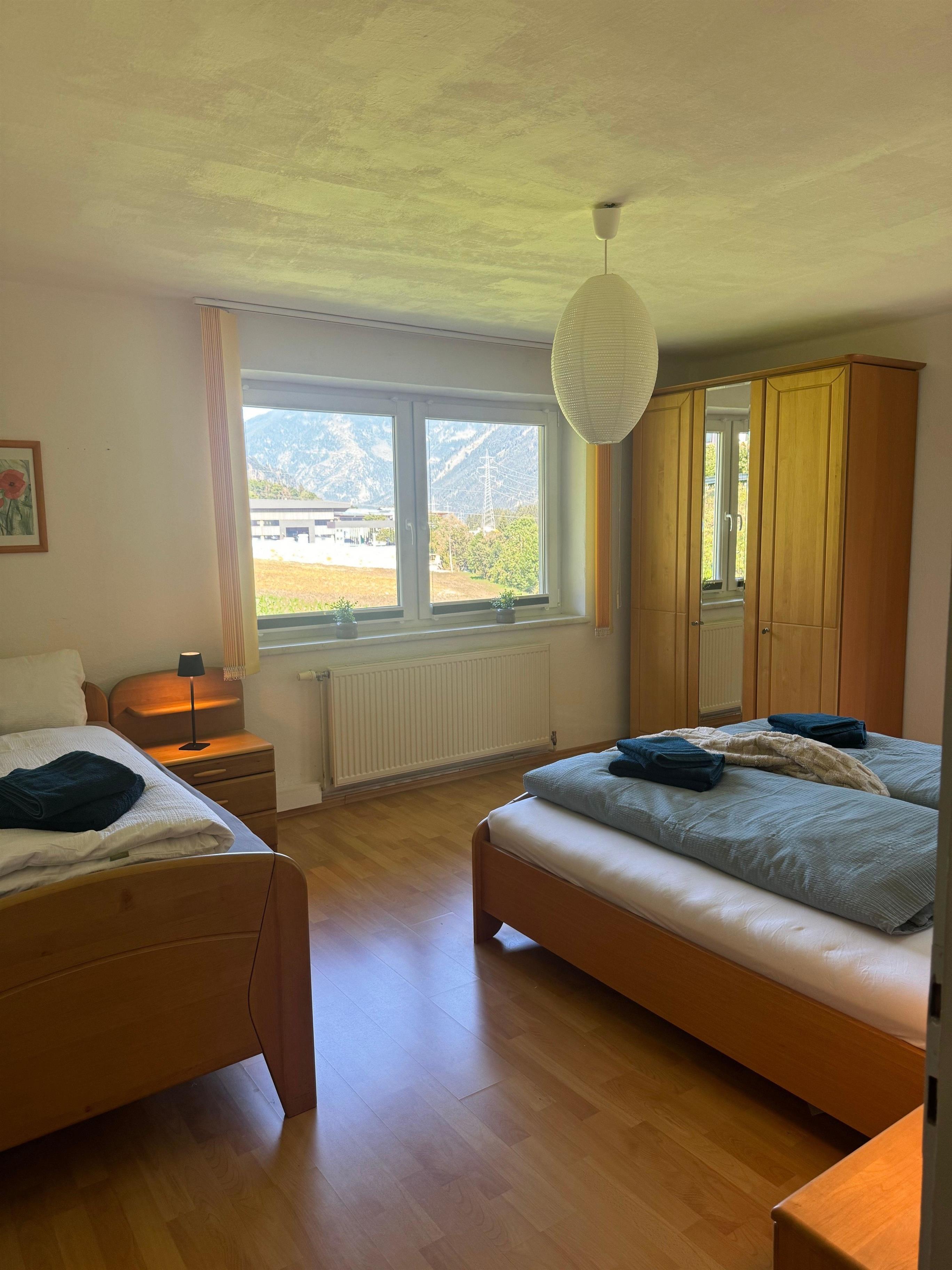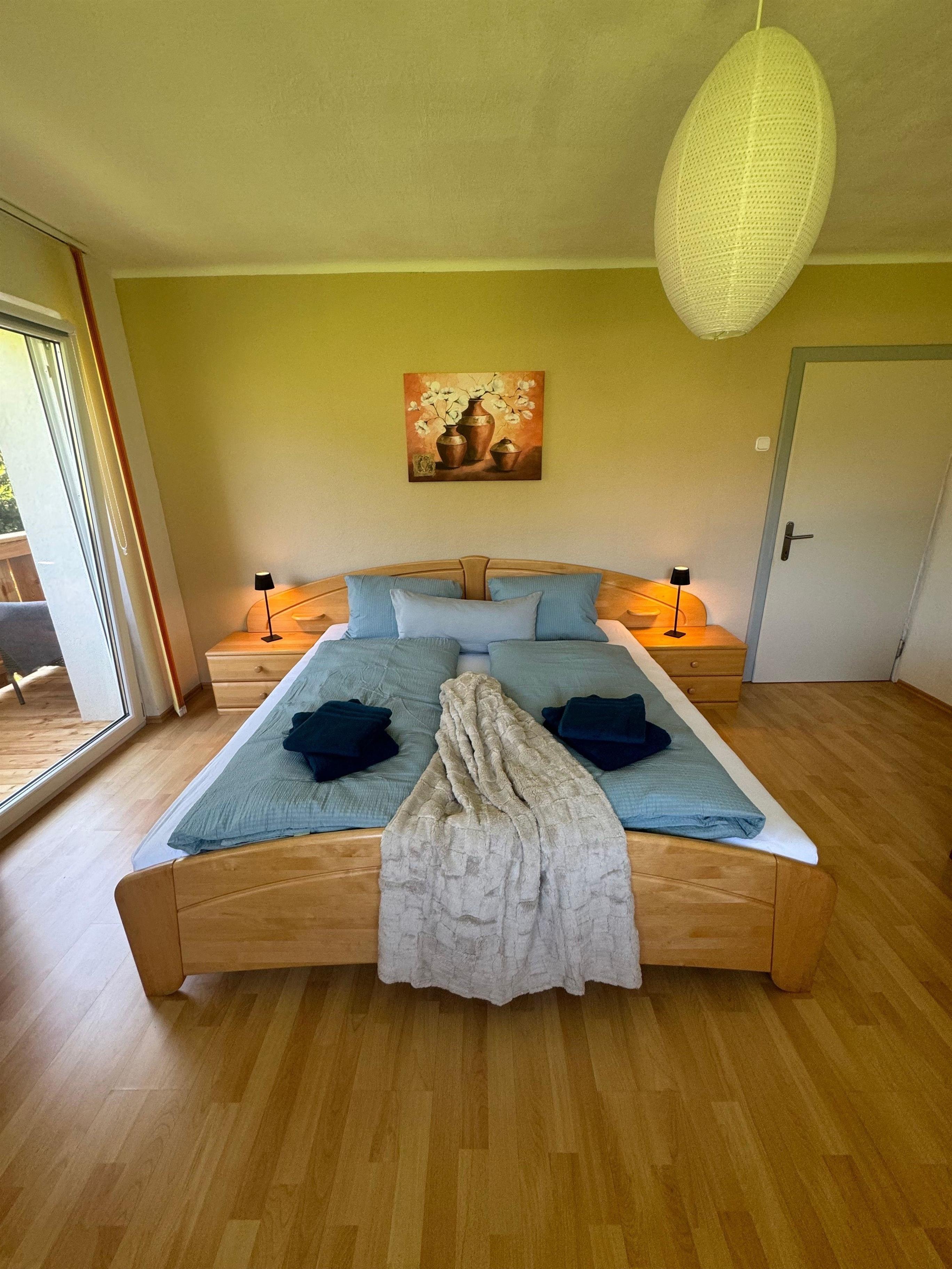 Die modern eingerichtete Ferienwohnung verfügt über ein Schlafzimmer mit 3 Betten (Doppelbett und Einzelbett) und ein Schlafzimmer mit einem Boxspringbett und einem Kinderbett.