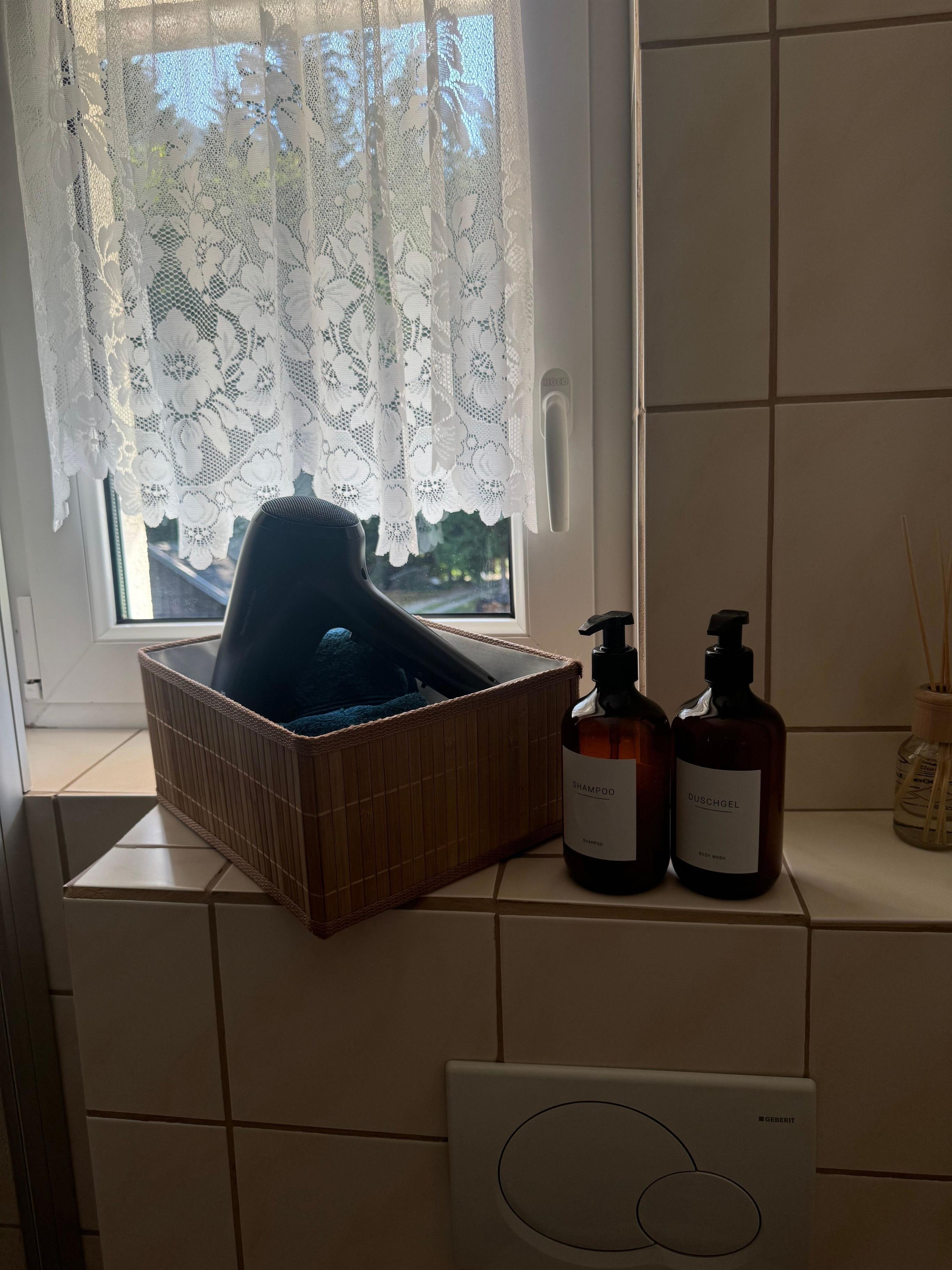 Freuen Sie sich über ein Badezimmer mit Dusche, Waschbecken und WC.