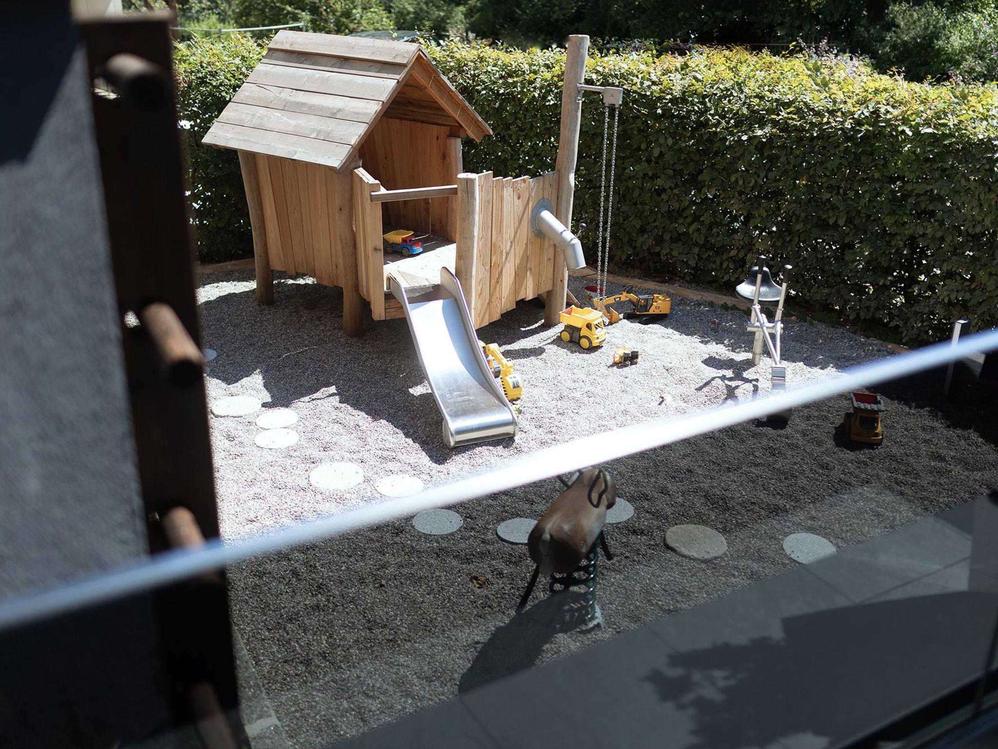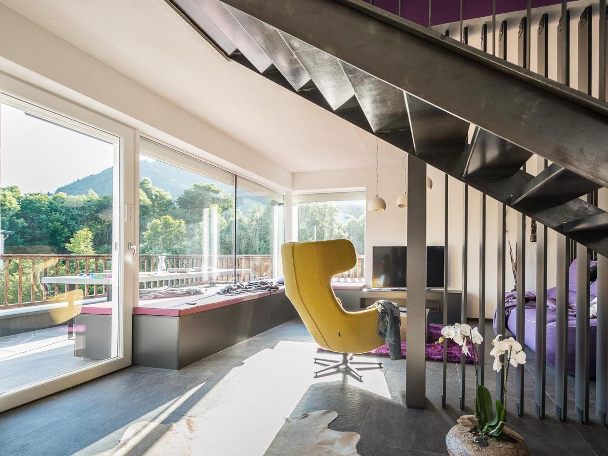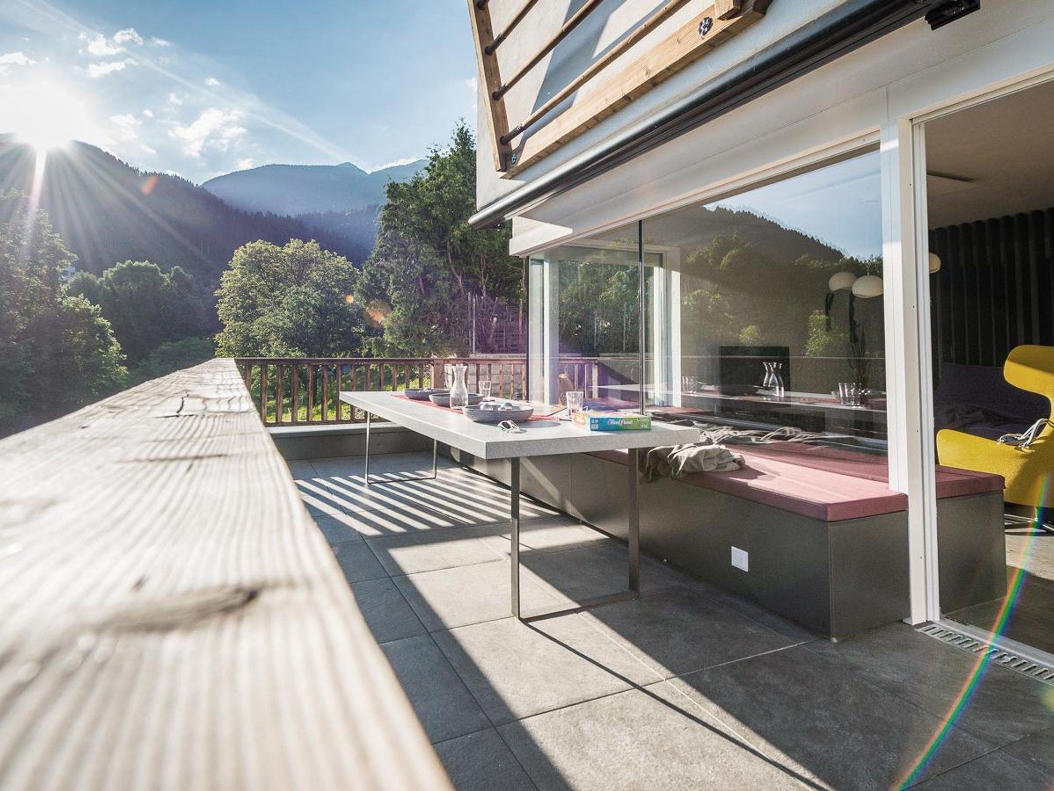 Das Erdgeschoss des Ferienhauses Schiefer ist sehr offen gestaltet. Die große Fensterfront Richtung Westen bietet einen wunderbaren Blick auf die Bergkulisse, die man auf der Terrasse gemeinsam mit dem Rauschen des Wildbachs genießen kann. Auf der selben Terrasse wartet ein Holzkohle-Griller auf seinen Einsatz.
