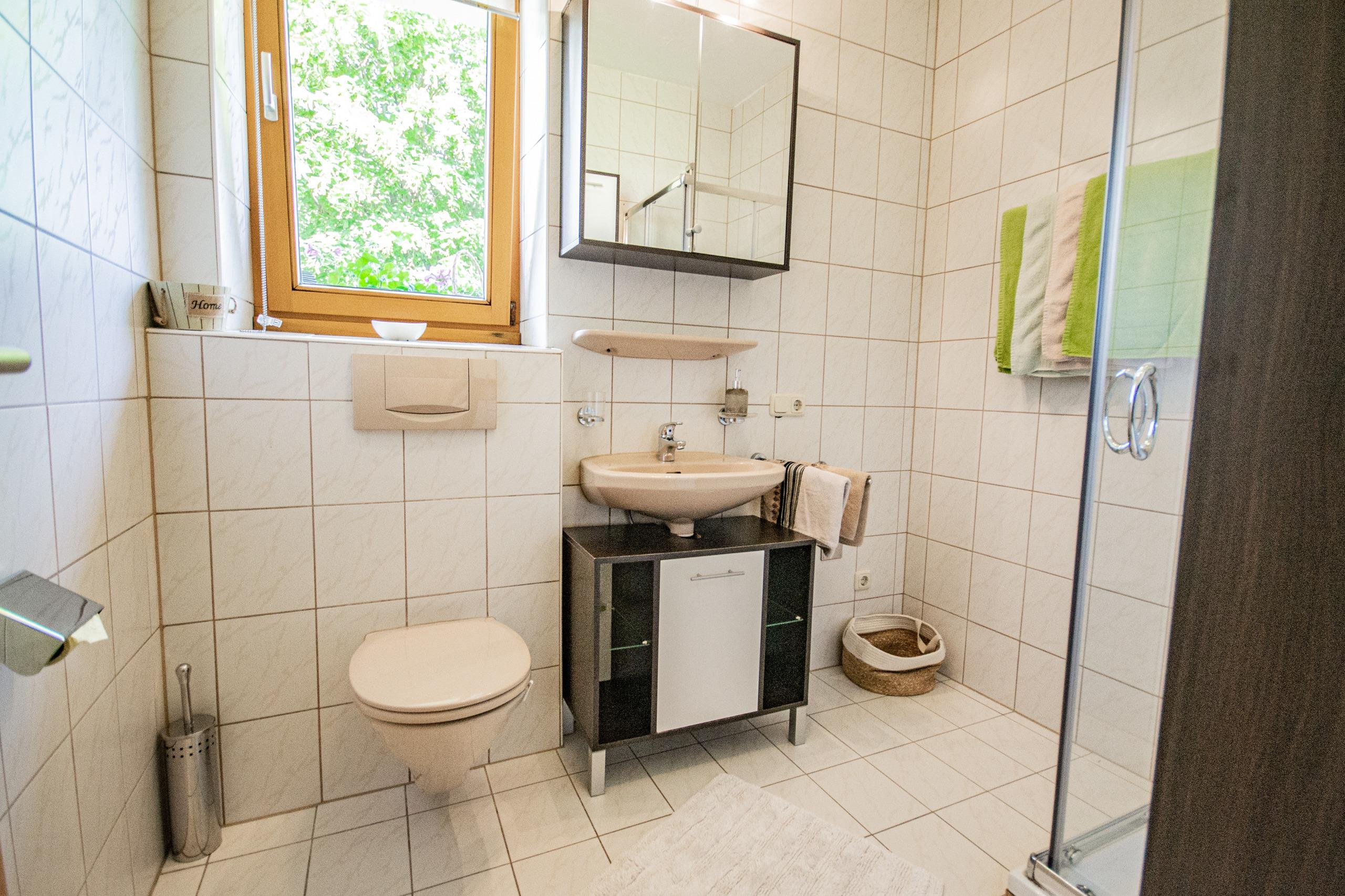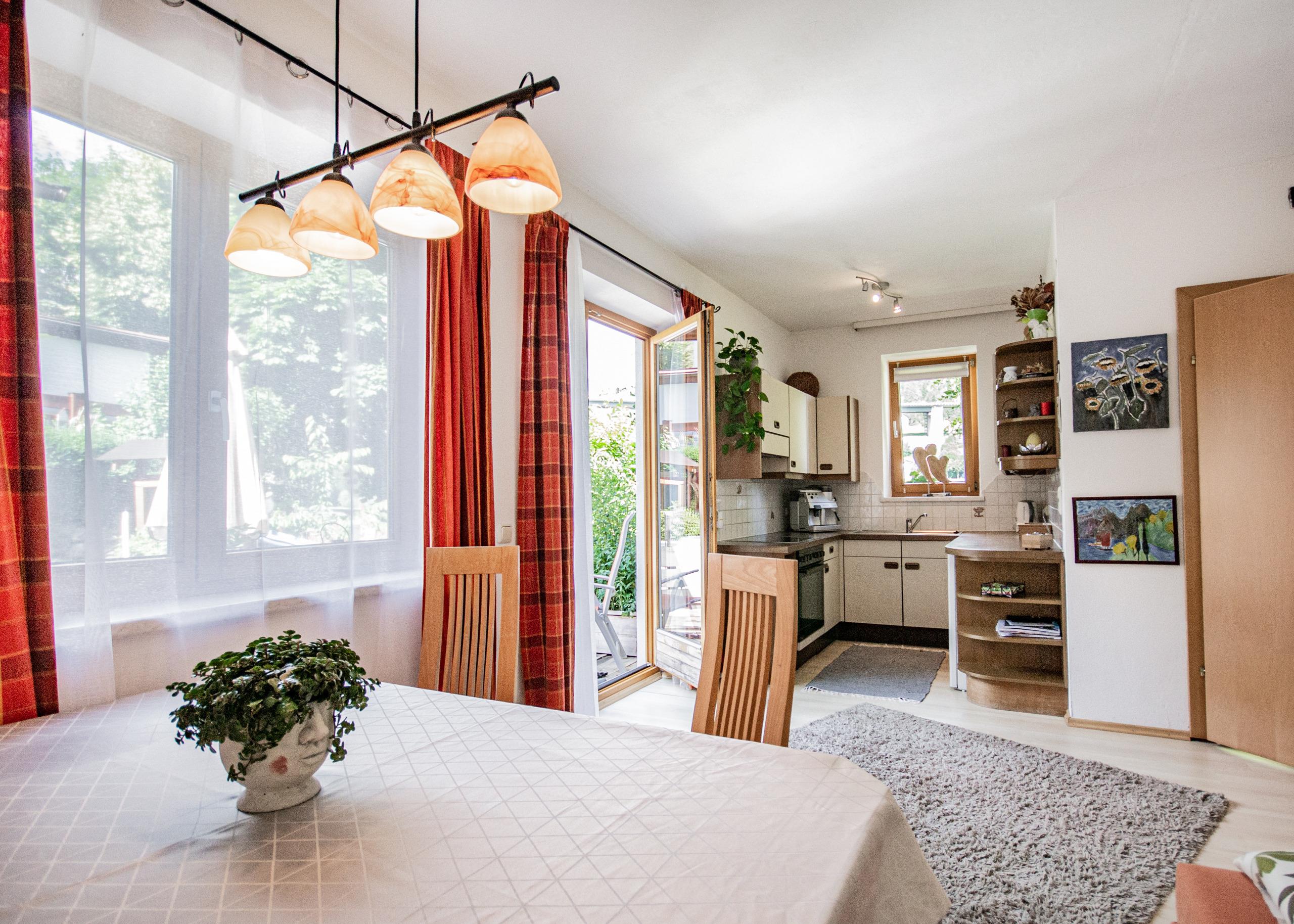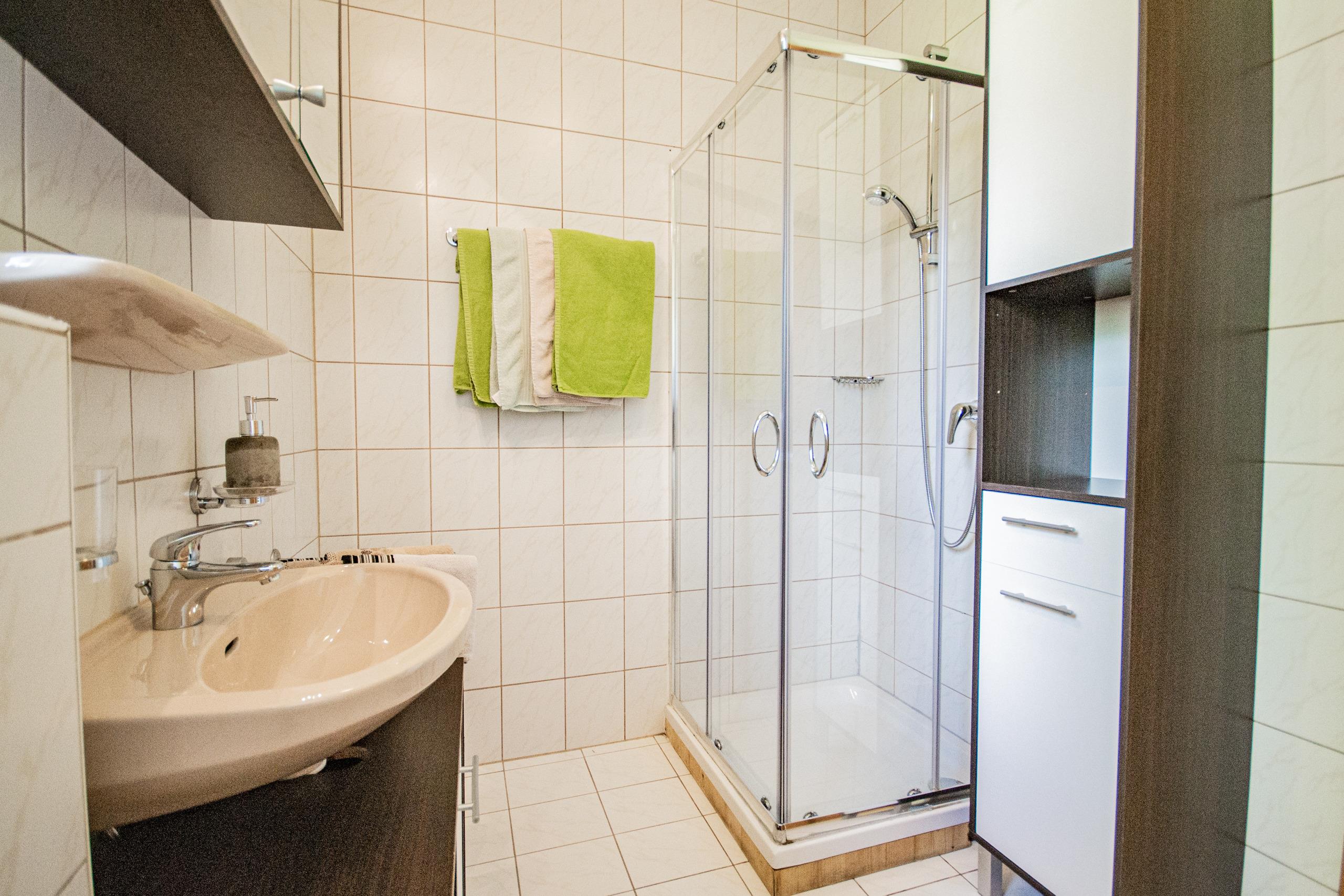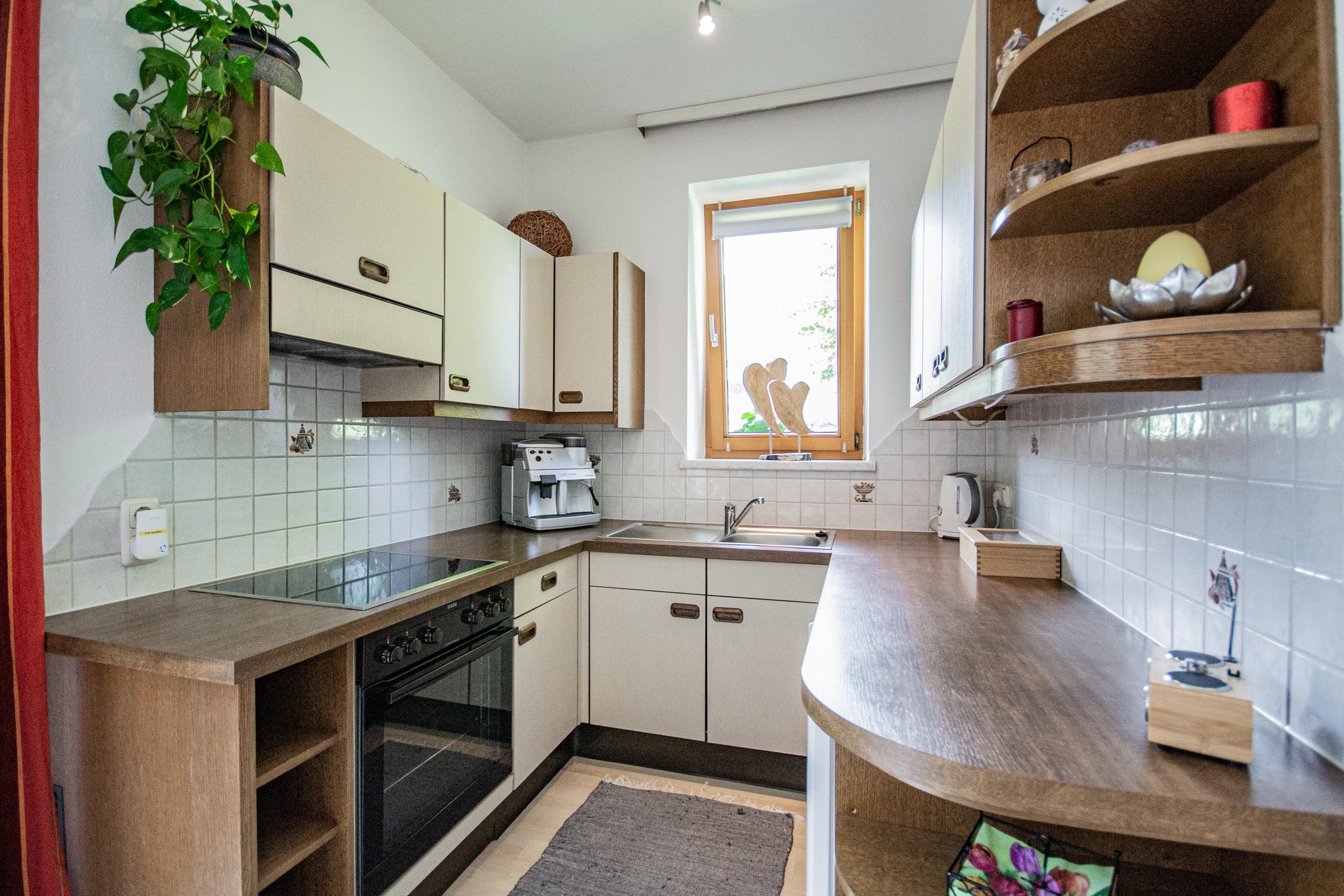 Moderne Ferienwohnung mit der Gelegenheit zur Selbstverpflegung, Küche und Duschbad.