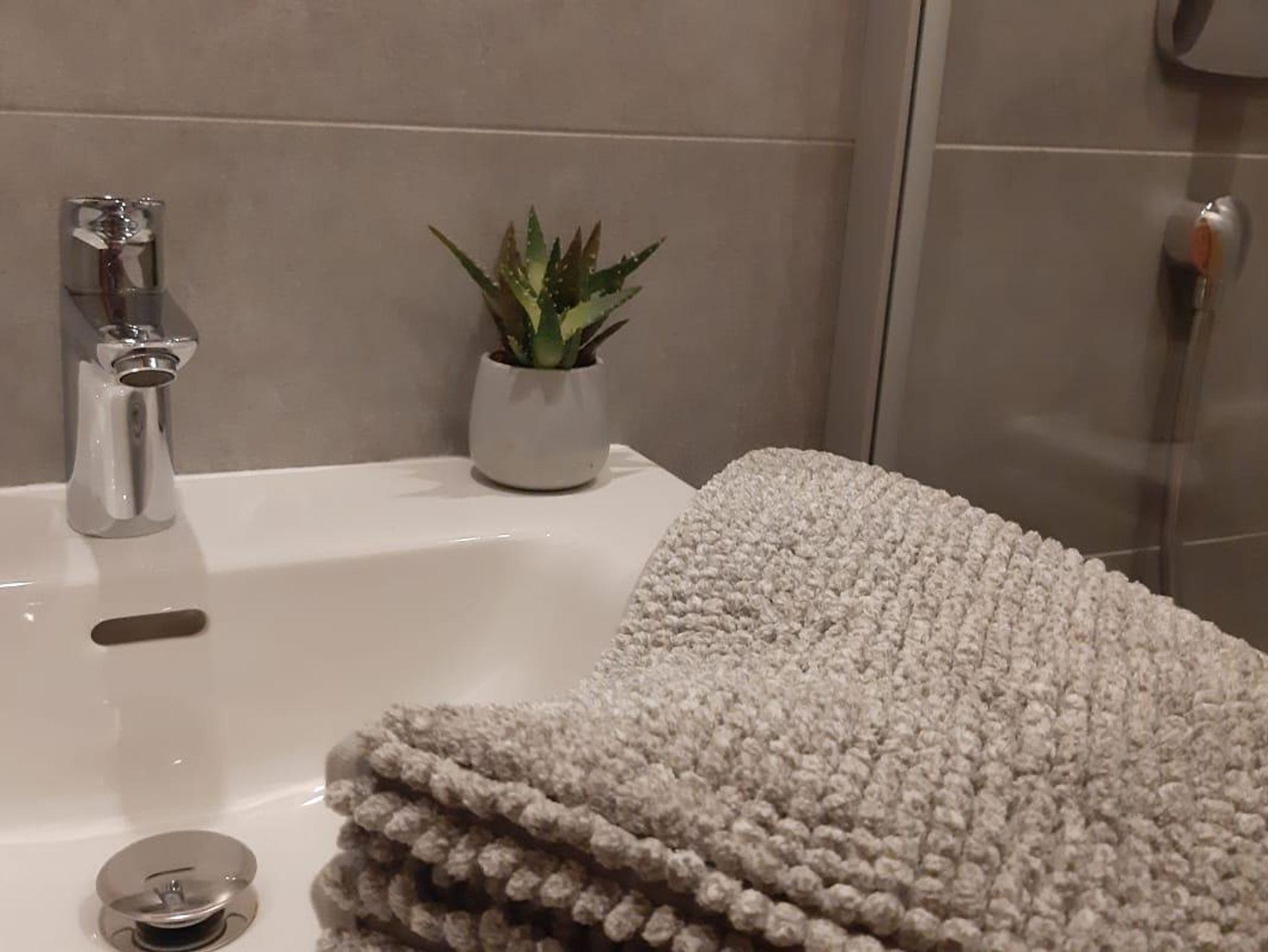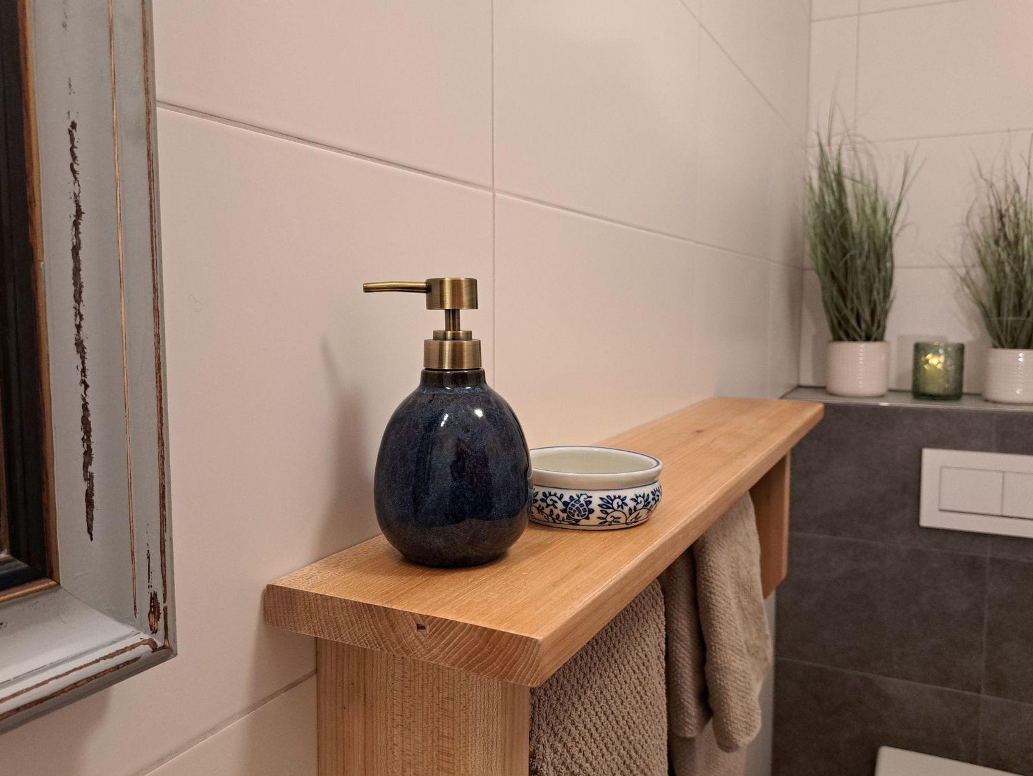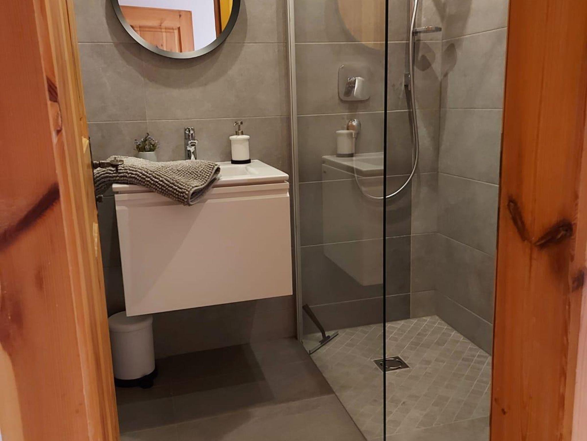 Nebenan geht es ins neue Badezimmer mit großer Dusche und WC.