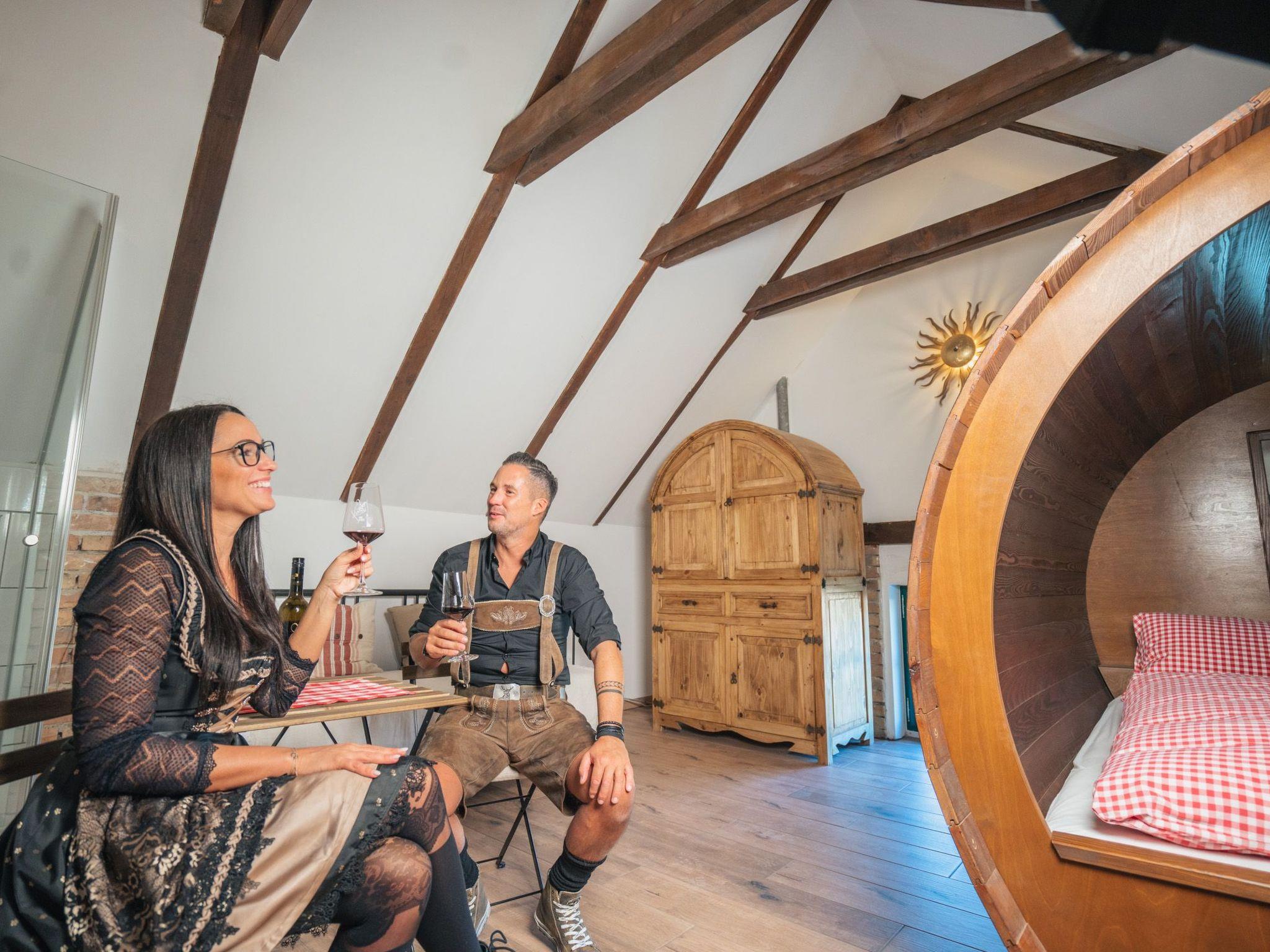 You will be sleeping in a 9000-litre wine barrel, with all the comfort you are accustomed to. The wine barrel suite has a wellness shower, a WC, seating, a fully-equipped kitchen for shared use. It doesn’t get cosier or more romantic than this. The adjoining room with a connecting door has a further bedroom with a comfortable bed, wellness shower, WC and generous seating. This is suitable either for children or a second couple.