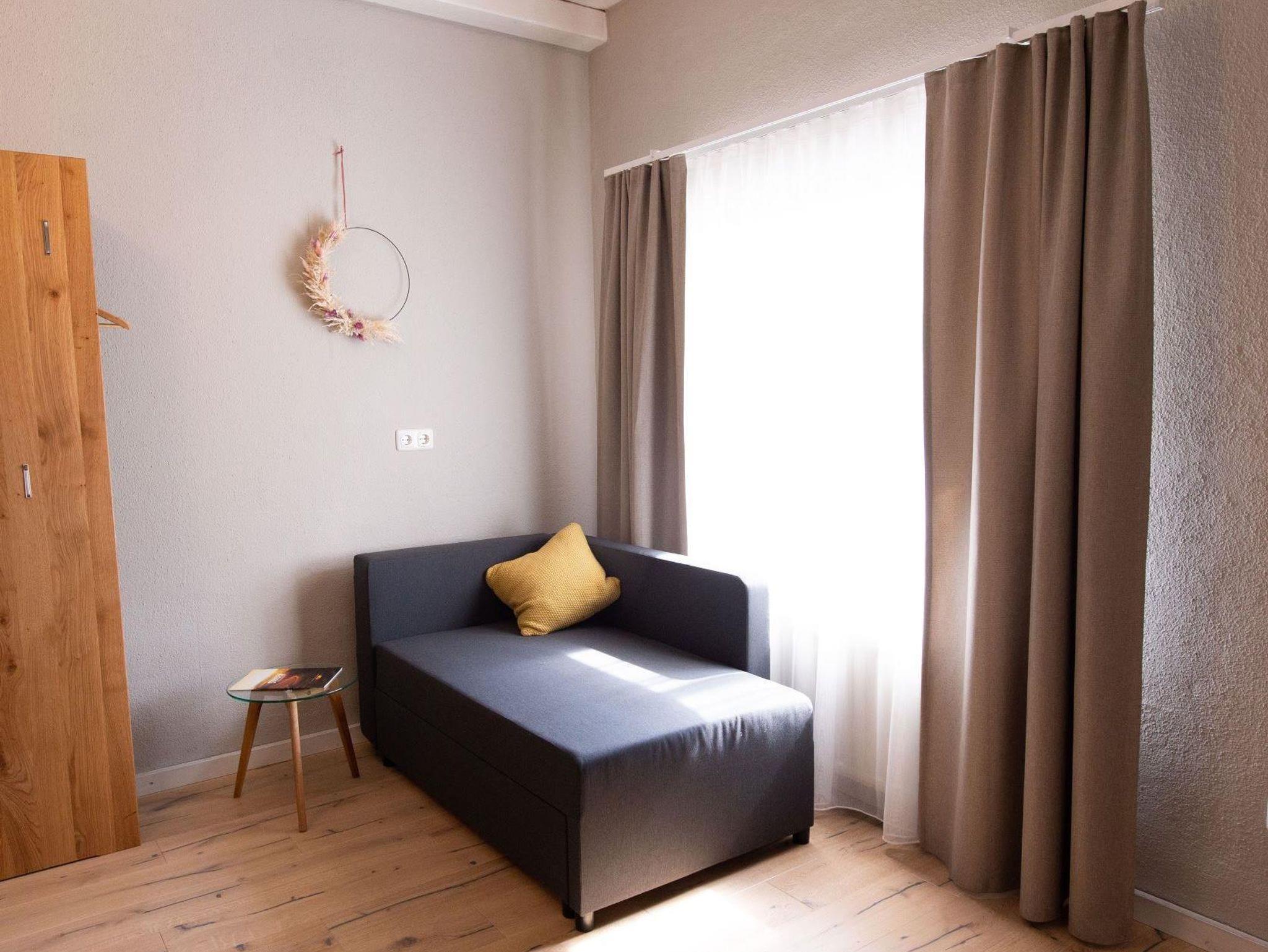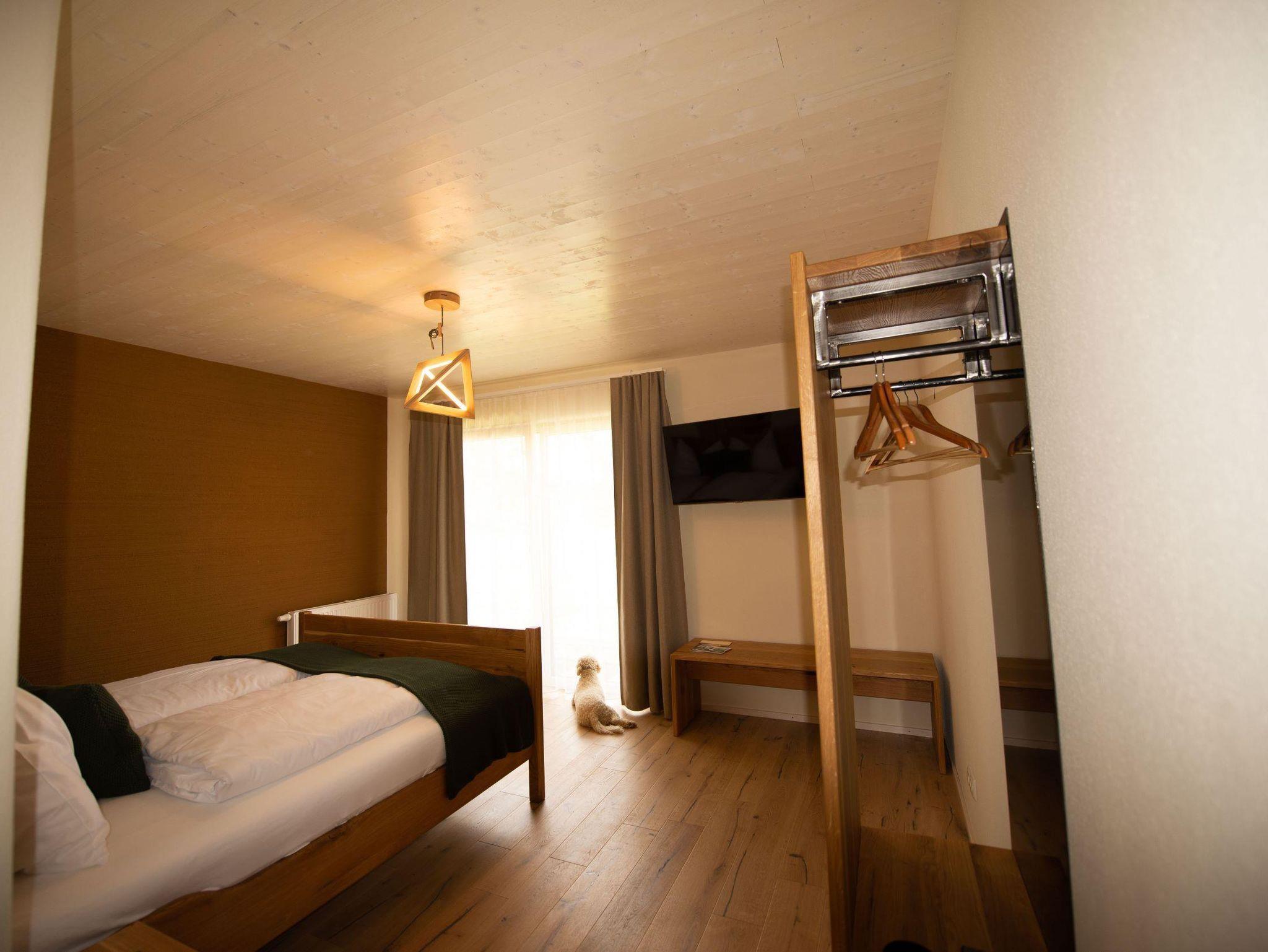 Zusätzlich verfügt das Zimmer über eine eigene Terrasse, auf der Gäste die Natur genießen können. Dort finden sich Sitzmöglichkeiten sowie eine bequeme Liege mit einem Tisch, perfekt für entspannte Momente im Freien. Im Zimmer selbst gibt es zudem einen Fernseher und WLAN-Zugang, um den Gästen Komfort und Unterhaltung zu bieten.