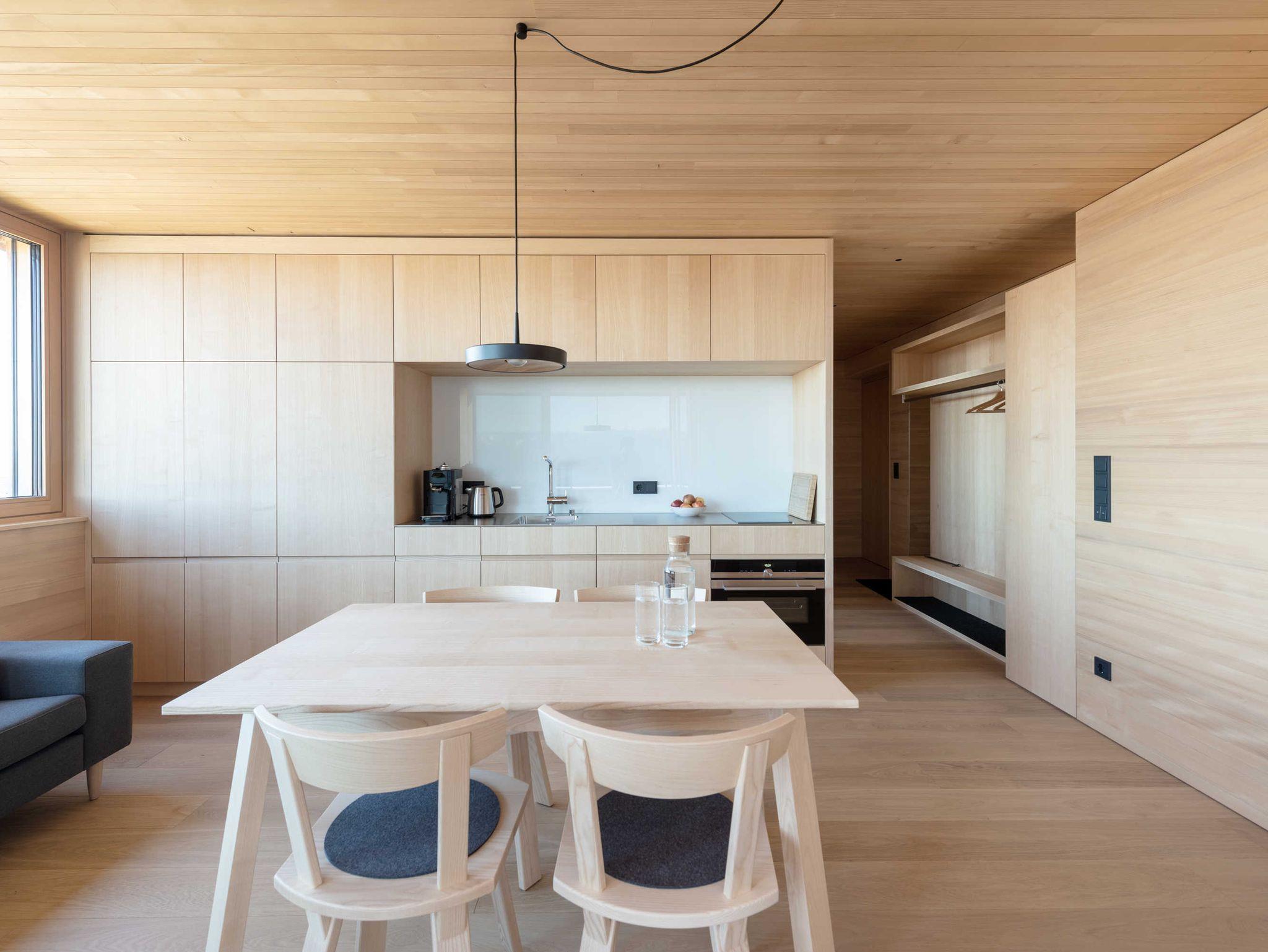 2 Schlafzimmer mit je einem Doppelbett (180x200cm) und Kleiderschrank, Wohn-/Esszimmer mit voll ausgestatteter Küche, gemütlichem Essbereich und einer bequemen Couch. Ein fugenloses Bad mit Dusche und WC. Garderobe. Das Herzstück ist der Wohn-/Essraum und der überdachte Balkon im Ur-Bregenzerwälder Stil {auch ‚Schopf‘ genannt}, der mit Panoramablick über die Bregenzerwälder, Schweizer und Allgäuer Berge zum Verweilen einlädt. Besondere und warme Atmosphäre durch gebürsteten Eichenboden, heimische Weisstannenwände und spezielles Lichtdesign.