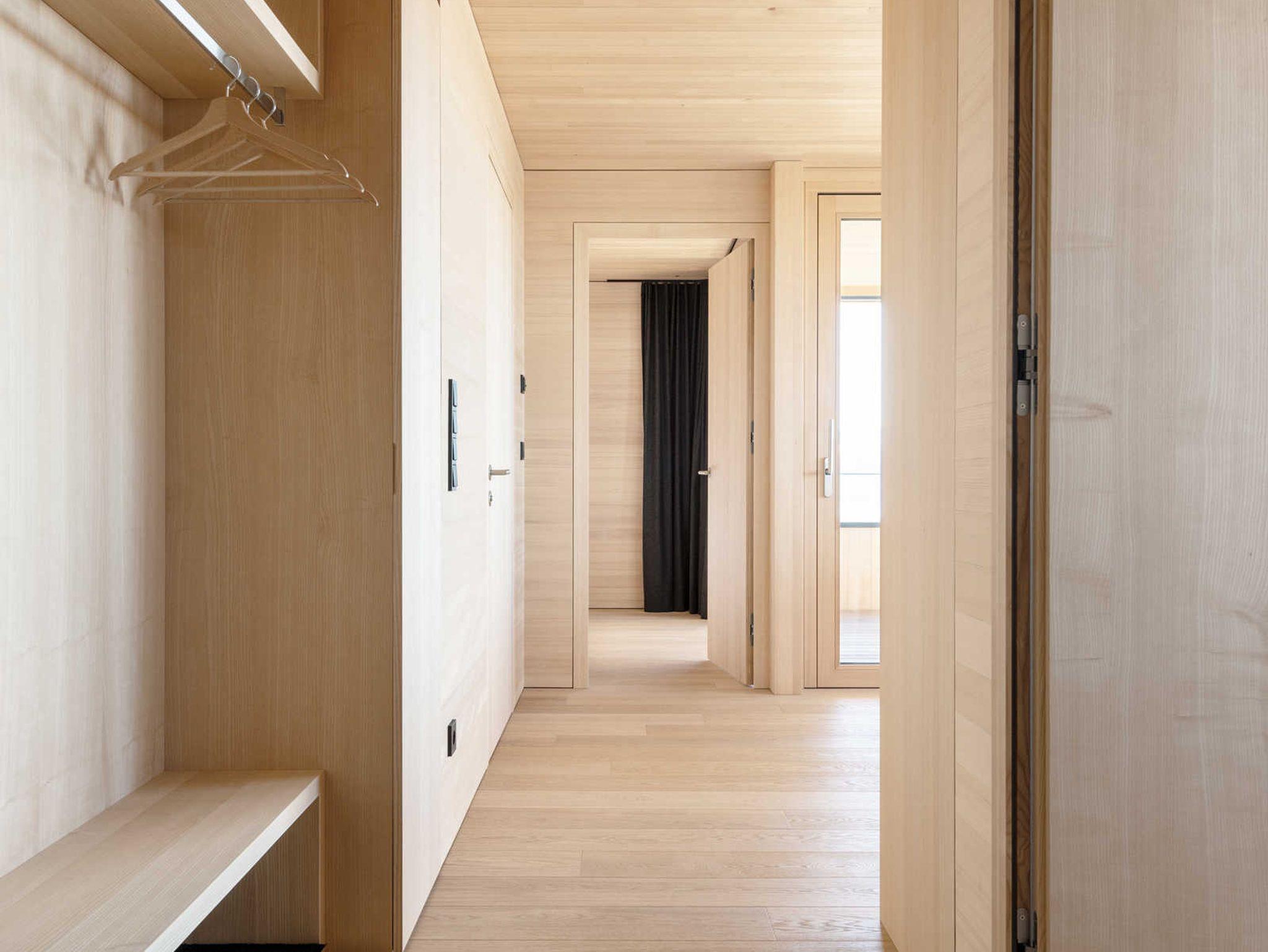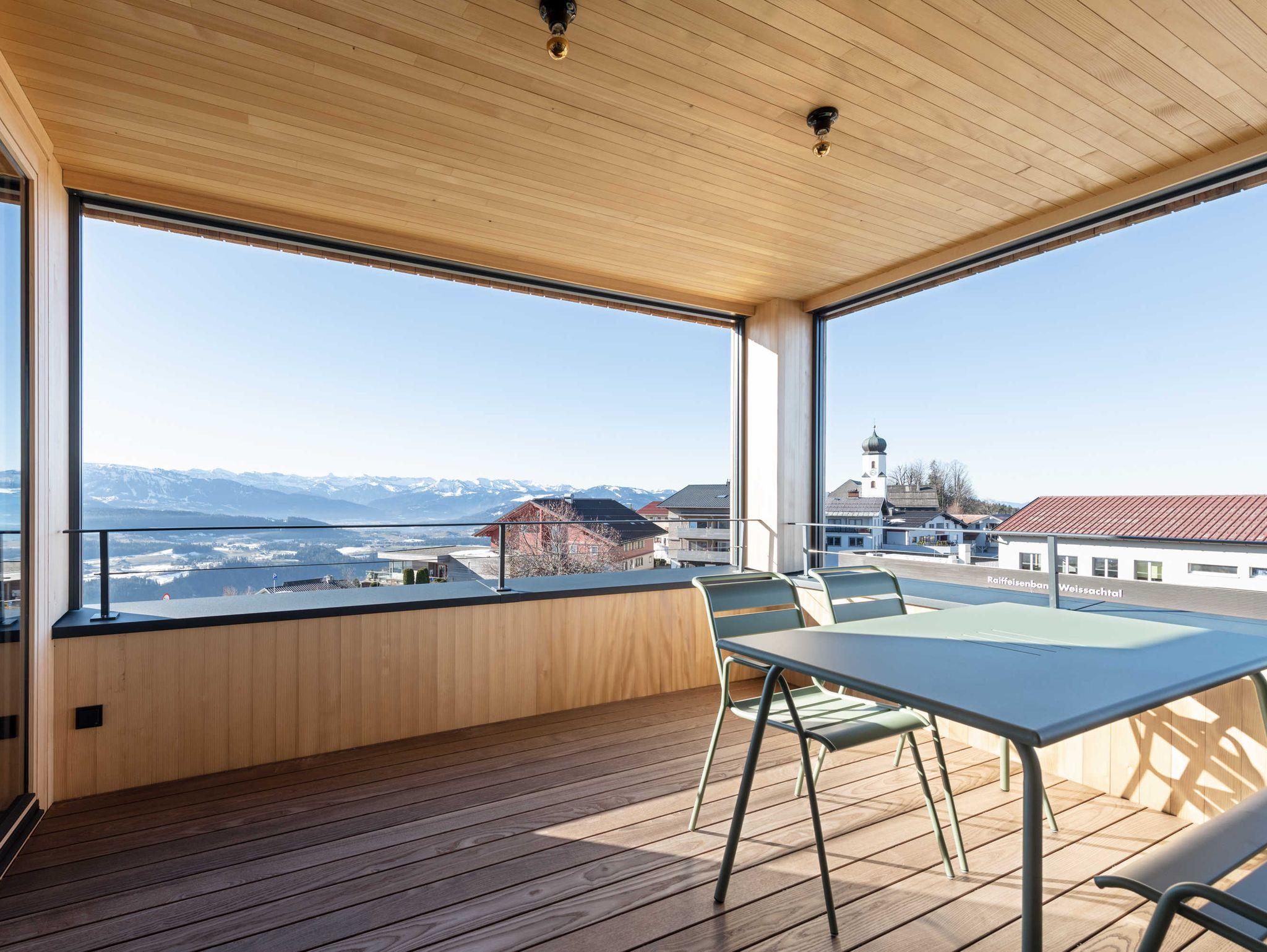 2 Schlafzimmer mit je einem Doppelbett (180x200cm) und Kleiderschrank, Wohn-/Esszimmer mit voll ausgestatteter Küche, gemütlichem Essbereich und einer bequemen Couch. Ein fugenloses Bad mit Dusche und WC. Garderobe. Das Herzstück ist der Wohn-/Essraum und der überdachte Balkon im Ur-Bregenzerwälder Stil {auch ‚Schopf‘ genannt}, der mit Panoramablick über die Bregenzerwälder, Schweizer und Allgäuer Berge zum Verweilen einlädt. Besondere und warme Atmosphäre durch gebürsteten Eichenboden, heimische Weisstannenwände und spezielles Lichtdesign.