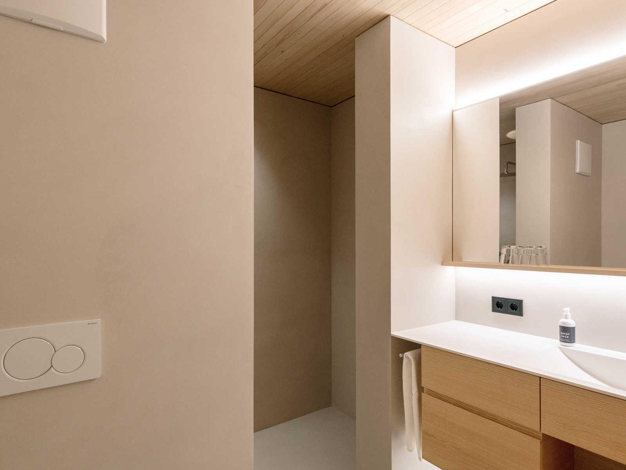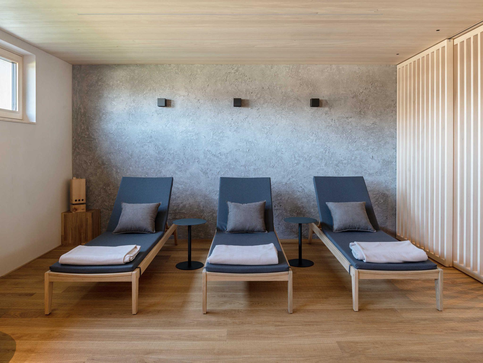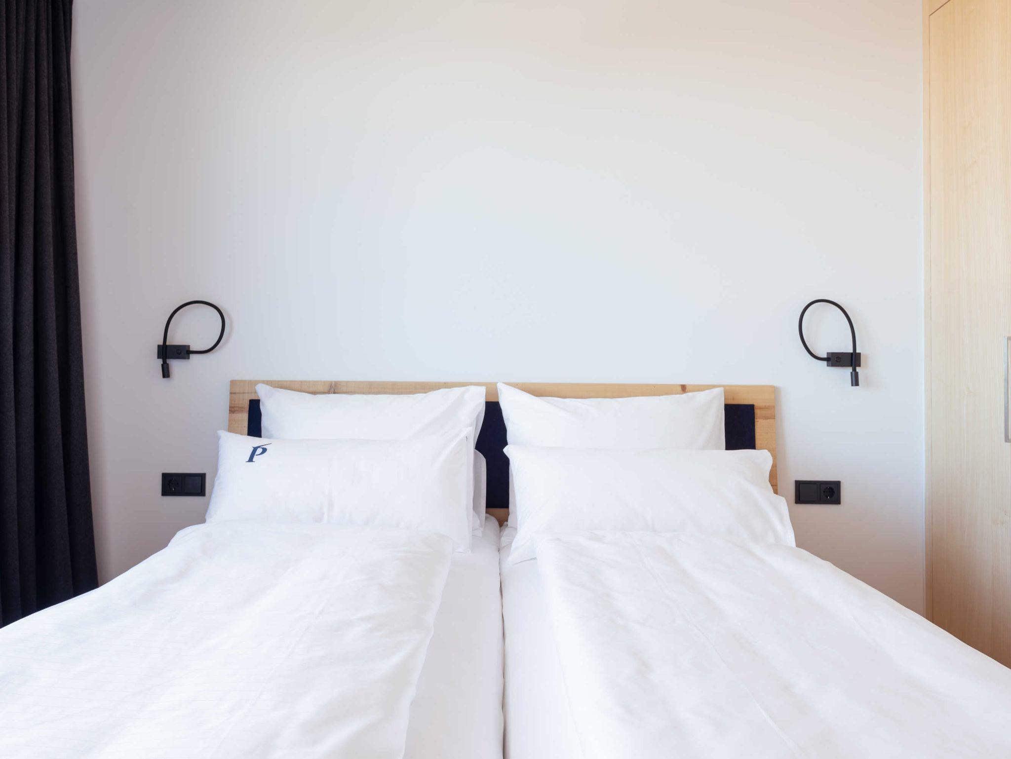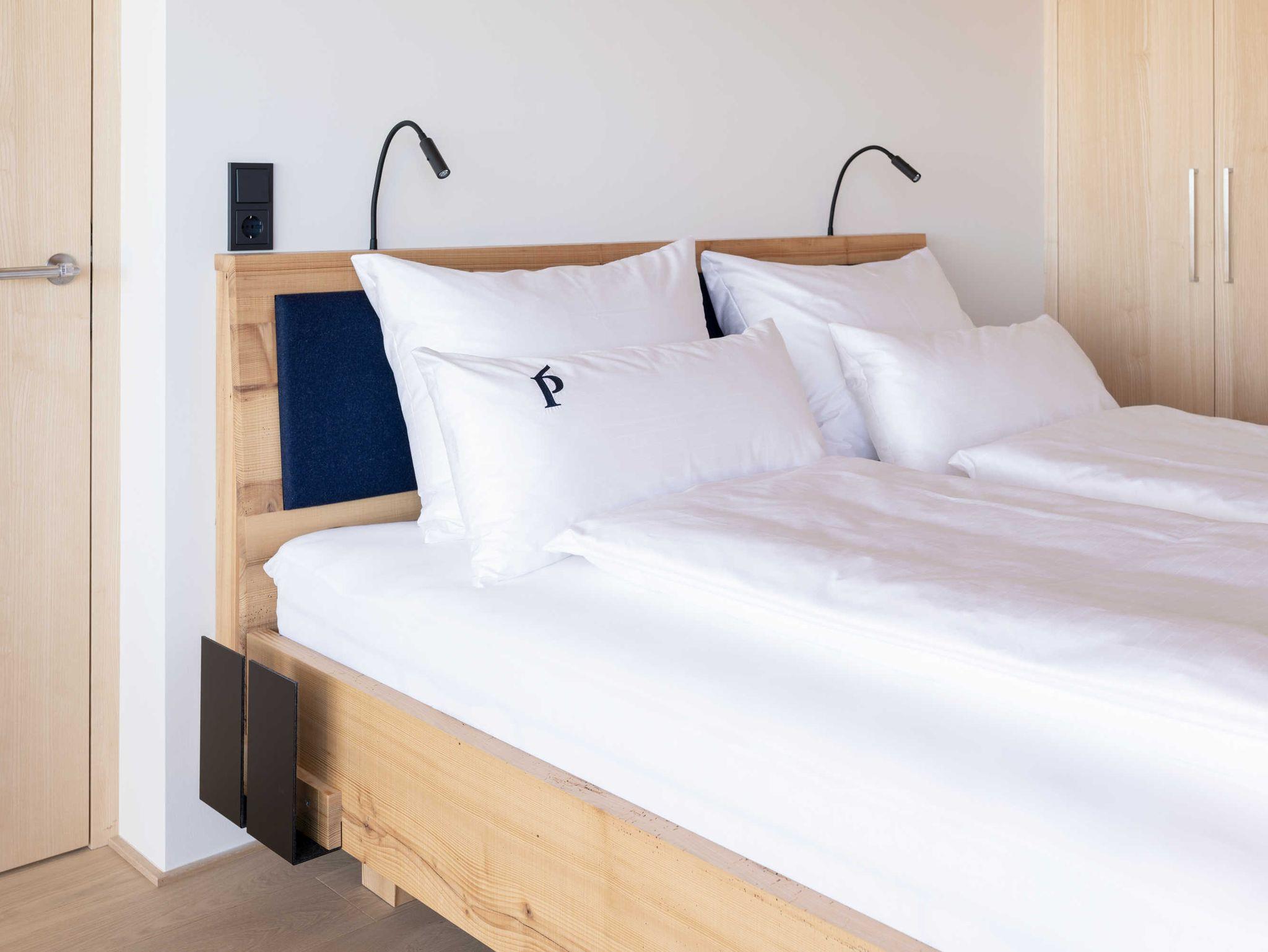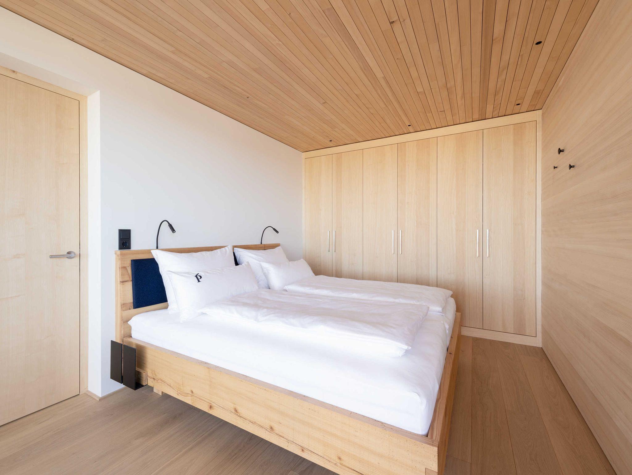 Bregenzerwälder Architektur und Handwerk gepaart mit modernen Designklassikern. Holzbalken von Poldi‘s altem Haus neuverarbeitet zu zeitlosen Betten. Besondere und warme Atmosphäre durch gebürsteten Eichenboden, heimische Weisstannenwände und spezielles Lichtdesign.
