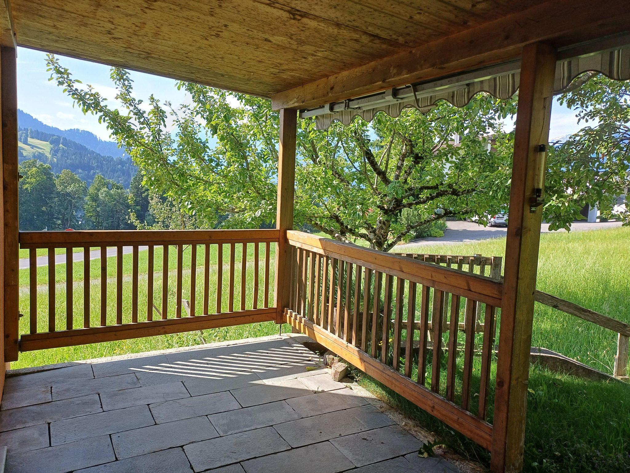 Die schattige, überdachte Terrasse liegt im Süd-Westen und bietet ab Mittag über den NM bis hin zum Abend Sonne. Ausgestattet mit Markise, Stühlen, einem kleinen Tisch und einer Hollywoodschaukel, lädt sie zum gemütlichen Verweilen ein.