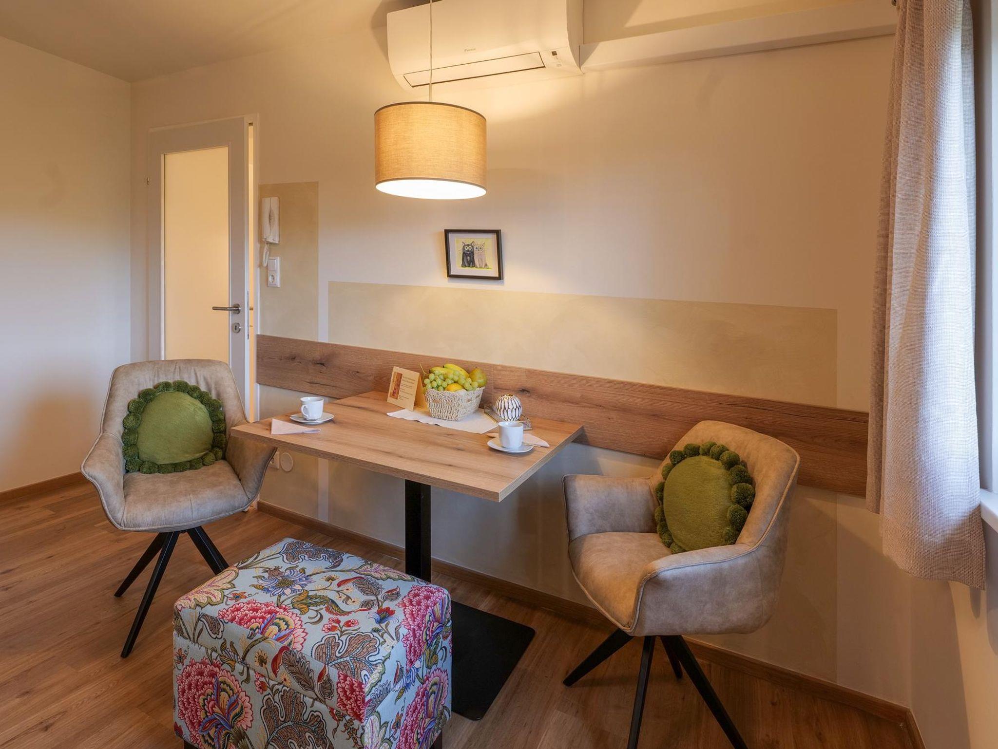 Im Jahr 2023 wurden die Appartements komplett neu saniert und hochwertig eingerichtet. Die Unterkünfte bieten nun Platz für 1 bis 4 Personen. Die hellen, gemütlich und stilvoll eingerichteten Räume laden zum Verweilen und Wohlfühlen ein. Eine Sitzgarnitur im ruhigen, gepflegten Außenbereich kann von den Gästen genutzt werden.