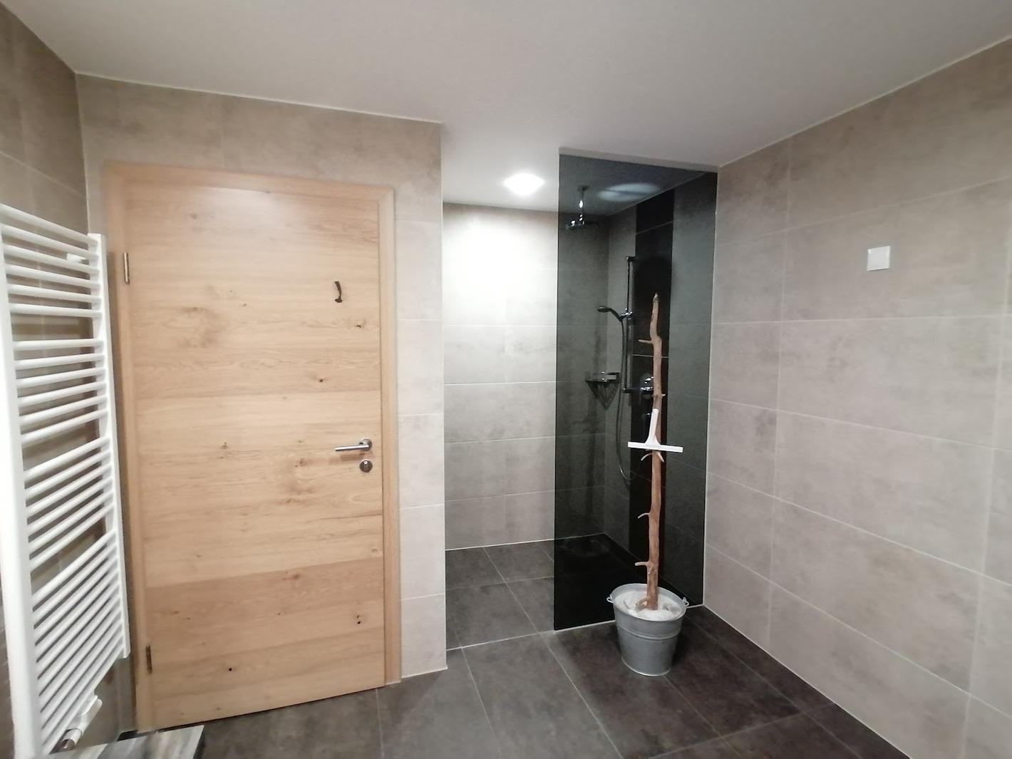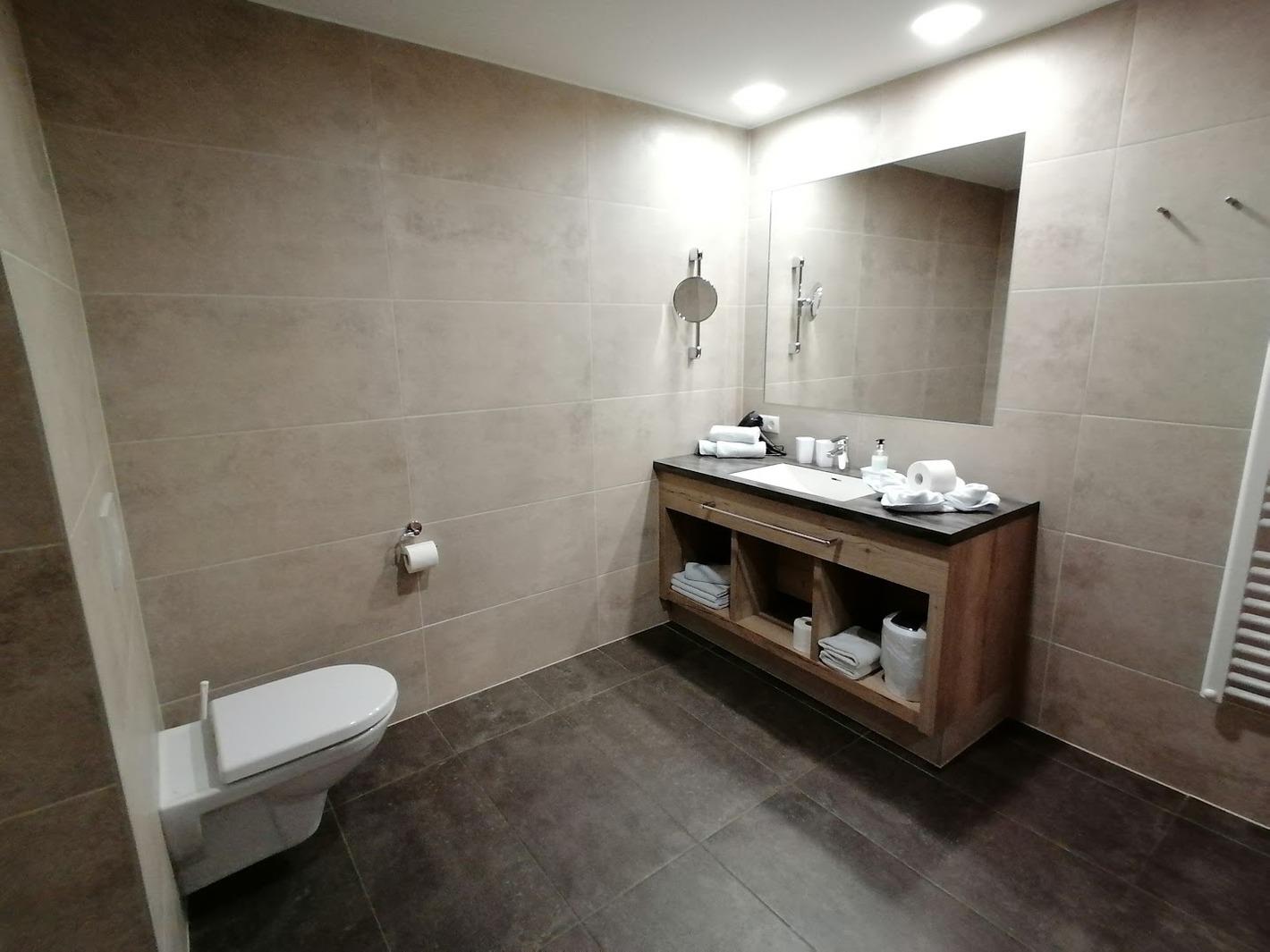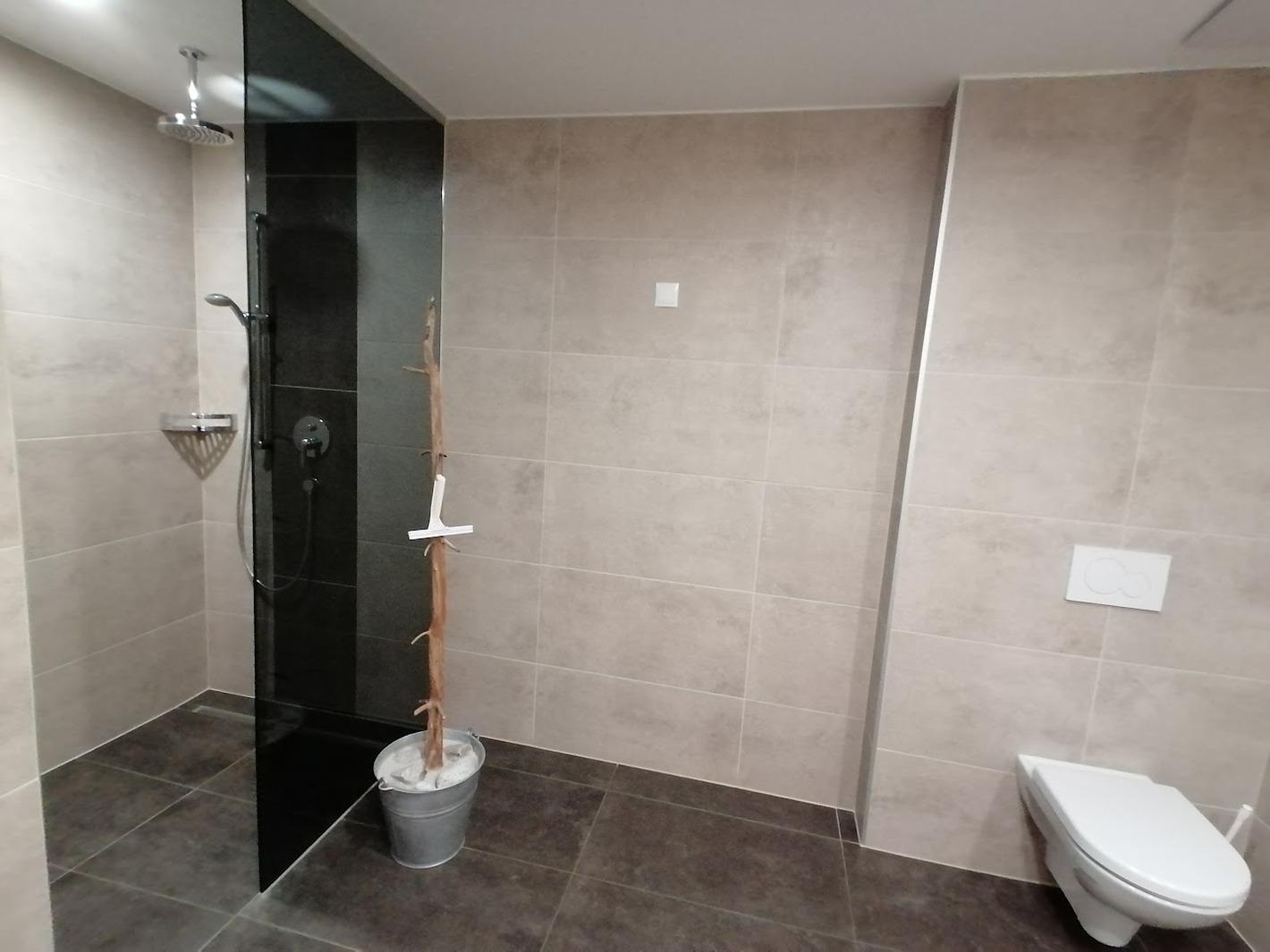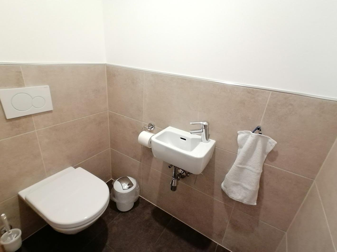 Großes, modernes Bad, einer Dusche mit Regendusche und WC, Föhn, großer Spiegel, Kosmetikspiegel und Handtuchtrockner. Ein separates WC ist vorhanden. Großer Flur mit Garderobe. Bei Bedarf stellen wir Ihnen auch gerne ein Kinderreisebett und einen Hochstuhl zur Verfügung.