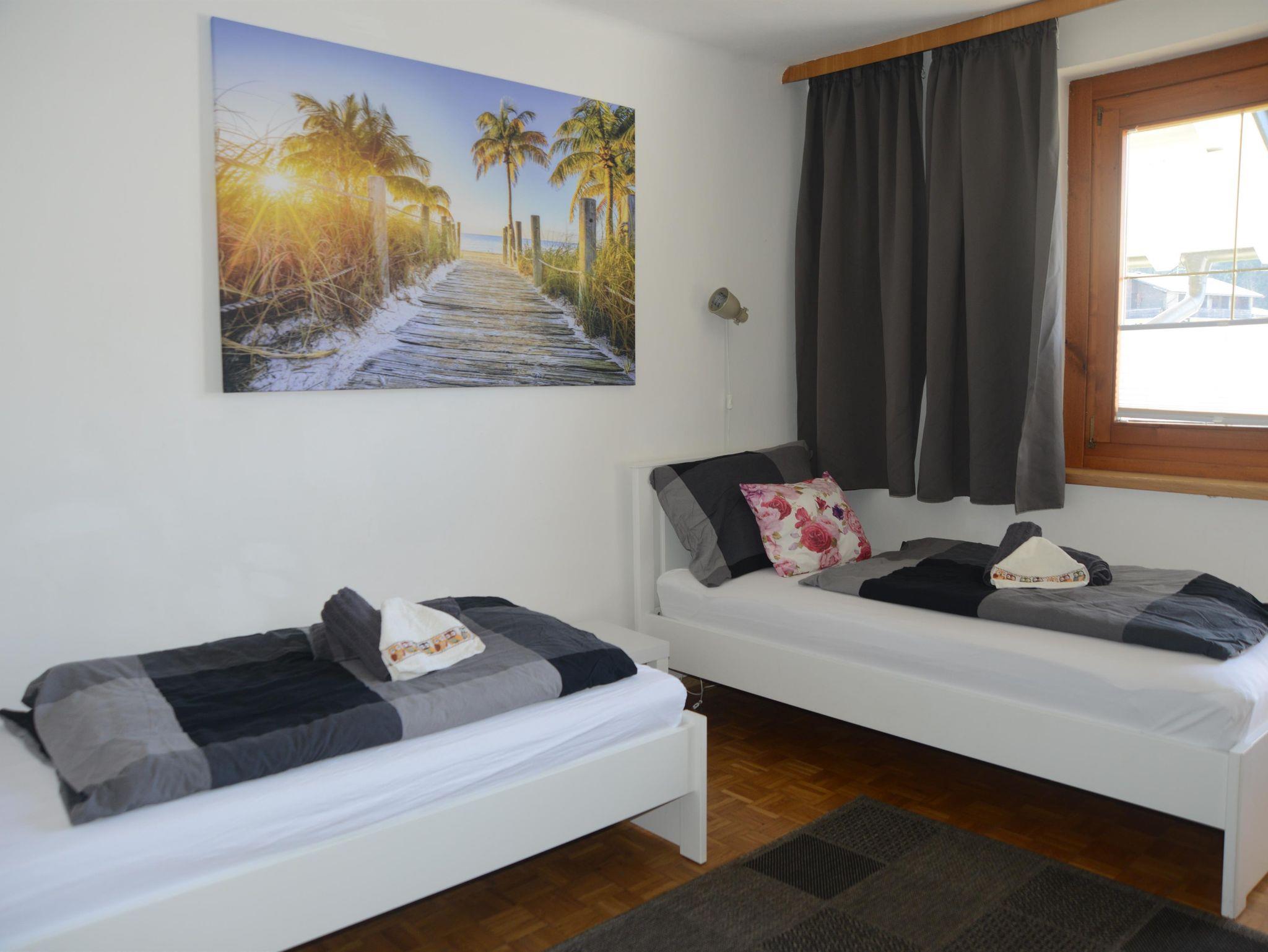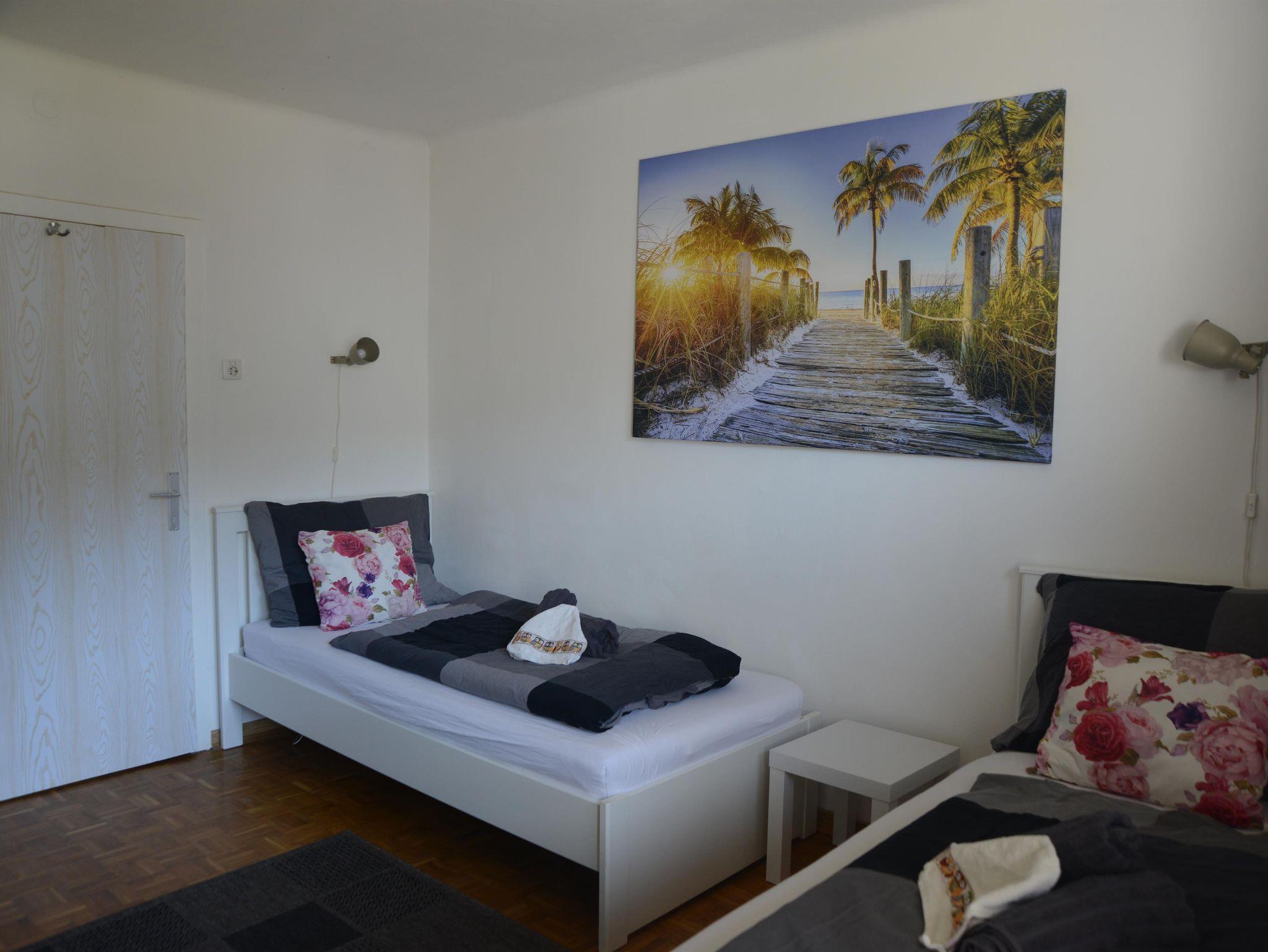 Zimmer mit Zwei Einzelbetten und kleinem Bad. Balkon mit Gartenblick