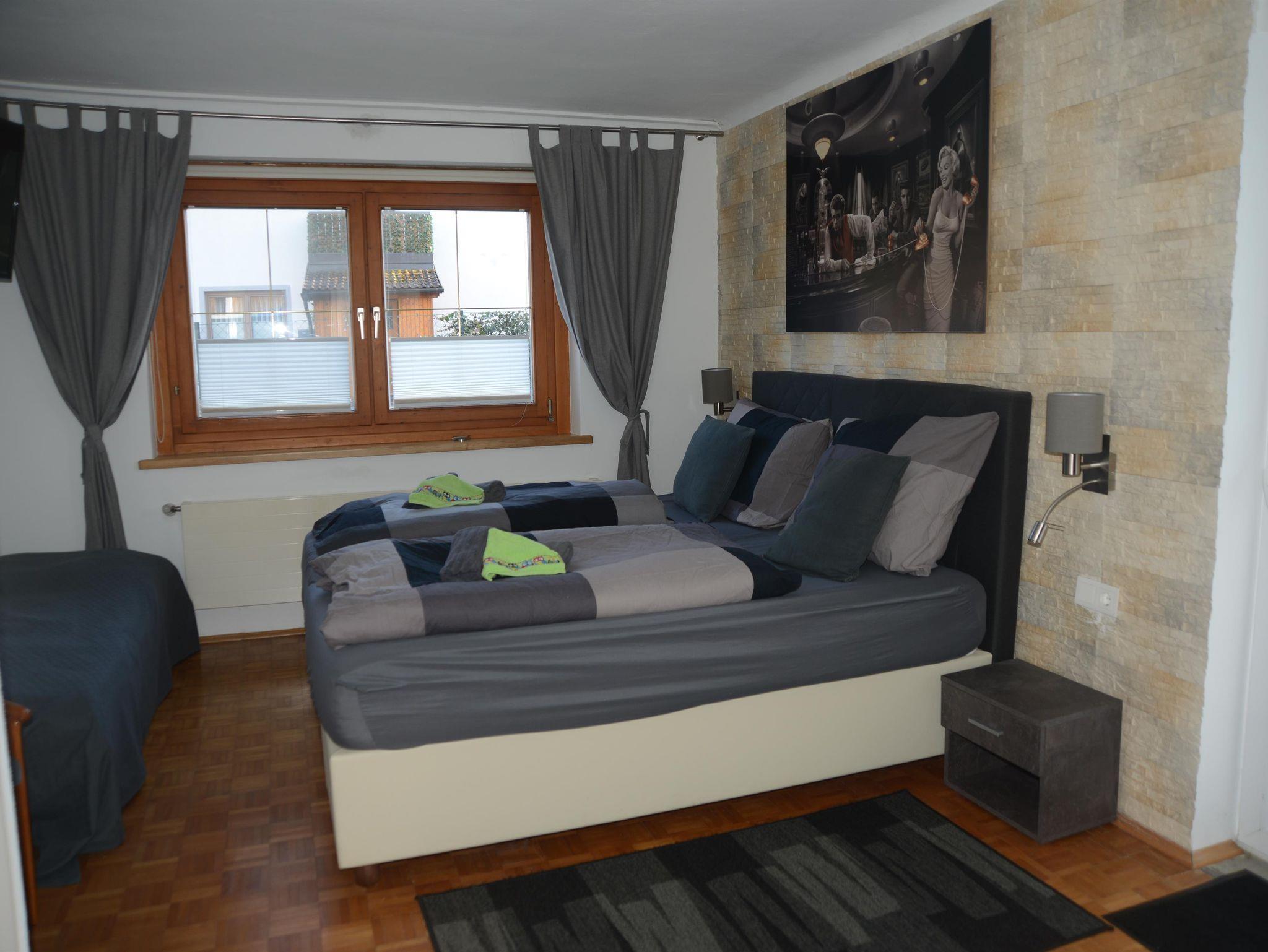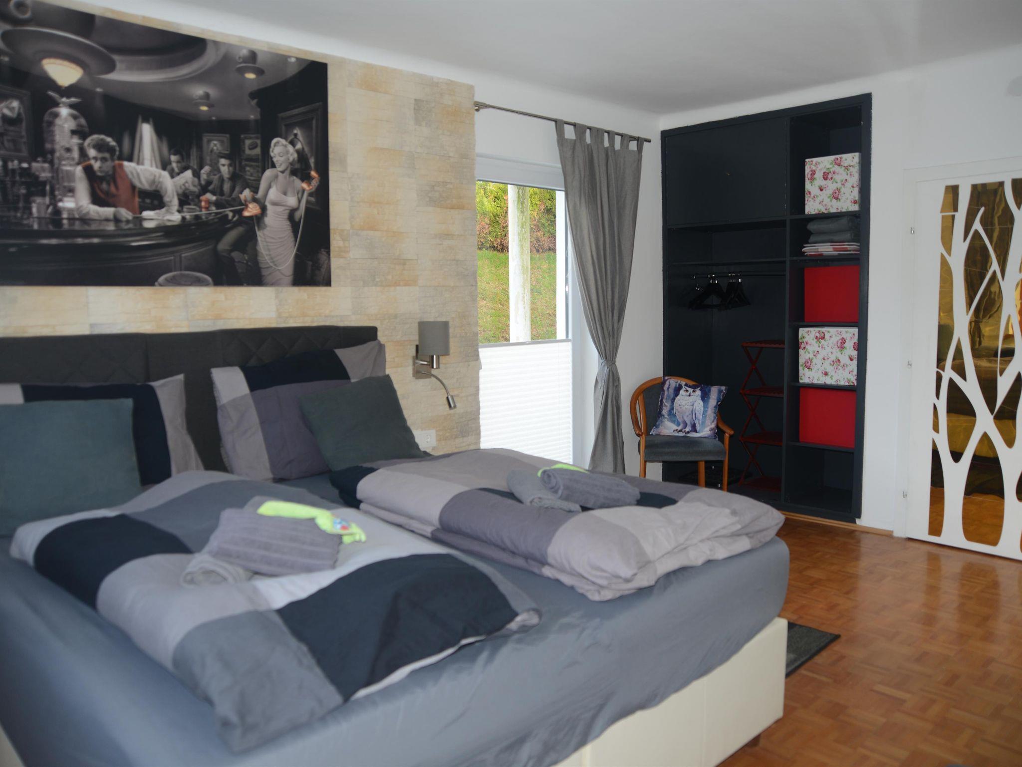 Großes Zimmer mit Boxspringbett und der Möglichkeit für ein Zustellbett für ein Kind. Das Zimmer befindet sich im Erdgeschoss und verfügt über eine Terrasse .