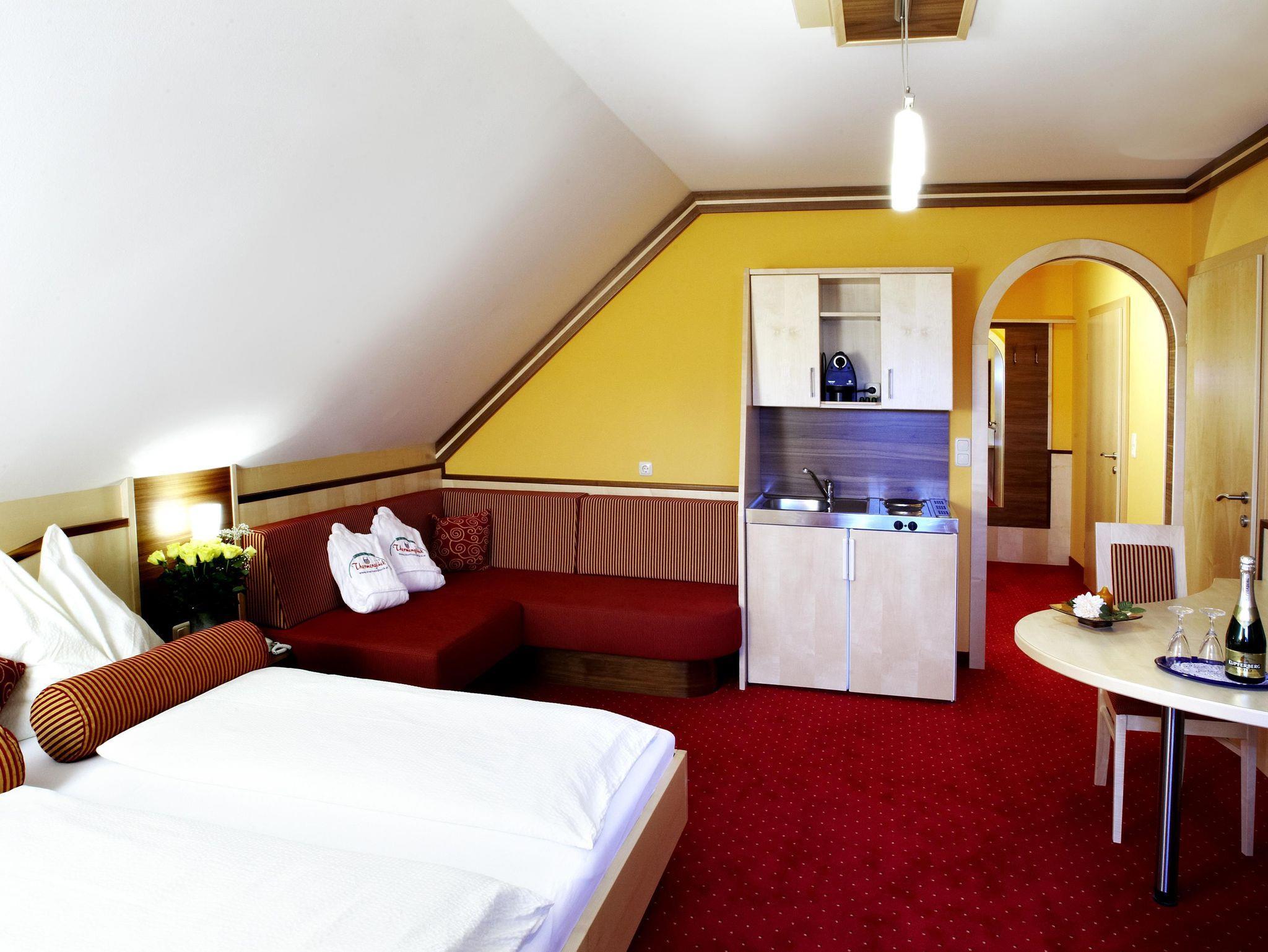 Einfach wohlfühlen und genießen. Unweit der Therme Loipersdorf in einem romantischen Seitental gelegen, ist unser Haus mit allen seinen Vorzügen der richtige Platz für die ganze Familie. Genießen Sie den Tag mit allen seinen schönen und guten Dingen. An unserem reichhaltigem Frühstücksbuffet kommen unsere Gäste schon am Morgen auf den guten Geschmack. Die großzügige Ausstattung der Komfortzimmer in unserem Haus lässt Sie nichts vermissen. Sämtliche Zimmer sind mit Sat-TV, Radio, Telefon, Tresor, Fön sowie Dusche und WC (getrennt) ausgestattet. Vom Balkon bietet sich Naturliebhabern ein herrlicher Ausblick auf die schöne Landschaft. Währenden Sie sich auf der Terasse oder auf der Liegewiese erholen, können sich Ihre kleinen Lieblinge am Kinderspielplatz austoben oder sich im Streichelzoo vergnügen. Gratis Fahrrad und Badmantelverleih. Die Geschenksidee: Gutscheine für ein paar erholsame Tage im Hotel Garni Thermenglück ****.