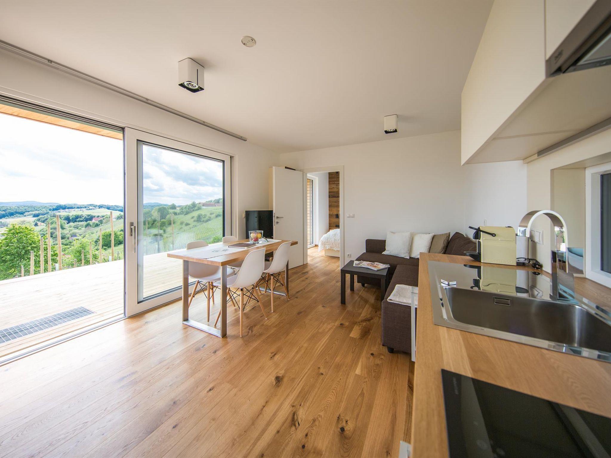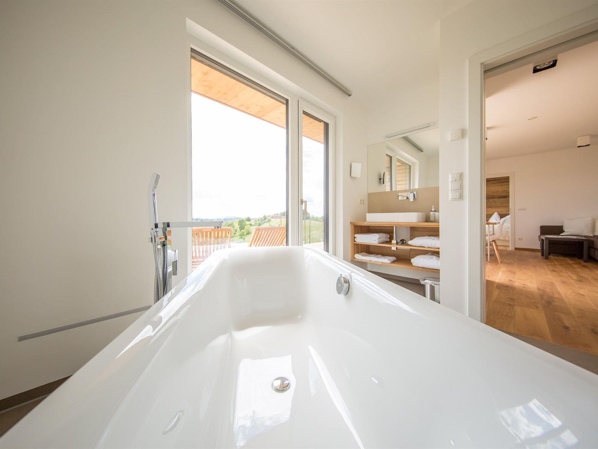Zeit für s’ICH! Unser WeinHAUS 05 steht für eine Auszeit vom Alltag. Das Bad mit Walk In Dusche und als Highlight die freistehende Badewanne mit Blick hinaus in den Weingarten sorgen für unbeschwerten Urlaubsgenuss. Die komplett ausgestattete Maßküche, ein gemütliches Schlafzimmer für Zwei, SAT-TV mit ORF und SKY und nicht zuletzt die private Schwebeliege auf der Terrasse laden zum Ankommen ein.