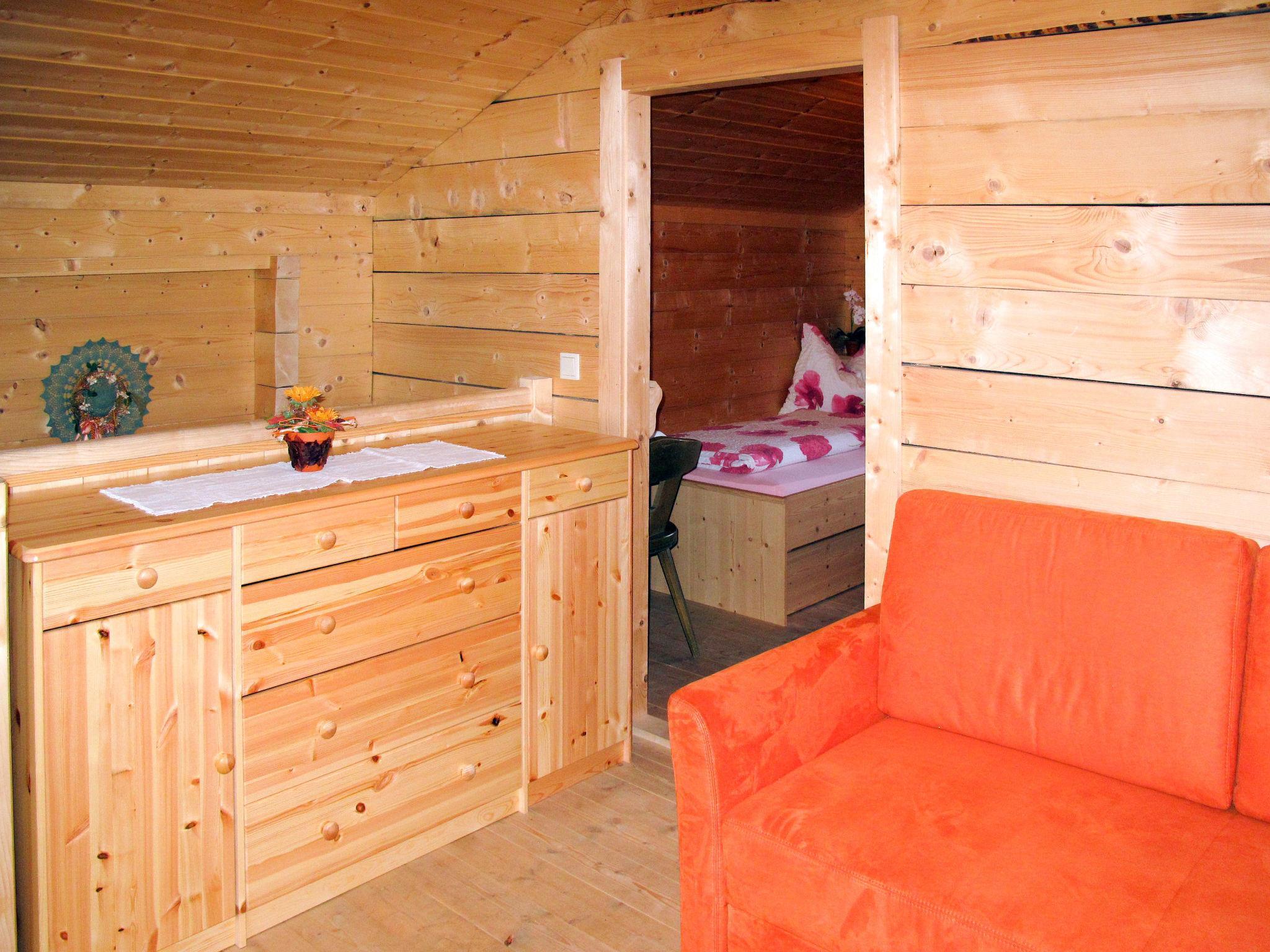 "Sturmbachhütte", 3-room house 73 m2 on 2 levels. Tasteful and wooden furniture furnishings: living/dining room with Scandinavian wood stove, dining table and satellite TV. 1 room with 1 double bed. Kitchen (2 hot plates, toaster, kettle, microwave, electric coffee machine, raclette grill) with dining table, wood-burning stove. Shower/WC. Heating not available in all rooms. Upper floor: open entrance hall with 1 double sofabed. 1 room with 2 beds. Exit to the balcony. Wooden floors. Terrace. Terrace furniture, barbecue, deck chairs, box-room. Panoramic view. Facilities: Internet (WiFi, free). Please note: non-smokers only. Smoke alarm. 50624-000306-2020