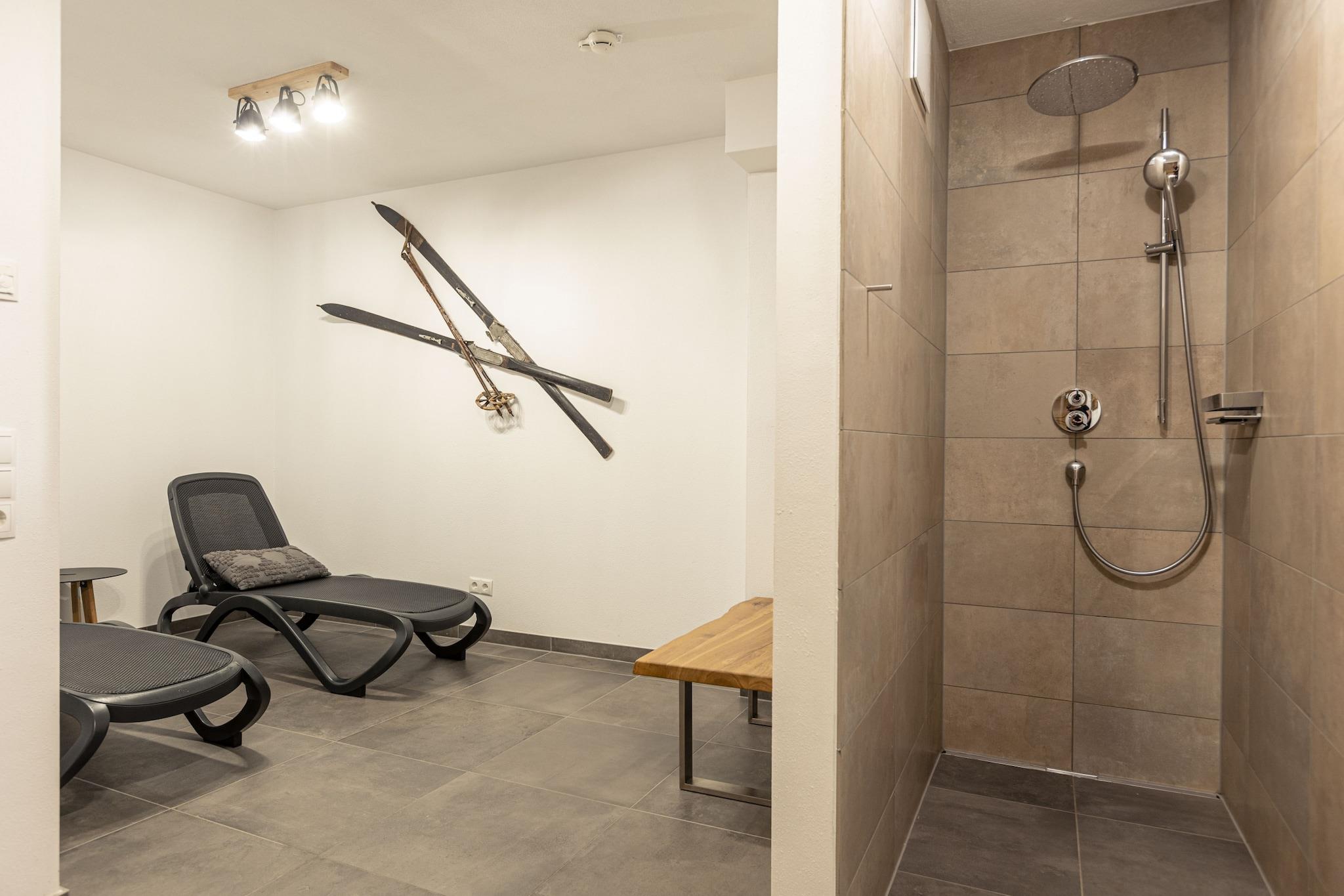 On the 1st floor: (bedroom(double bed, TV), bedroom(double bed, TV), bedroom(double bed, TV), bedroom(single bed, single bed, TV), bathroom(shower, washbasin, toilet), bathroom(shower, washbasin, toilet), bathroom(shower, washbasin, toilet), Internet access) On the 2nd floor: (open kitchen(hob, electric kettle, toaster, cooker, hood, coffee machine, microwave, dishwasher, fridge-freezer), Living/diningroom(TV, dining table, seating area)) ski storage, Garden Furniture , cot, sauna, balcony, heating, terrace, garden, parking, high chair, ironing board, iron, hairdryer, Charging post for electric cars
