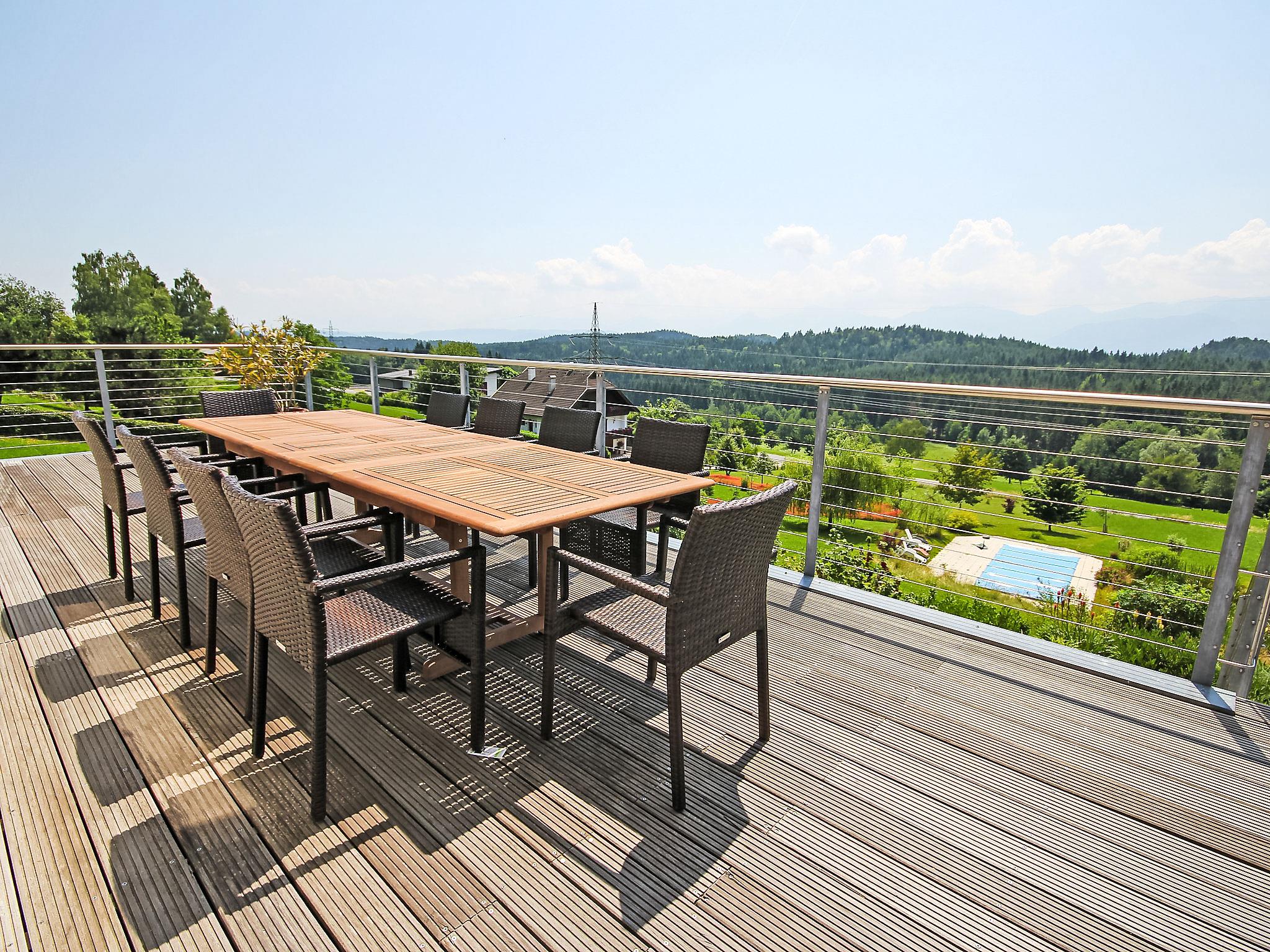 Nestled in the rolling hills between Wörthersee and Ossiachersee, lies the modern, luxurious villa "Carinthia", surrounded by meadows and fields. In the district of Köstenberg 7 km from the centre of Velden, in a quiet, sunny position, 6 km from the lake. Private: large, well-kept garden 10'000 m2 with wildlife garden, orchard, lawn for sunbathing, swimming pool (9 x 4 m, seasonal availability: 01.Jun. - 15.Sep.). Patio, terrace, barbecue. In the house: WiFi, sun terrace, central heating system. Parking. Grocery 6 km, restaurant 300 m, bus stop 300 m, swimming bay 6 km, public bathing area 10 km. Golf course (18 hole) 300 m, riding stable, ski lift 14 km. Nearby attractions: Ruine Hochwart 3 km, Tierpark Rosegg, 13 km, Pyramidenkogel 28 km. Well-known ski regions can easily be reached: Kanzelhöhe, Gerlitzen 16 km. Well-known lakes can easily be reached: Saissersee 6 km, Wörthersee, Ossiachersee. The owner does not accept any youth groups. Neighbourhood highly sensitive to noise. Quietness and good behaviour expected. The house has been furnished with great attention to detail and meets the highest standards of comfort and privacy. The famous golf course Velden-Köstenberg is located in the immediate vicinity.