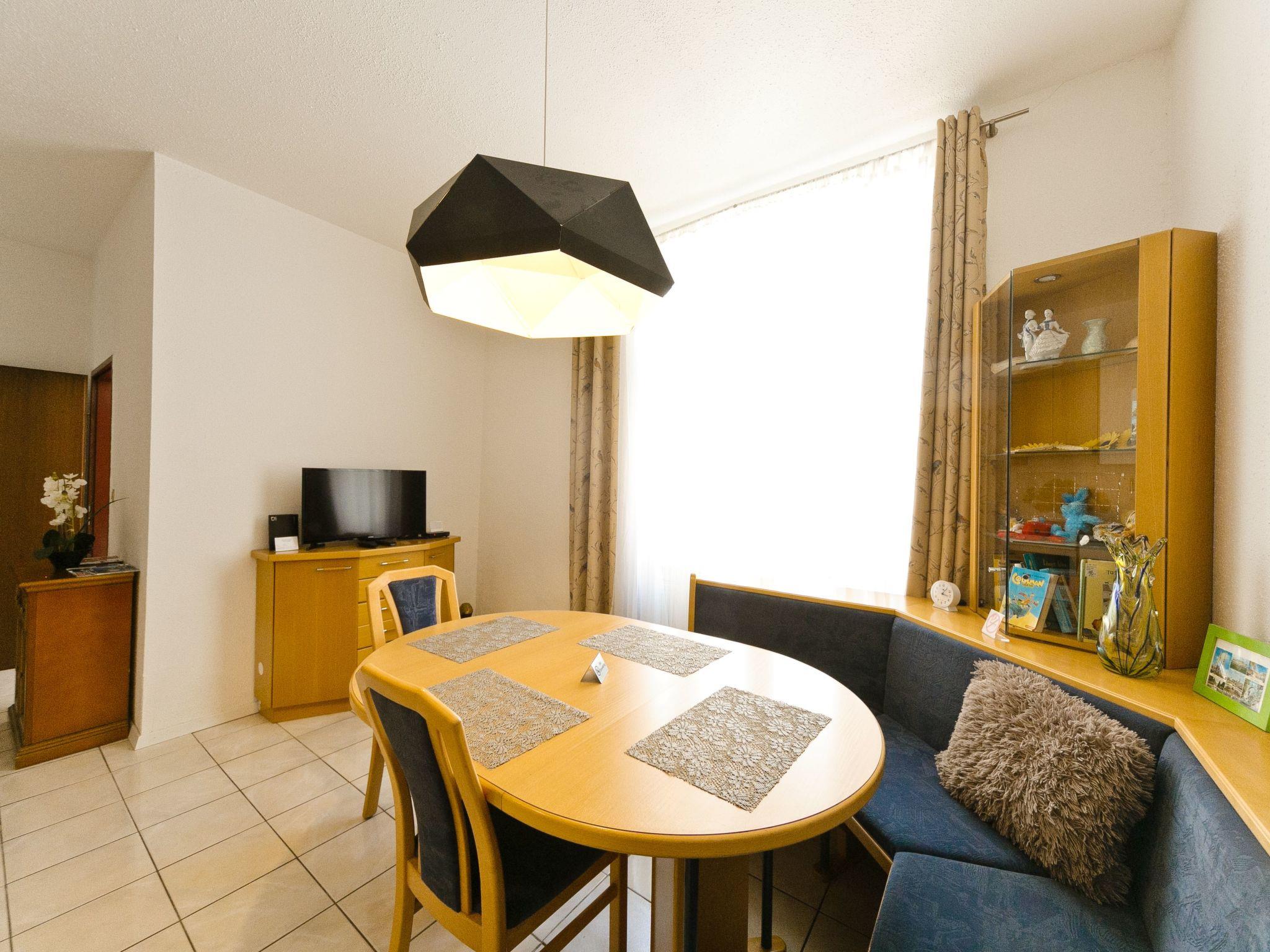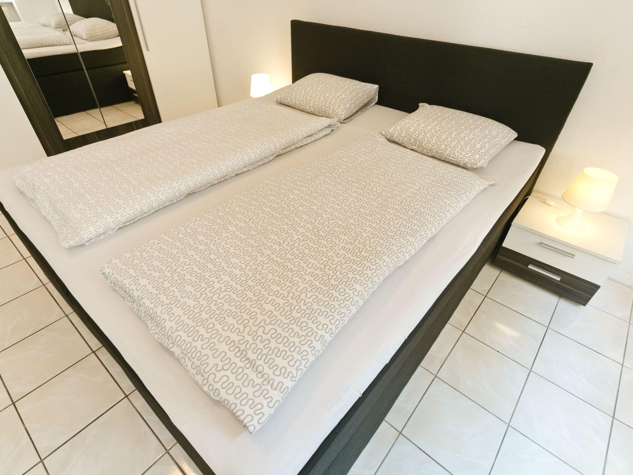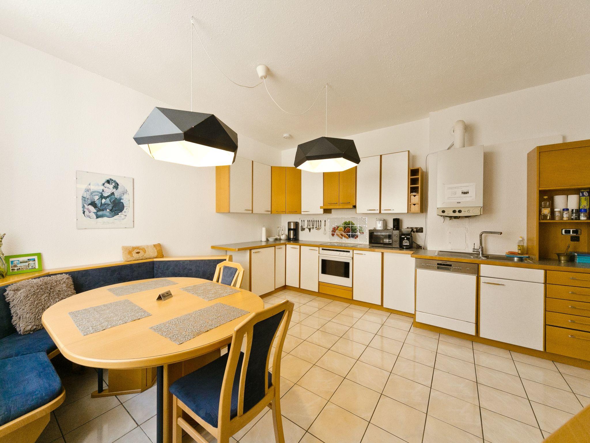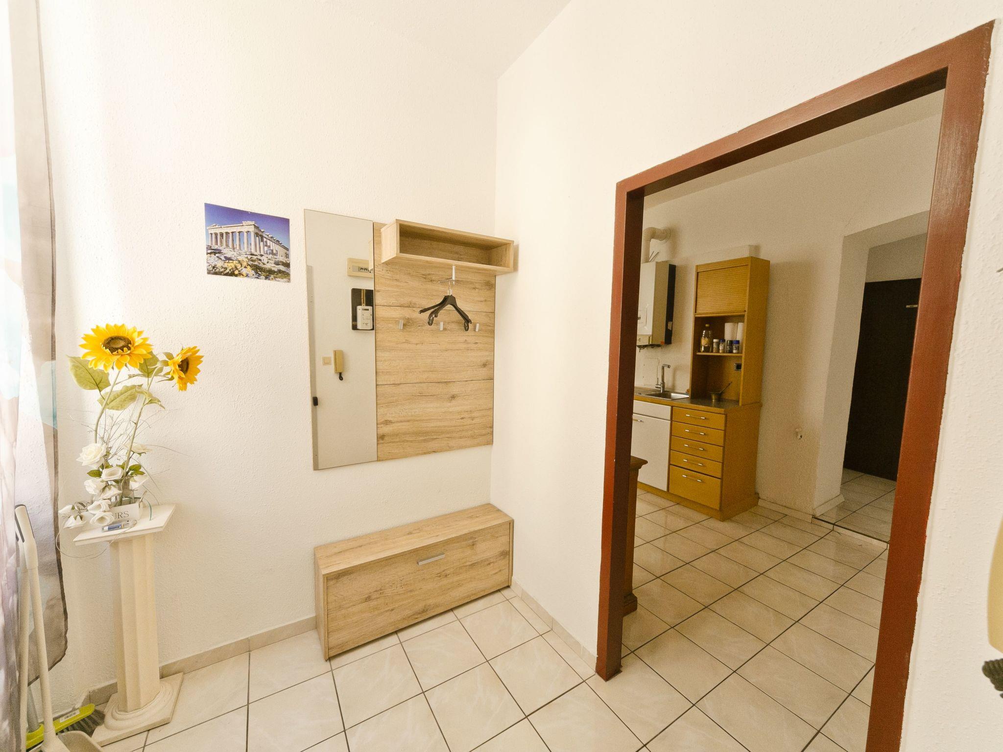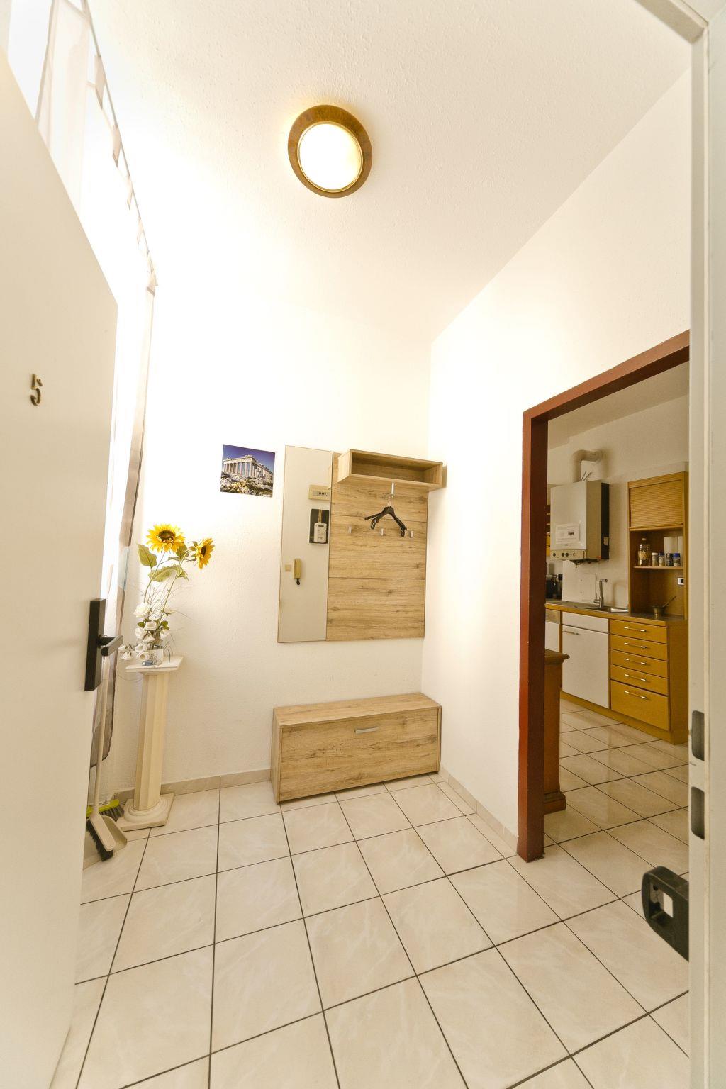 Inside the flat you will find a harmonious blend of functionality and style. The living area has a tiled floor and a cosy seating area consisting of a corner bench, a table and two chairs as well as a TV for relaxing evenings. The open-plan kitchen leaves nothing to be desired: Ceramic hob, oven, a capsule coffee machine, microwave, dishwasher and a fridge/freezer are at your disposal. The comfort is complemented by a spacious bathroom with bathtub, shower and washbasin as well as a separate WC, ensuring a smooth morning and evening programme.