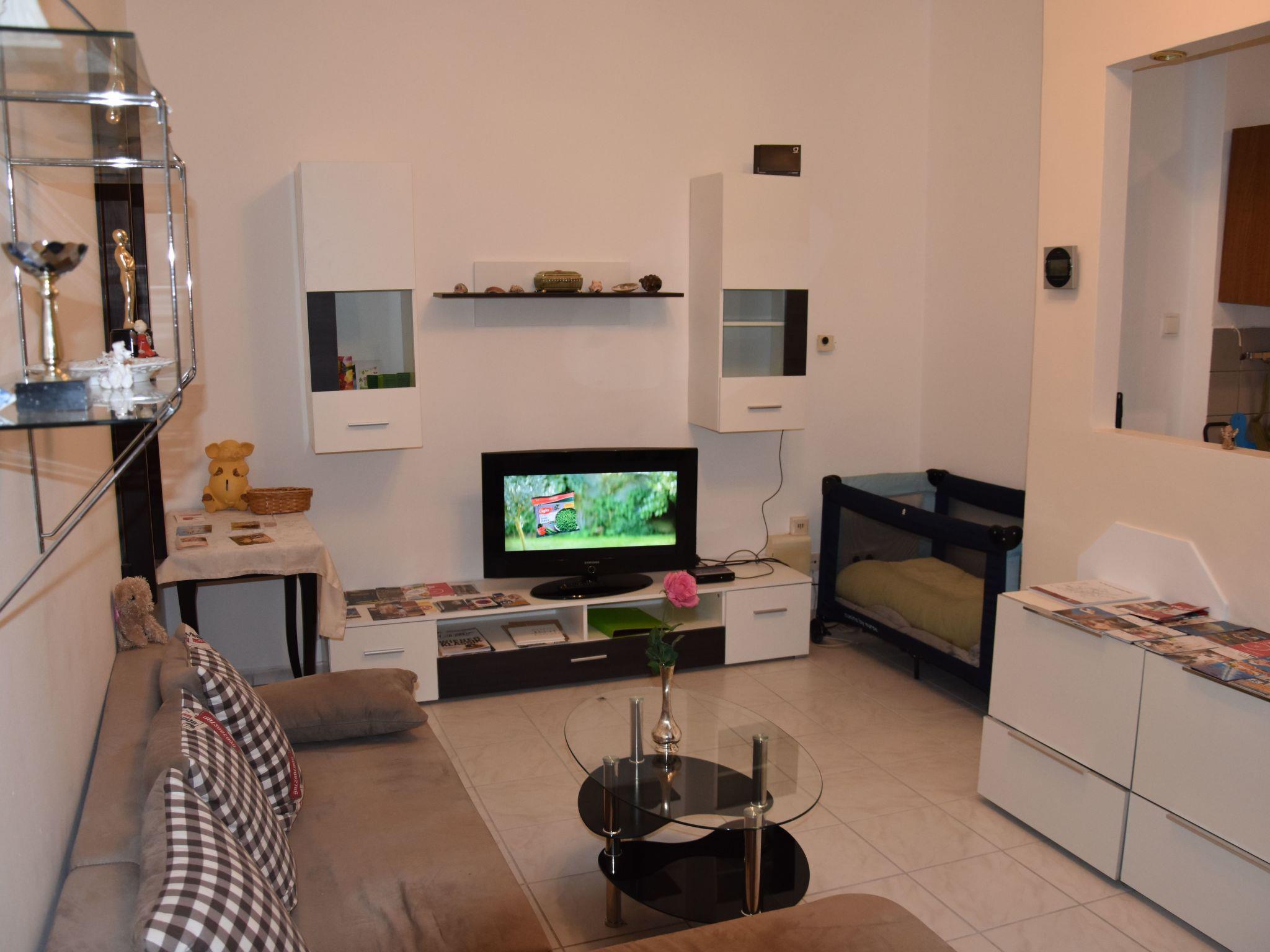 This flat is on the first floor and offers 45 m² of space for two people. The flat has a tiled floor and is divided into an entrance area, a bathroom with toilet, a living room with kitchen and a bedroom. The living room has a sofa, coffee table, a living room cupboard and a dining area with a table and two chairs. The kitchenette consists of a cooker, capsule coffee machine, microwave, fridge, sink and kettle. The bathroom has a shower, WC and washbasin. The bedroom has a 180 cm wide double bed with bedside table and a spacious wardrobe.