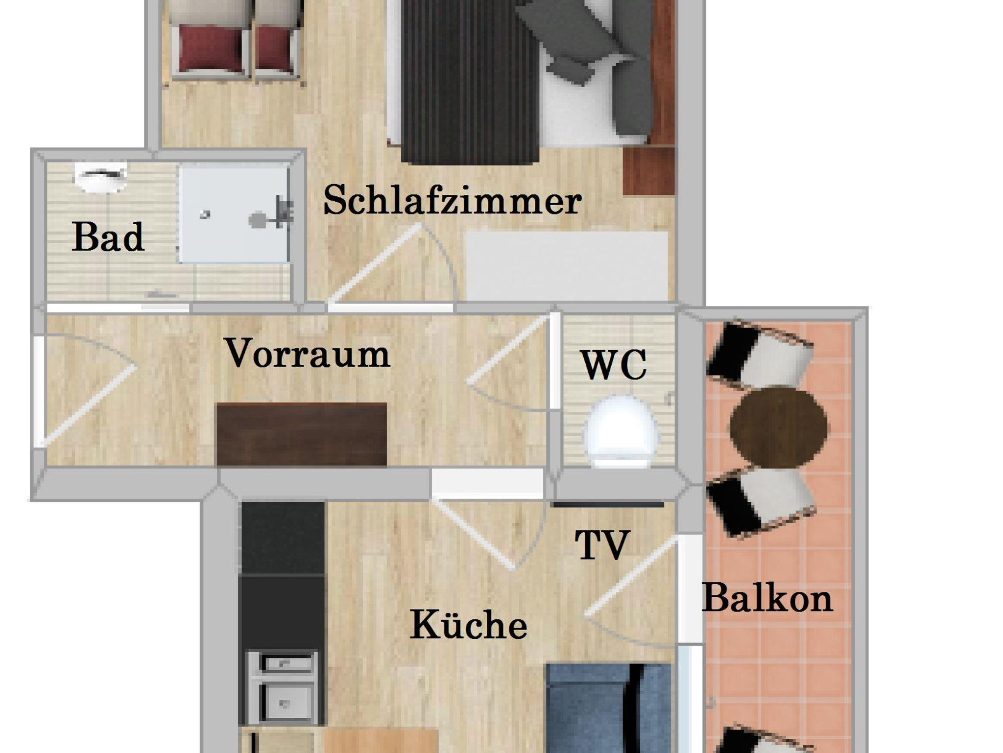 1 Schlafzimmer mit Doppelbett, und intergriertem Bad mit DU/WC, Platz für 1Kinderett gegen Aufpreis bei Bedarf von € 10,--im Schlafzimmer möglich, 1x Flat TV, Süd-Balkon, mit Gartenmöbel.