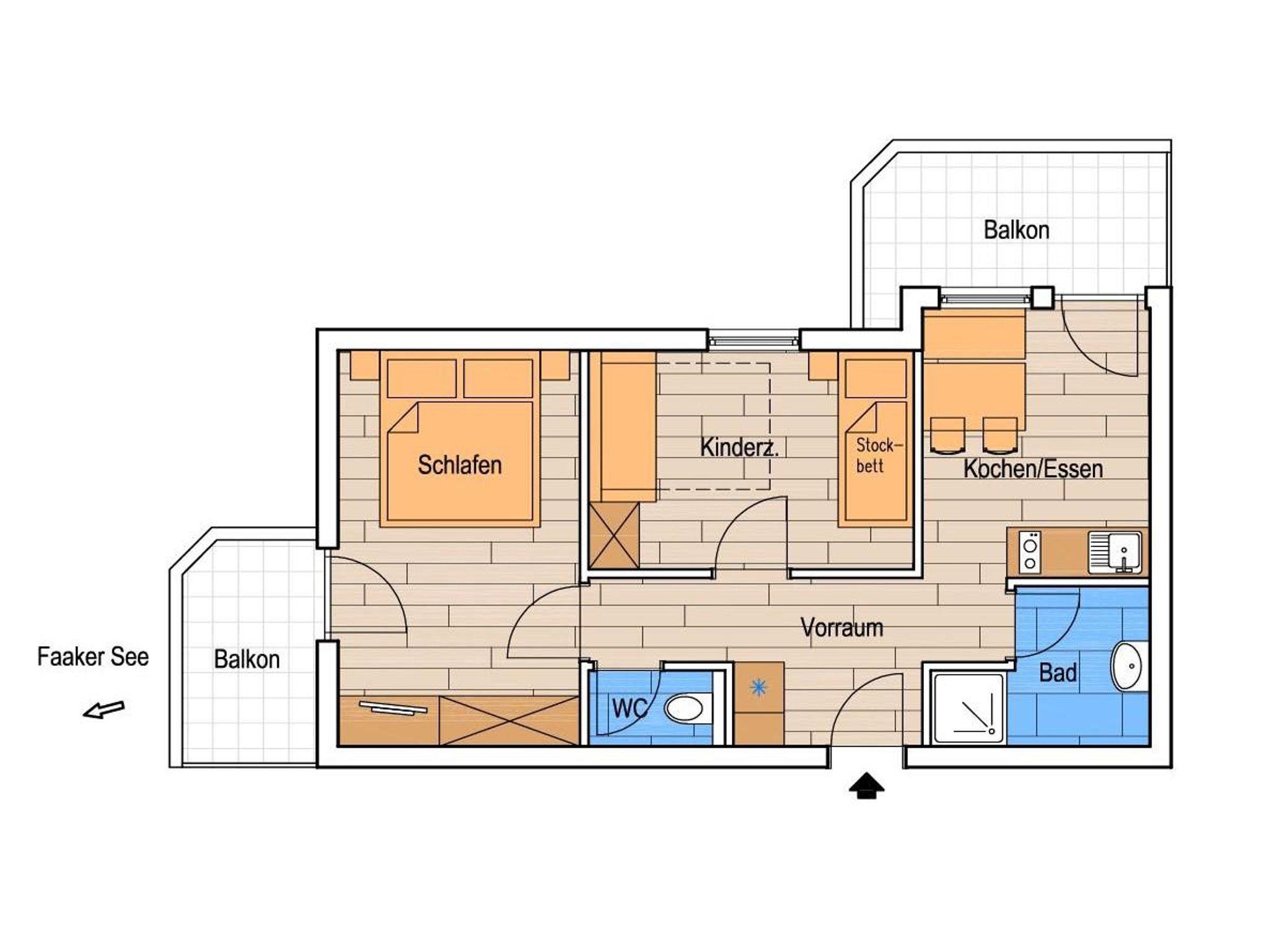 2 Schlafräume, 1 Wohnraum, Kochnische - komplett eingerichtet, Dusche WC, Sat-TV, gratis WLAN und Balkon. Bade- und Handtücher, Bett und Tischwäsche sind vorhanden. Eigener Badestrand!