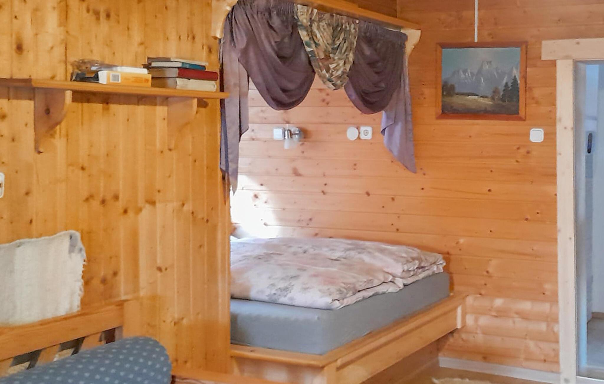 Langt borte fra hverdagen inviterer denne sjarmerende tømmerhytta deg til en ferieopplevelse nær naturen. Tilbered en solid frokost på det funksjonelle kjøkkenet, og nyt den i den innbydende sittegruppen. Etter en aktiv dag kan du tenne opp i peisen, slappe av i sofaen med en god bok eller spille et parti kort.