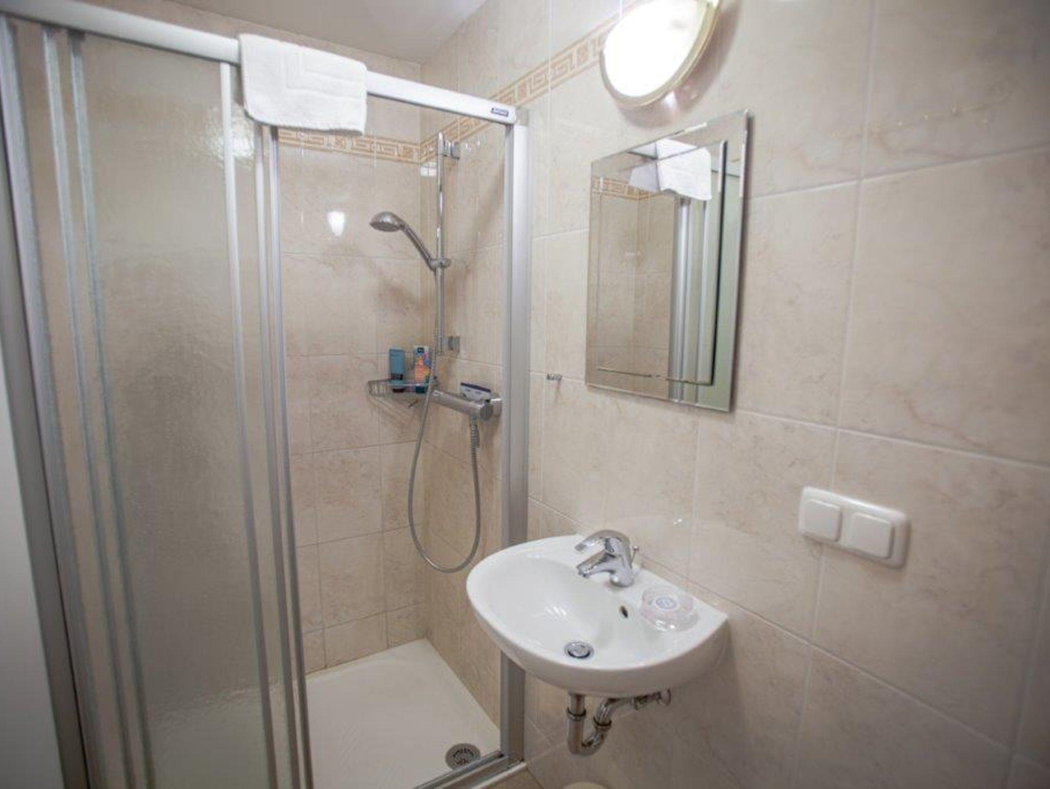 Das Zweibettzimmer mit 13 m2 verfügt über einen Schreibtisch mit Kabelanschluss und TV. Das dazugehörende Bad mit Dusche, Waschbecken und WC liegt gegenüber. Duschgel, Seife und Fön werden bereitgestellt. Ein Willkommensgruß erwartet Sie.