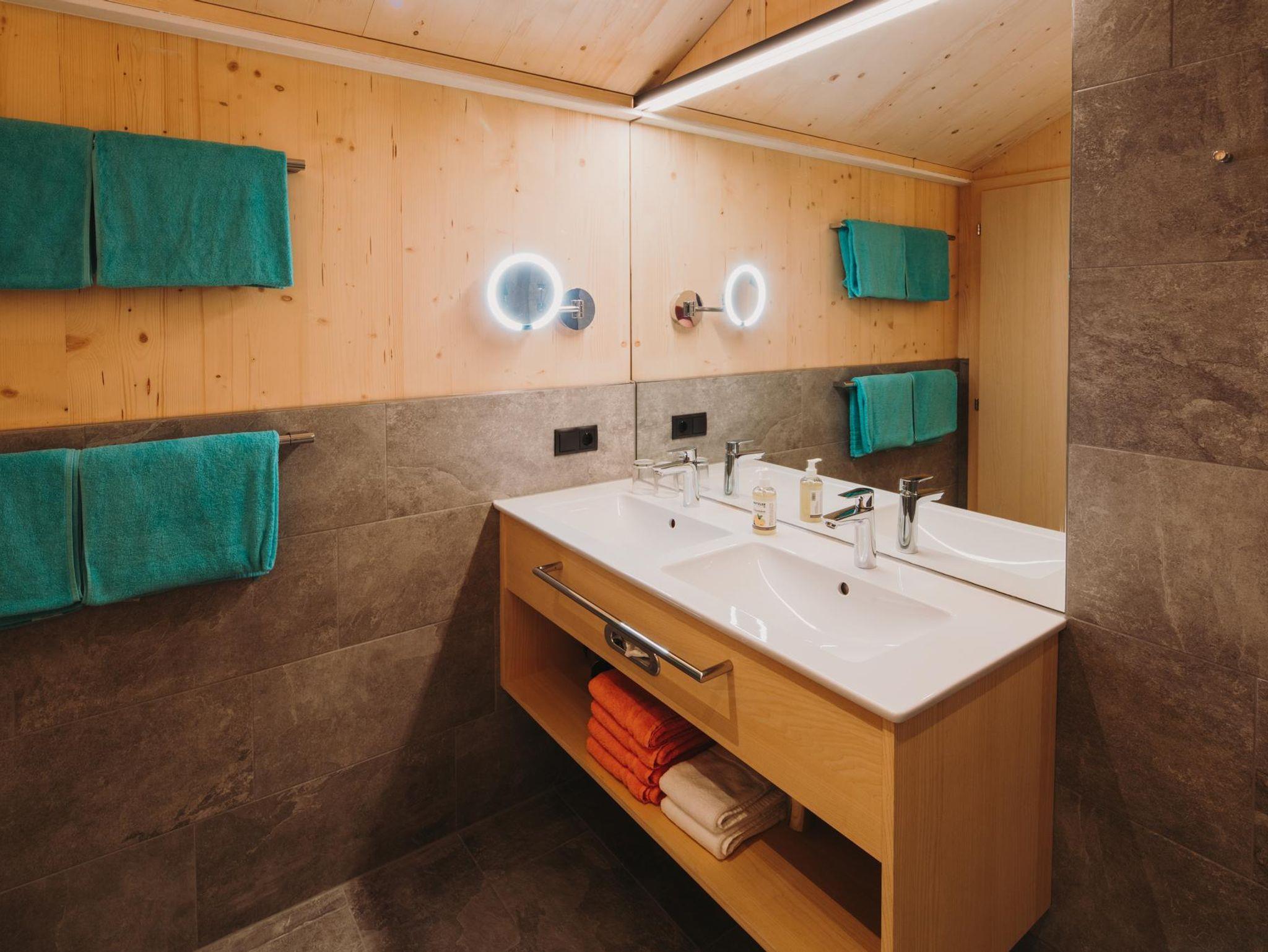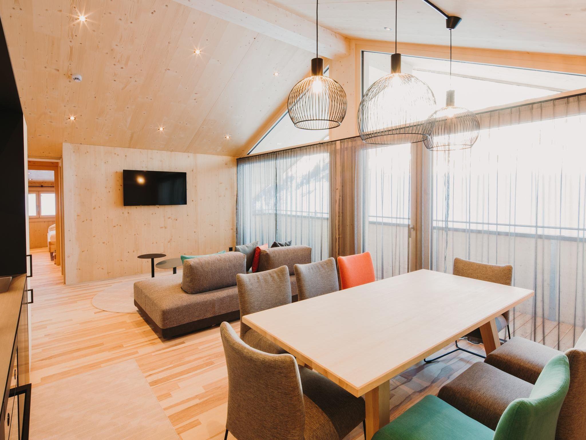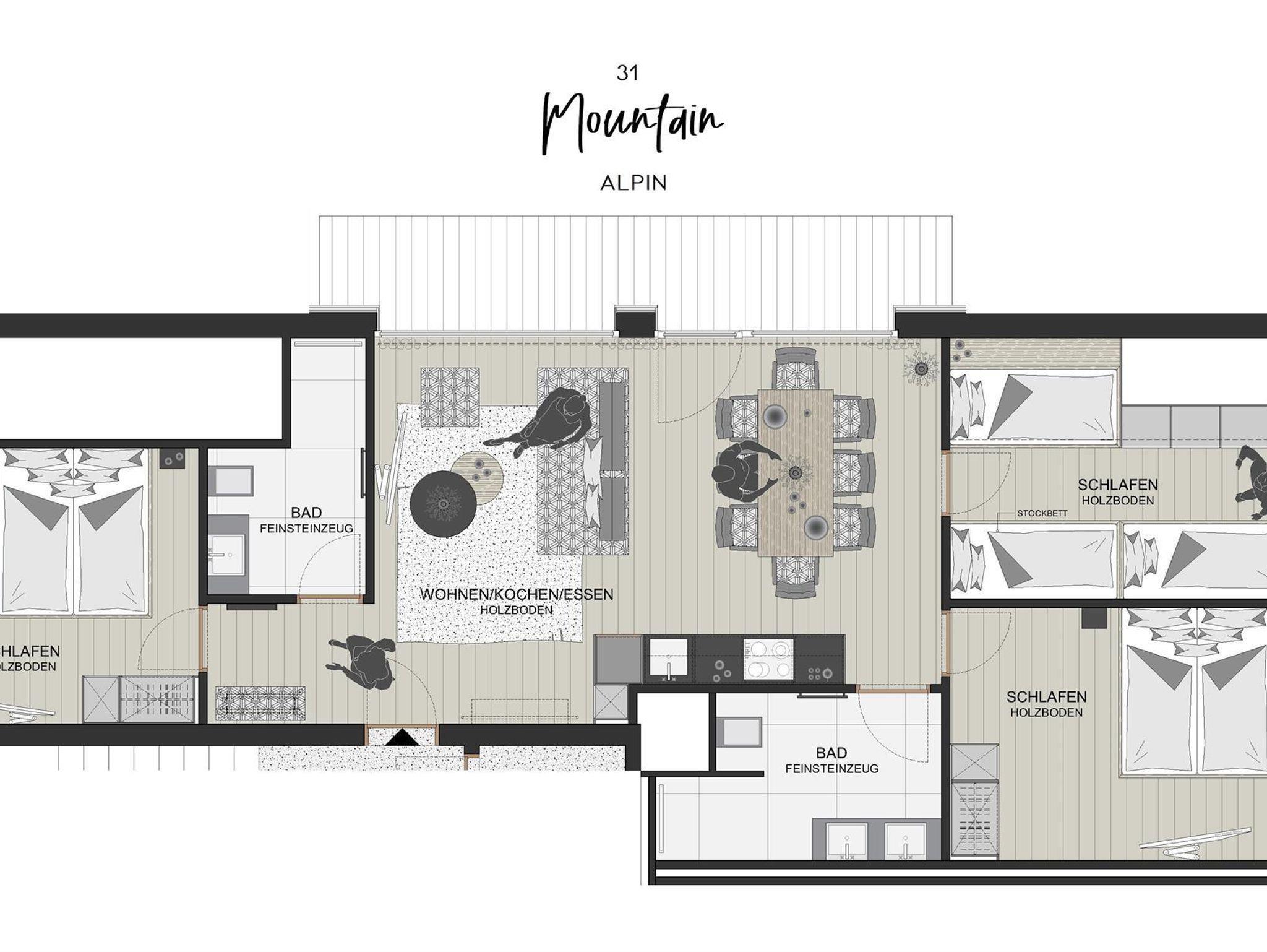 Eines unserer zwei Herzstücke, die Panoramasuite Mountain Alpin im Dachgeschoss, lässt Euer Herz höherschlagen und raubt Euch beim Ausblick auf die unverbaute Bergwelt sprichwörtlich den Atem. Großfamilien mit Oma und Opa im Gepäck oder eine Runde mit deinen Herzensmenschen, hier findet ihr Euer perfektes Urlaubsdomizil. Umgeben von Fichtenvollholz, eingerichtet mit natürlichen Materialien in Kombination mit dunklen Akzenten besticht diese Suite mit einer exklusiven Ausstattung. Drei separate Schlafzimmer, davon zweimal mit Doppelbetten und Glasfaser-TV eingerichtet, das dritte Zimmer bietet ein Stockbett und zwei Einzelbetten. Großzügiger und offen gestalteter Wohn-Essbereich mit vollausgestatteter Küche (ohne Mikrowelle), Glasfaser-TV und raumhohe Glasfronten. Zwei Badezimmer mit Walk-In Regendusche und WC’s. Telefon, Safe und kostenloses WLAN.