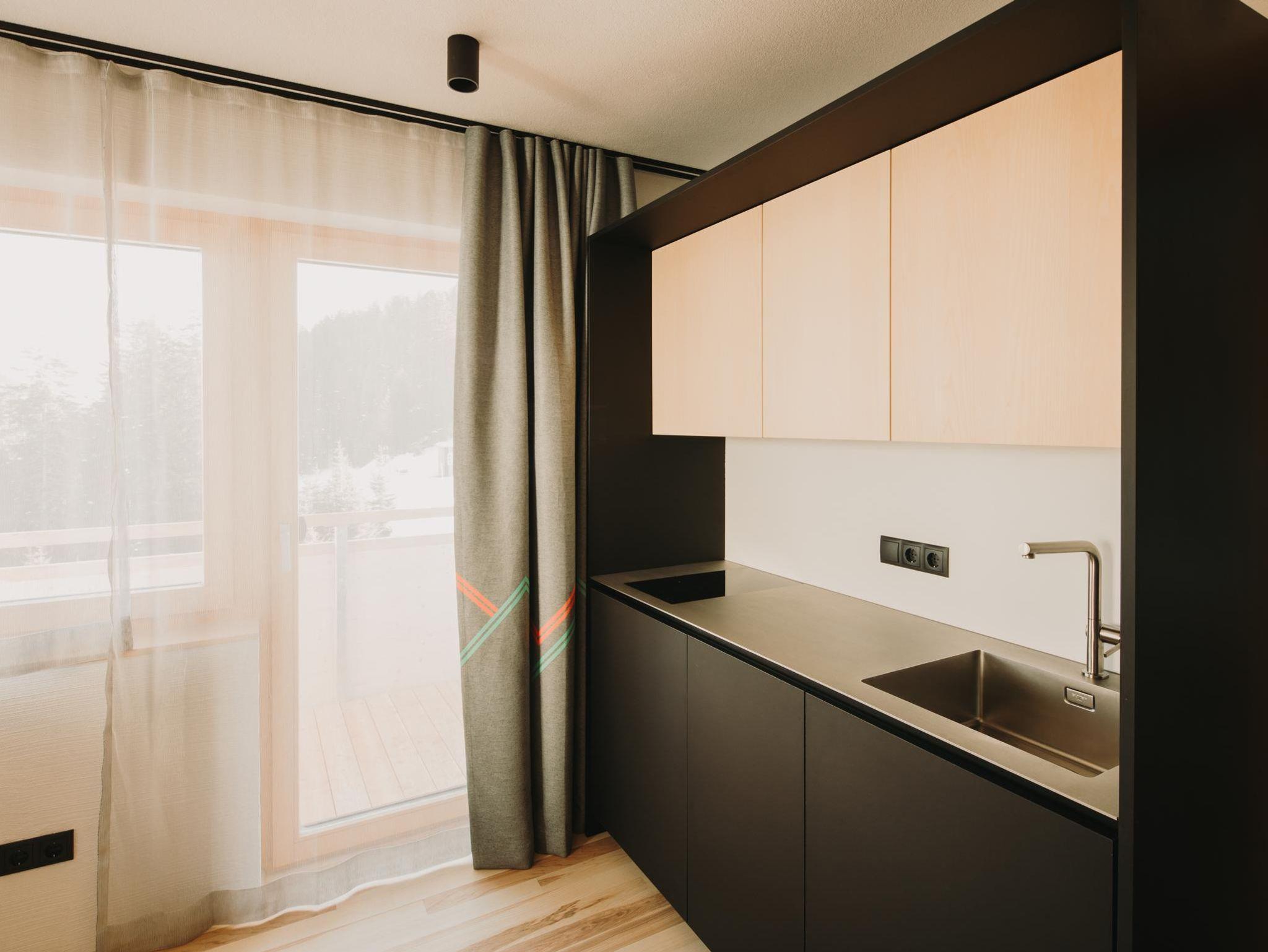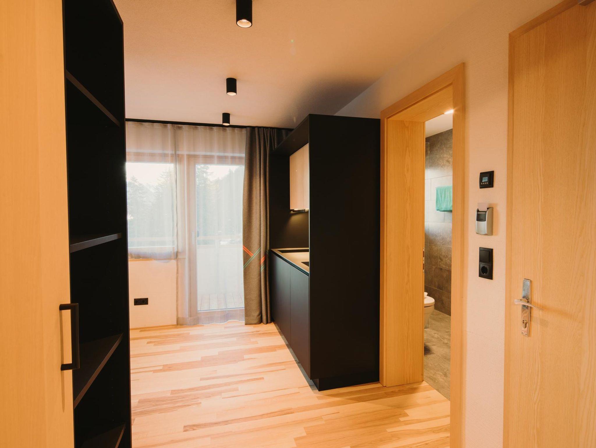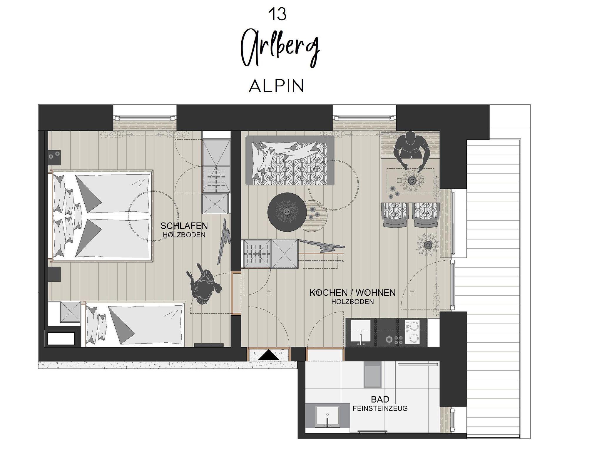 Bis zu 5 Personen einer Familie oder eine kleine befreundete Gruppe finden in den geräumigen Familienstudios Family Alpin Platz. Ein getrenntes Schlafzimmer mit Doppelbett und einem Einzelbett aus Zirbenvollholz sowie ein Wohnbereich mit hochwertiger Schlafcouch für die 4. und 5. Person sorgen für die nötige Erholung. Essbereich mit Kitchenette, Badezimmer mit Walk-In Regendusche und WC, Balkone für sonnige Stunden und panoramareiche Ausblicke. Glasfaser-TV im Schlaf- und Wohnzimmer, Telefon, Safe und kostenloses WLAN.