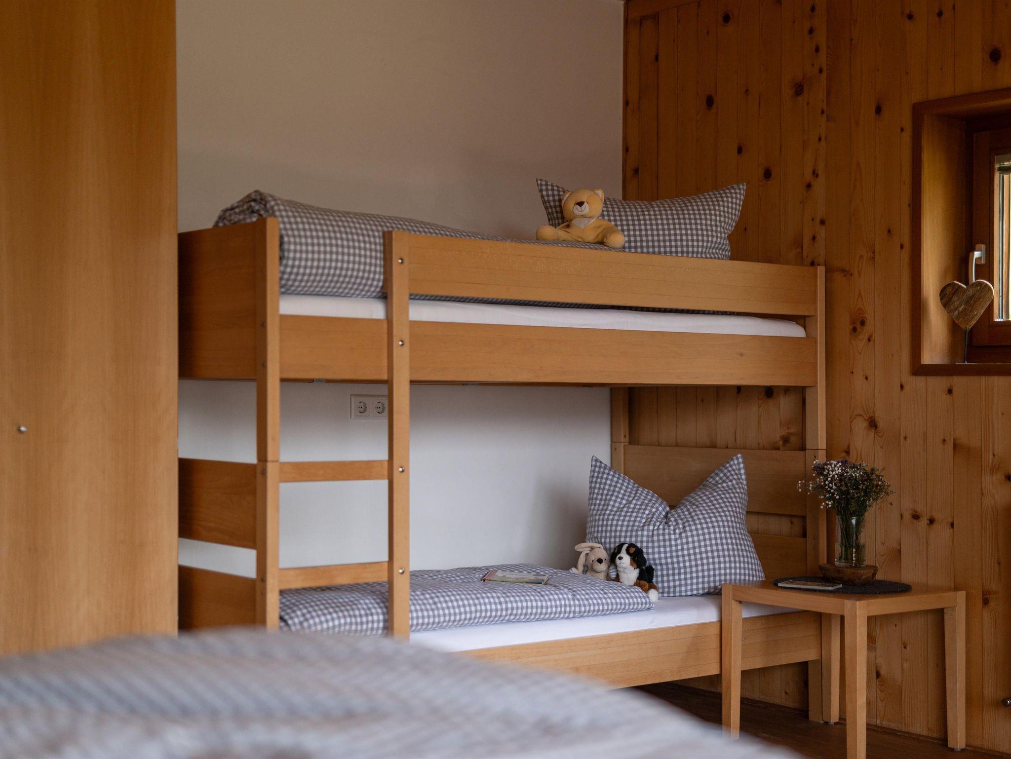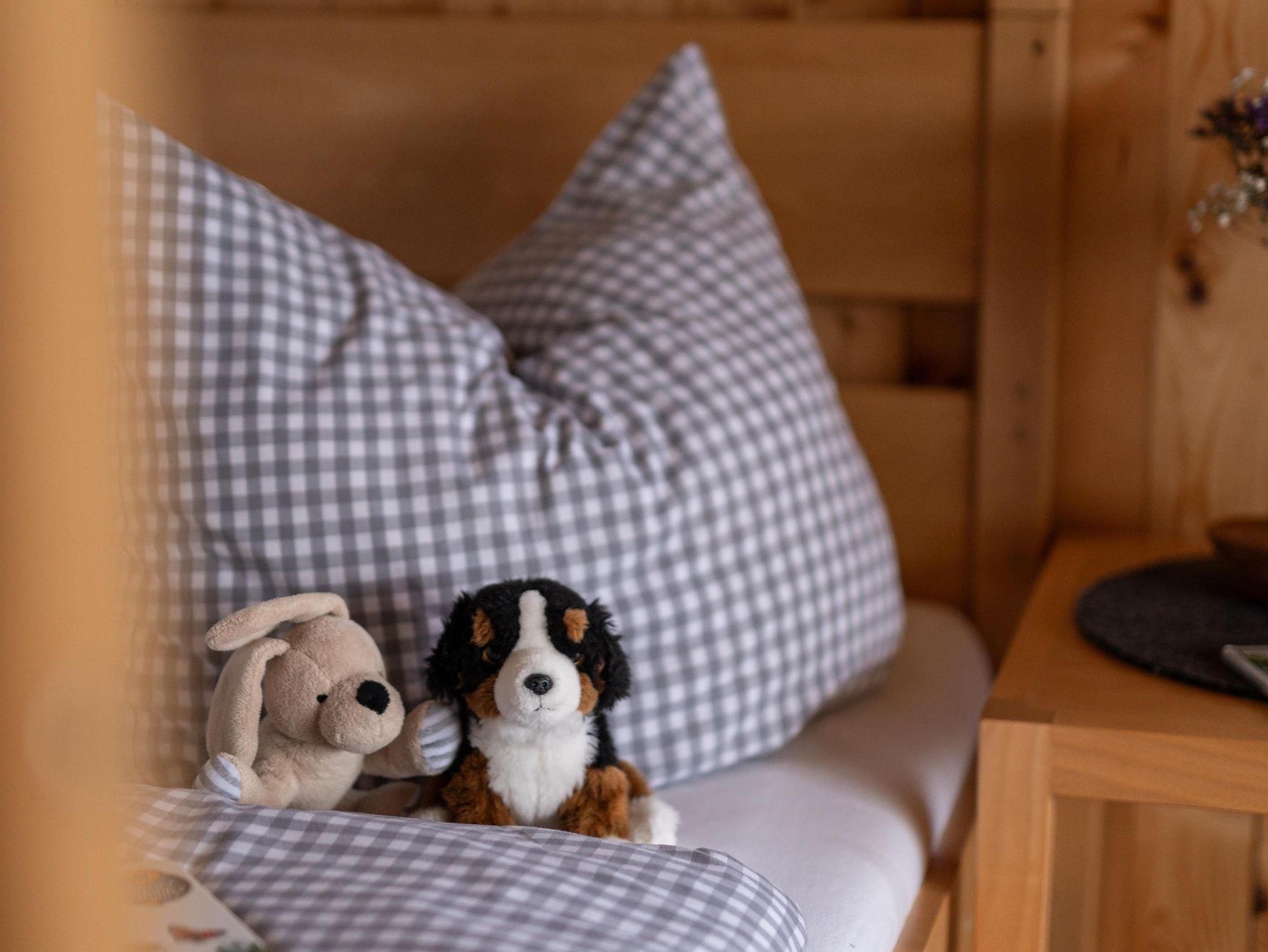 Das Appartement Mittagspitze verfügt über ein Schlafzimmer mit Doppelbett aus heimischem Zirbenholz, einem Schlafsofa im Wohnzimmer und einem Badezimmer mit Dusche/WC.