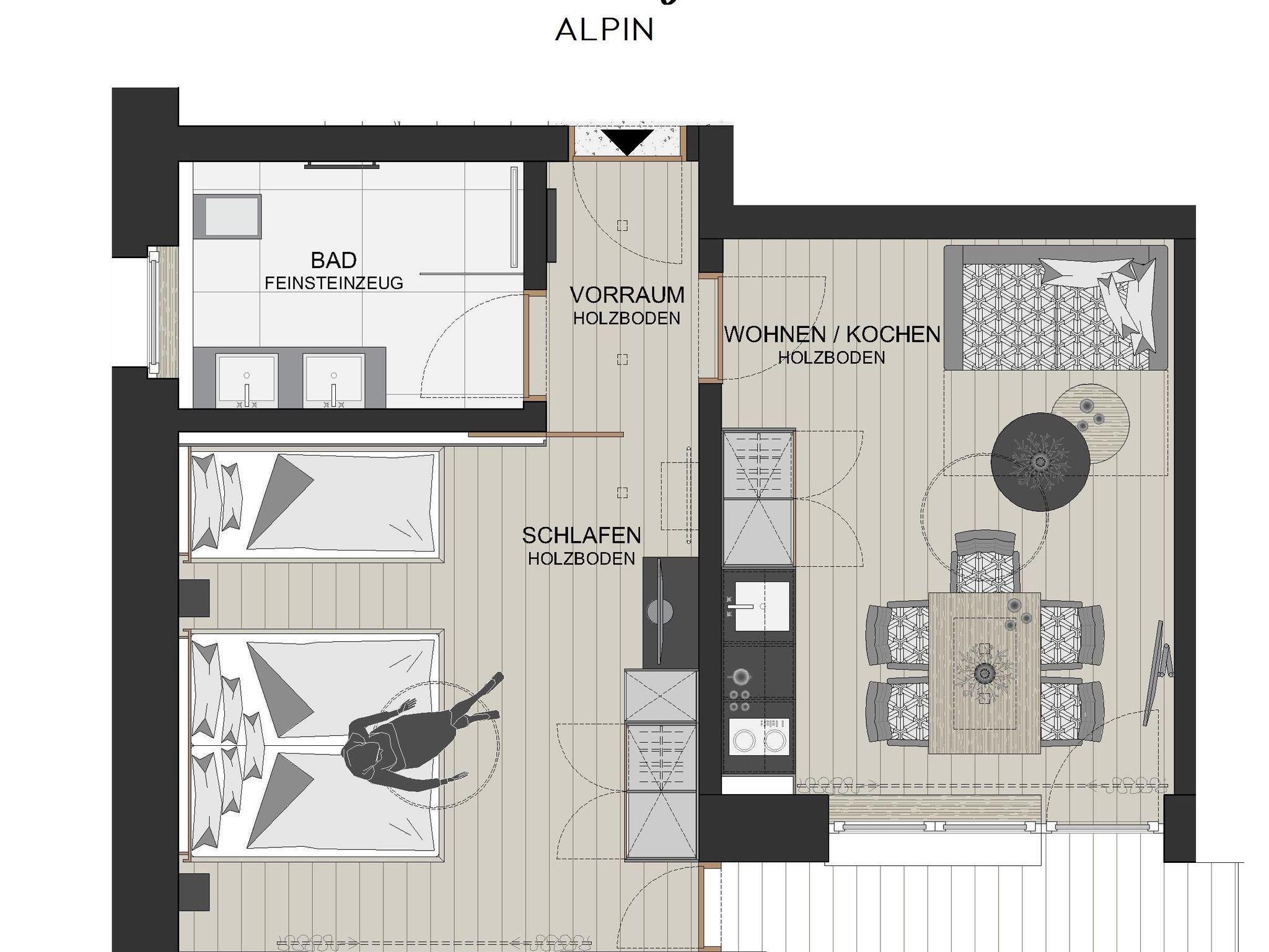 Bis zu 5 Personen einer Familie oder eine kleine befreundete Gruppe finden in den geräumigen Familienstudios Family Alpin Platz. Ein getrenntes Schlafzimmer mit Doppelbett und einem Einzelbett aus Zirbenvollholz sowie ein Wohnbereich mit hochwertiger Schlafcouch für die 4. und 5. Person sorgen für die nötige Erholung. Essbereich mit Kitchenette, Badezimmer mit Walk-In Regendusche und WC, Balkone für sonnige Stunden und panoramareiche Ausblicke. Glasfaser-TV im Schlaf- und Wohnzimmer, Telefon, Safe und kostenloses WLAN.