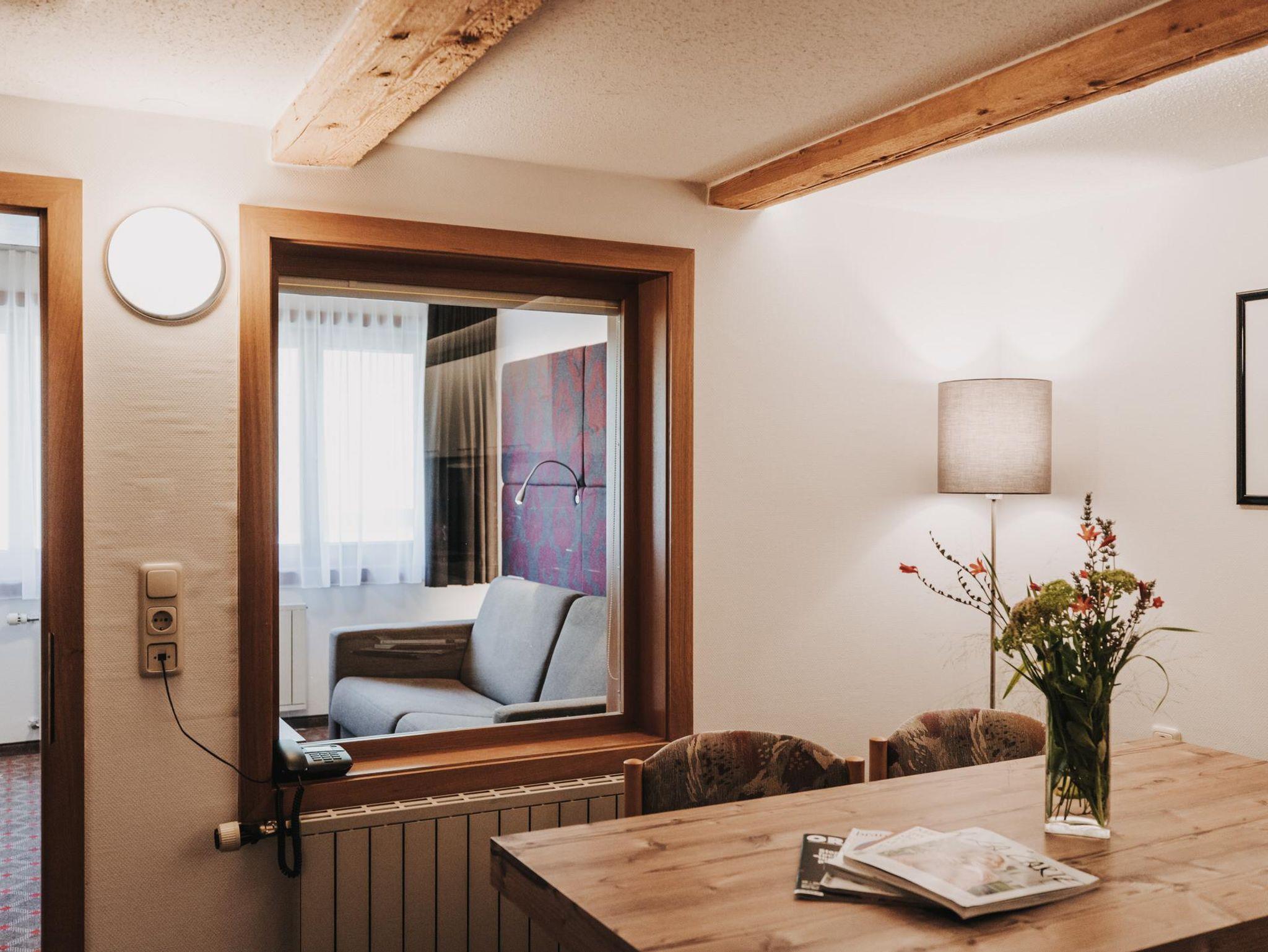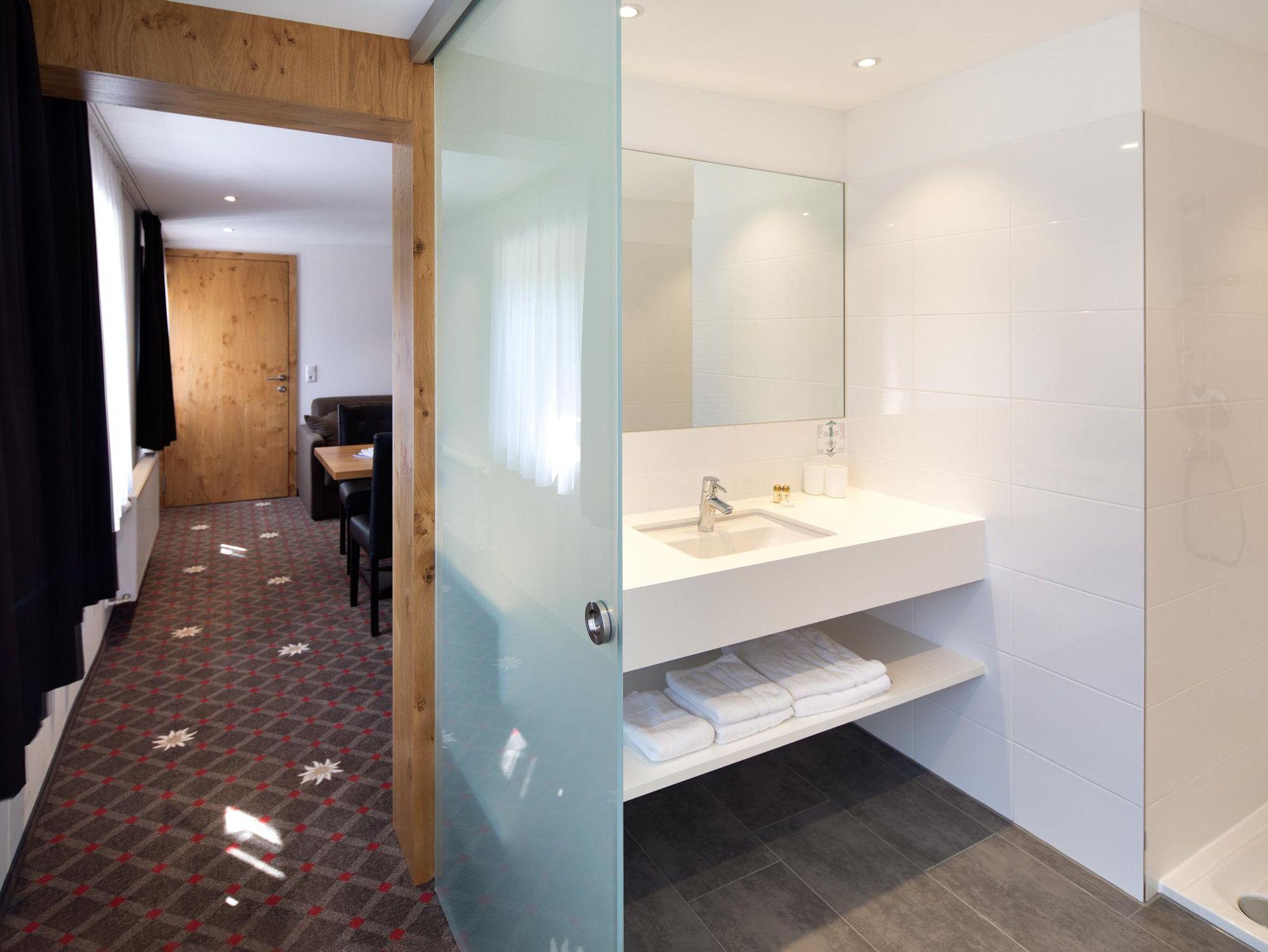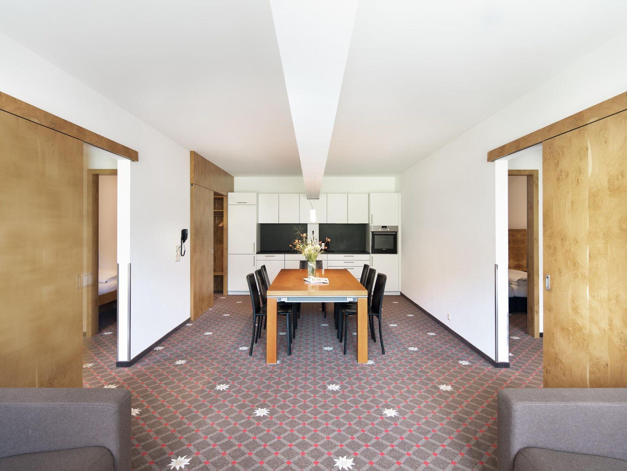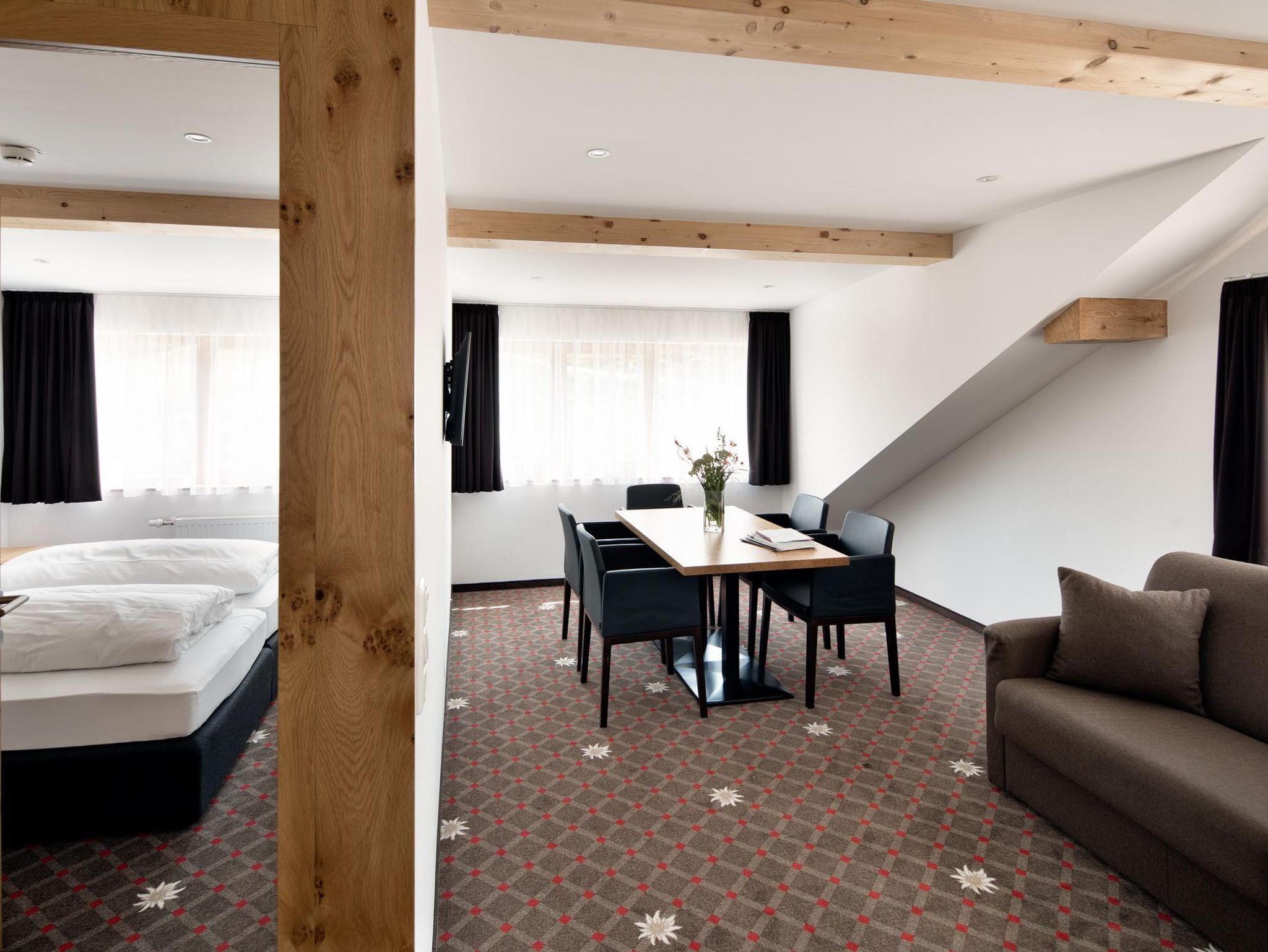 Ausgestattet mit Dusche/WC oder Bad/WC, ca. 40m2, 1 abgetrenntes Schlafzimmer mit Doppelbett, Wohnbereich mit Doppelschlafcouch, kleine Küche, Essbereich, kostenloses WLAN, SAT-TV/Radio, Safe, Fön, 1 Garagenplatz. Alle Hotelsuiten befinden sich ruhig gelegen im 1. und 2. Obergeschoss im Haupthaus mit Blick nach Westen, Norden und Süden