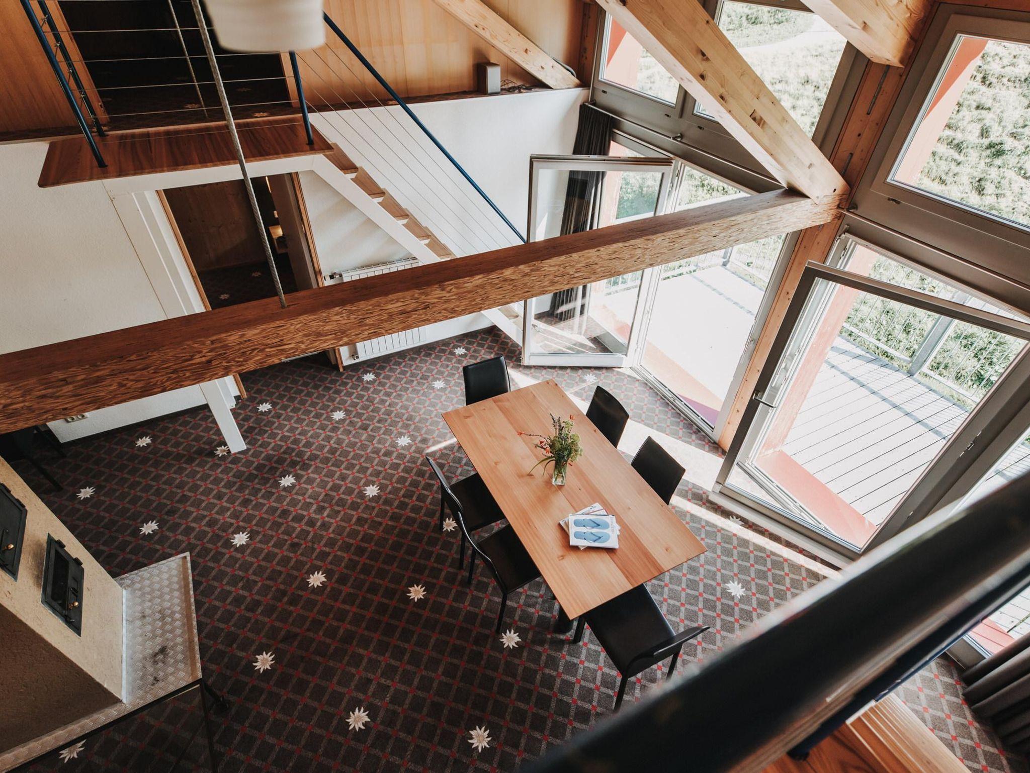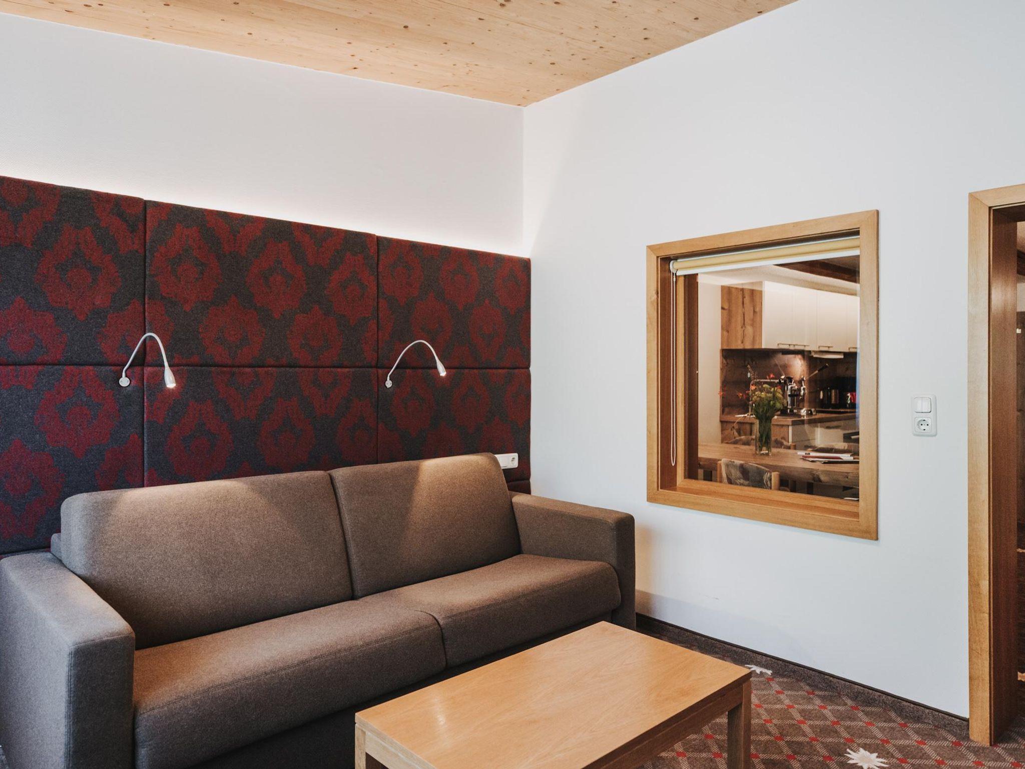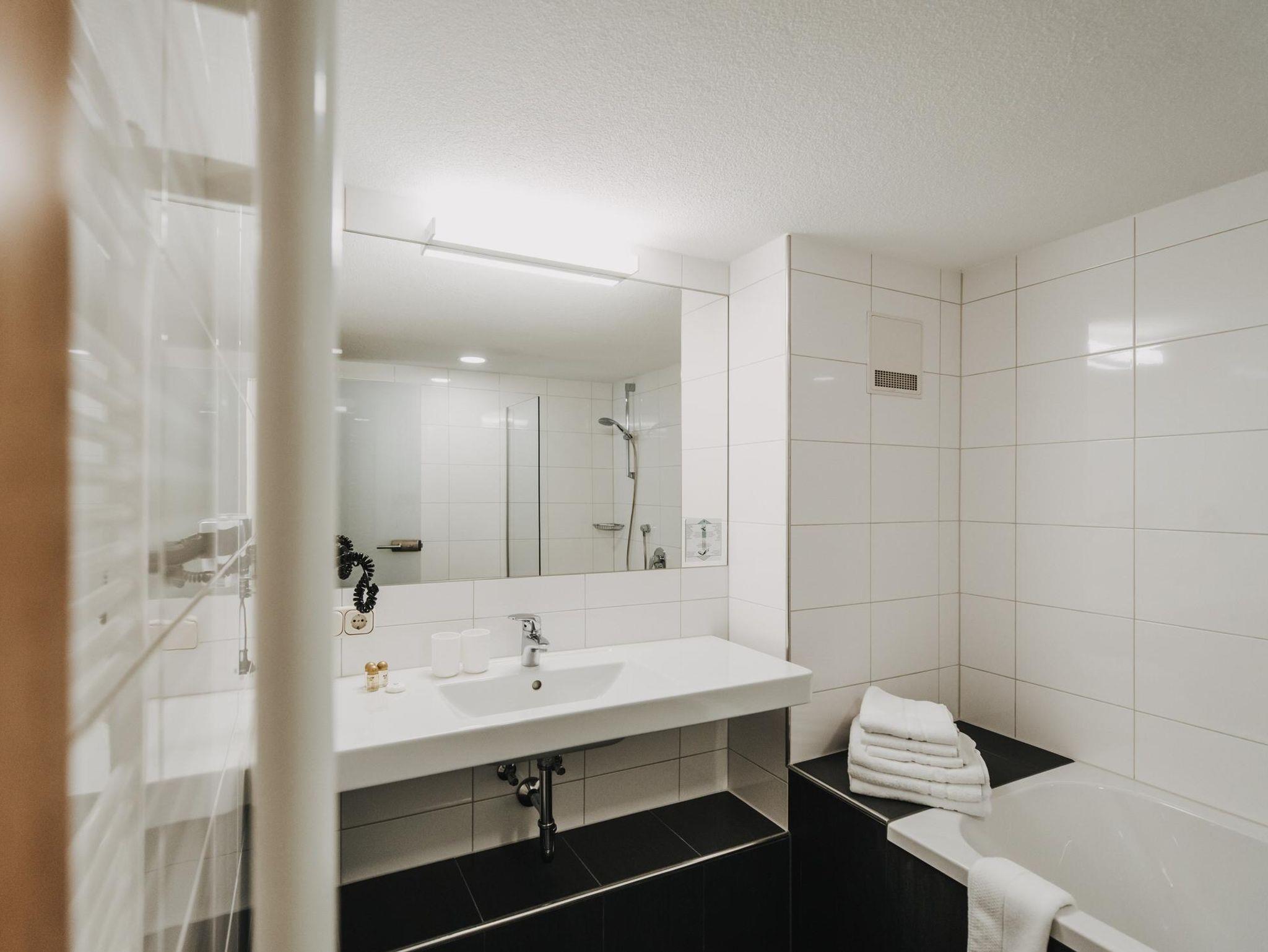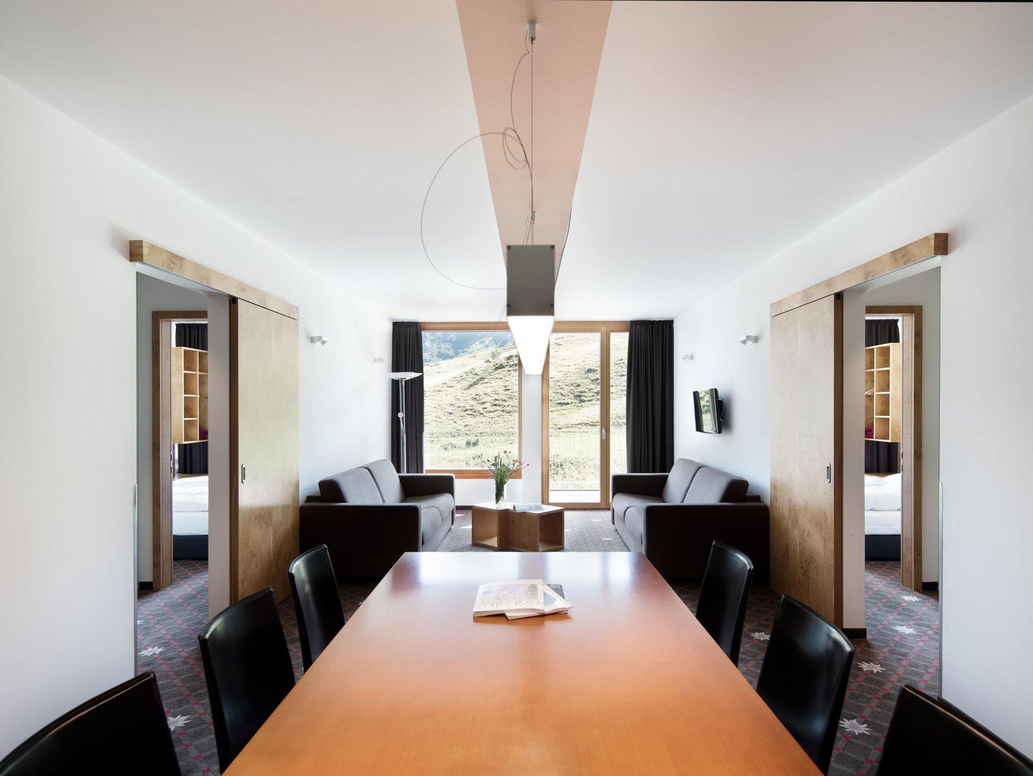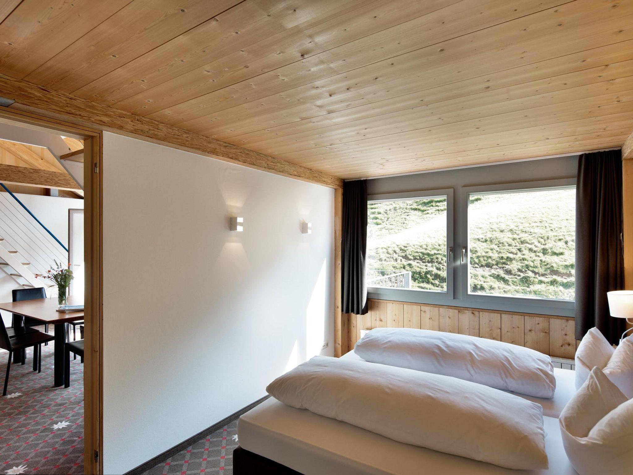 Ausgestattet mit Dusche/WC oder Bad/WC, ca. 40m2, 1 abgetrenntes Schlafzimmer mit Doppelbett, Wohnbereich mit Doppelschlafcouch, kleine Küche, Essbereich, kostenloses WLAN, SAT-TV/Radio, Safe, Fön, 1 Garagenplatz. Alle Hotelsuiten befinden sich ruhig gelegen im 1. und 2. Obergeschoss im Haupthaus mit Blick nach Westen, Norden und Süden