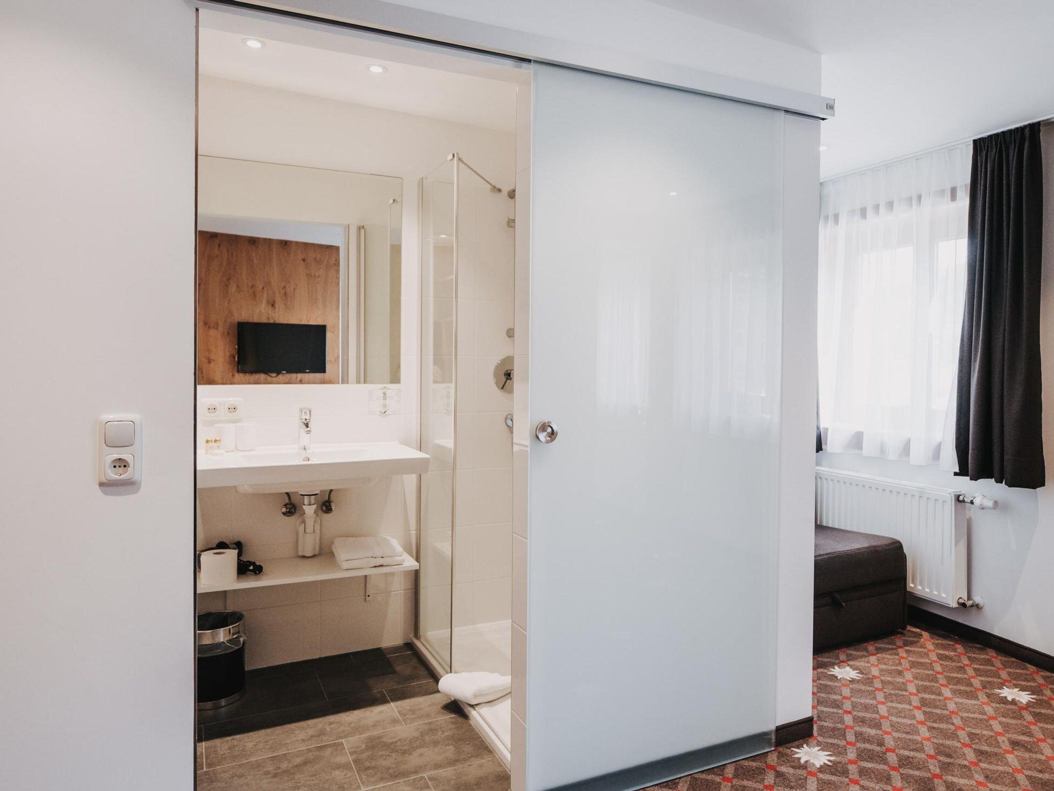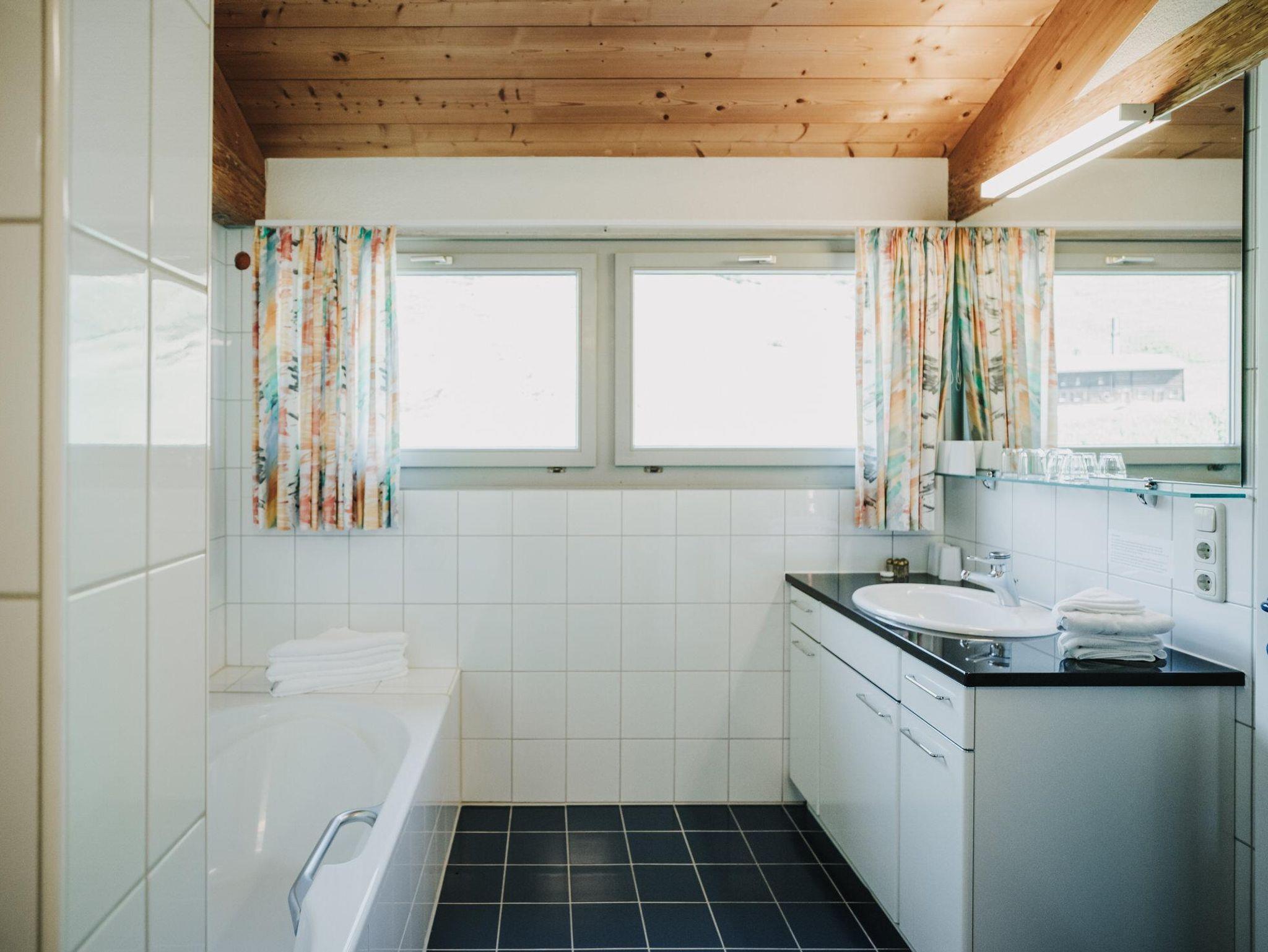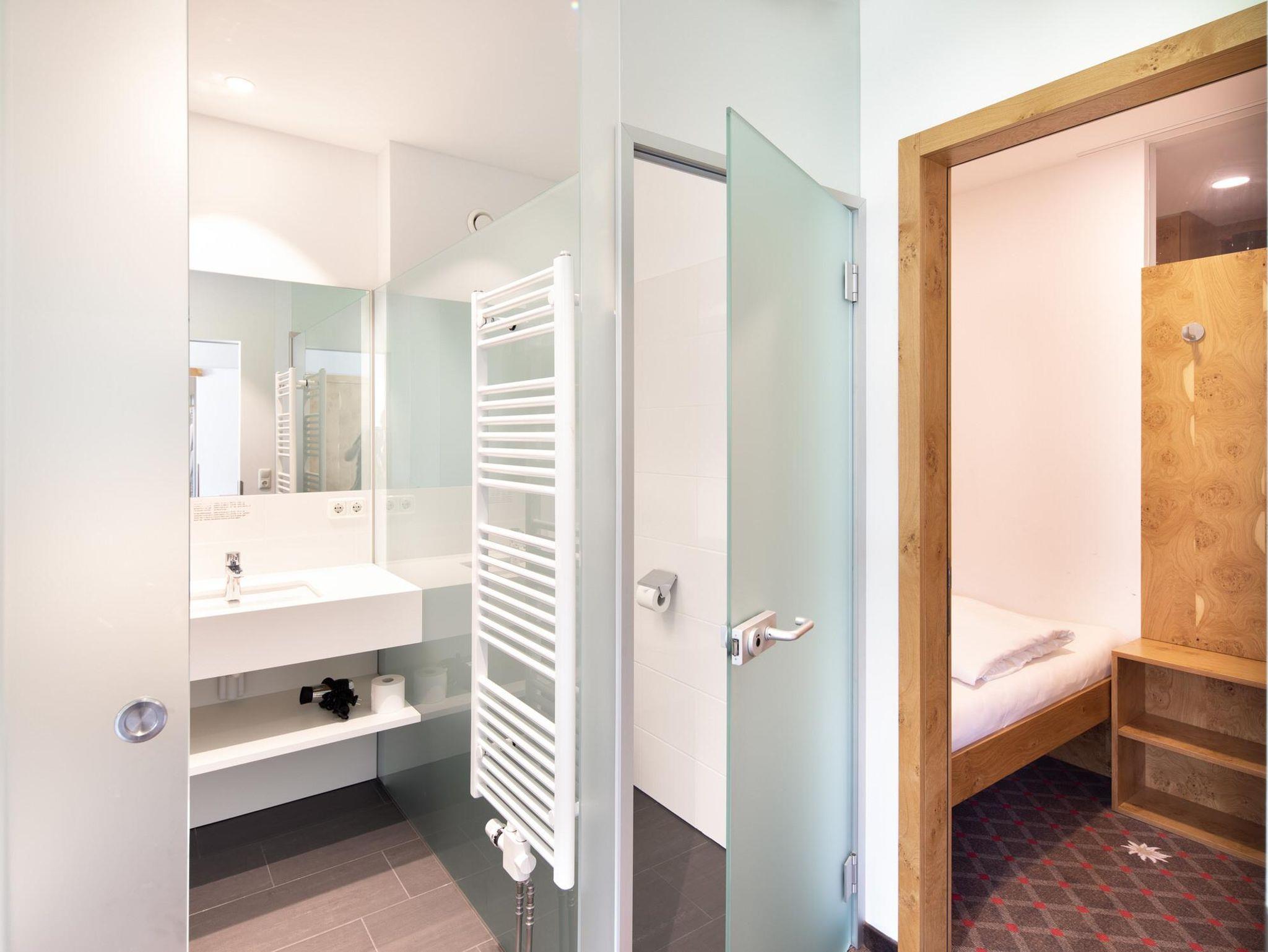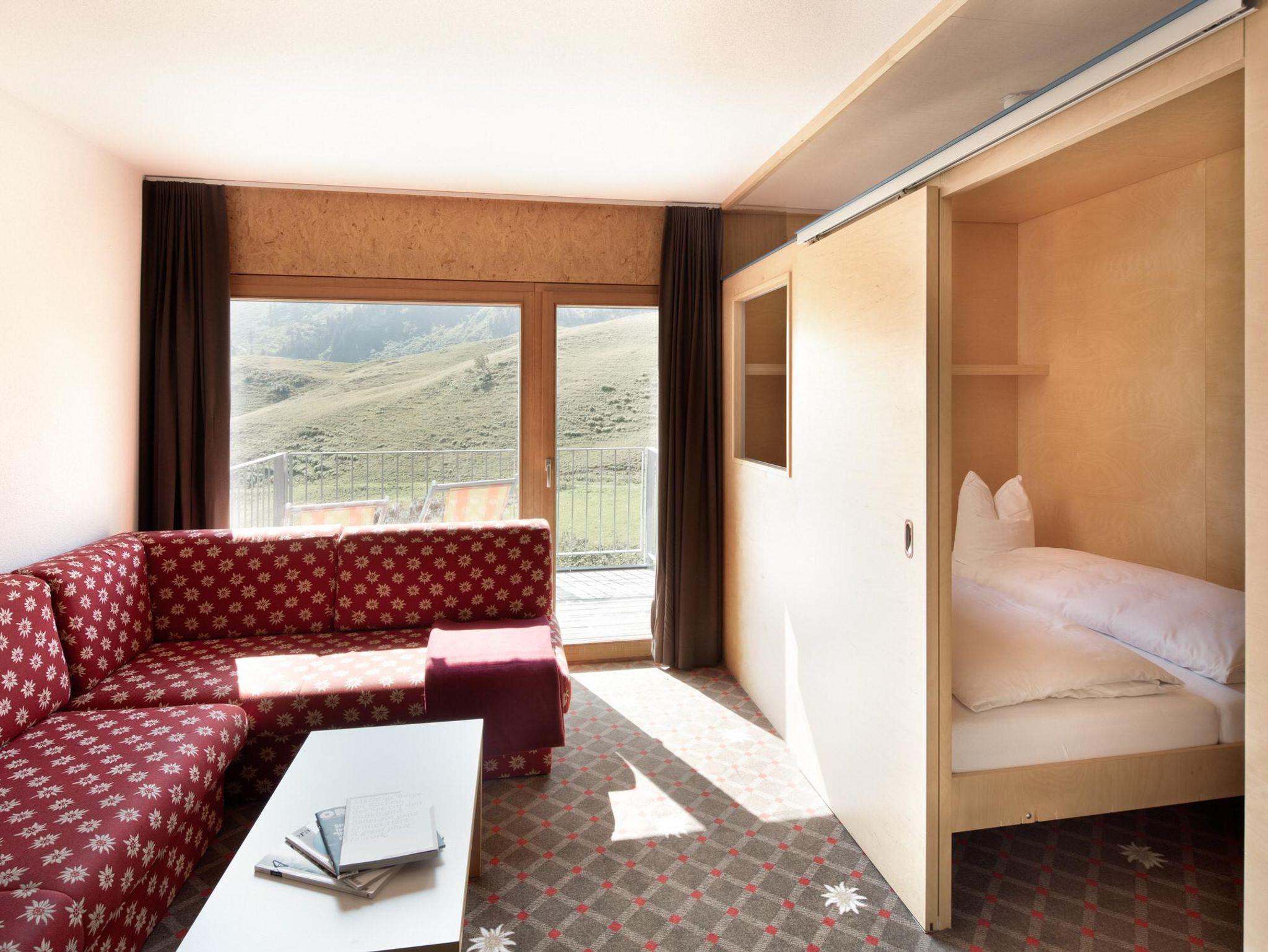 Ausgestattet mit Dusche/WC oder Bad/WC, ca. 40m2, 1 abgetrenntes Schlafzimmer mit Doppelbett, Wohnbereich mit Doppelschlafcouch, kleine Küche, Essbereich, kostenloses WLAN, SAT-TV/Radio, Safe, Fön, 1 Garagenplatz. Alle Hotelsuiten befinden sich ruhig gelegen im 1. und 2. Obergeschoss im Haupthaus mit Blick nach Westen, Norden und Süden