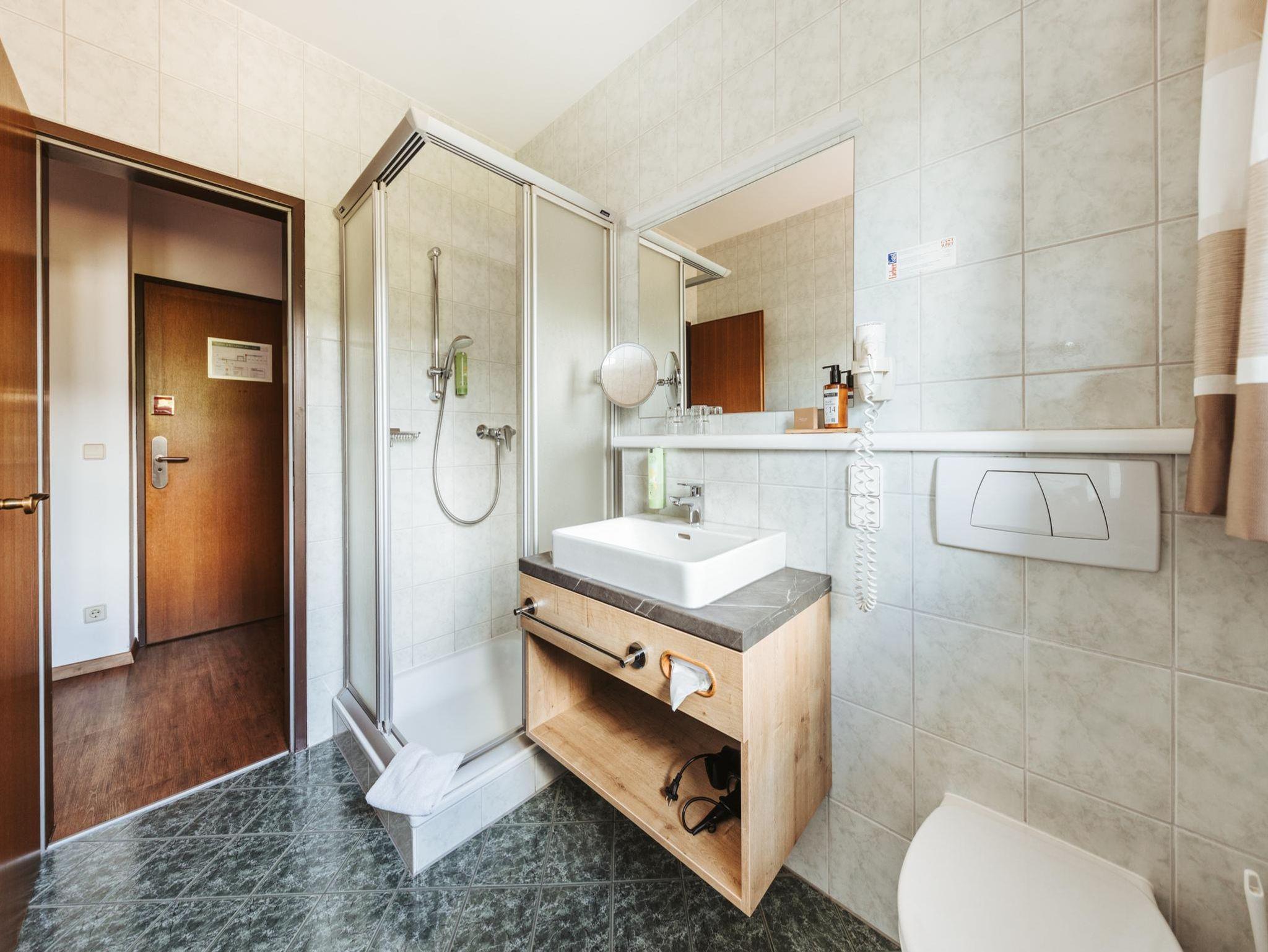 • Badezimmer mit Dusche, WC (teilweise getrennt), Fön