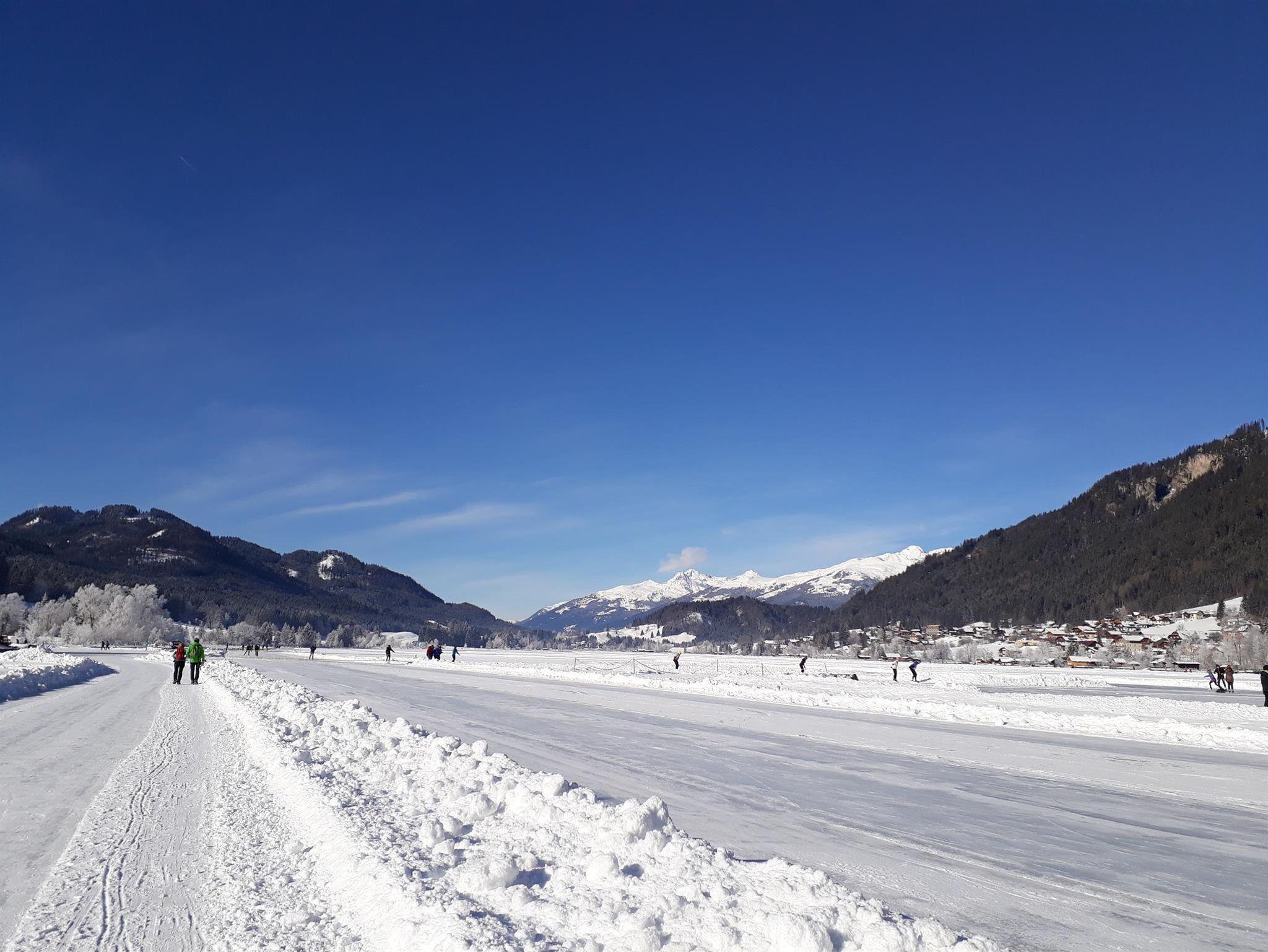 Der Einstieg auf die größte Natureisfläche Europas zum Eislaufen, Langlaufen, Eisstockschießen, spazieren gehen und Fahrten mit dem Pferdeschlitten befindet sich direkt vor unserem Gästehaus.