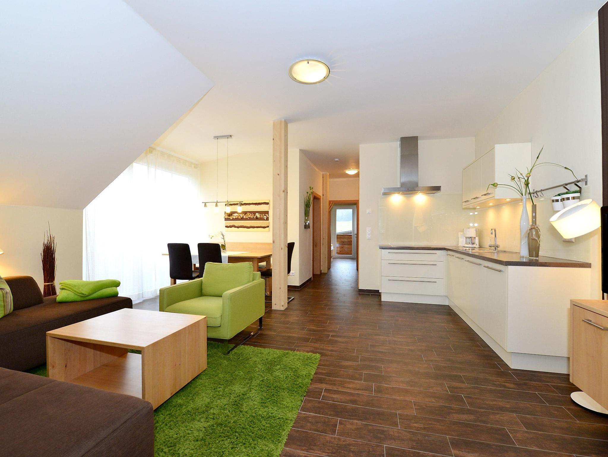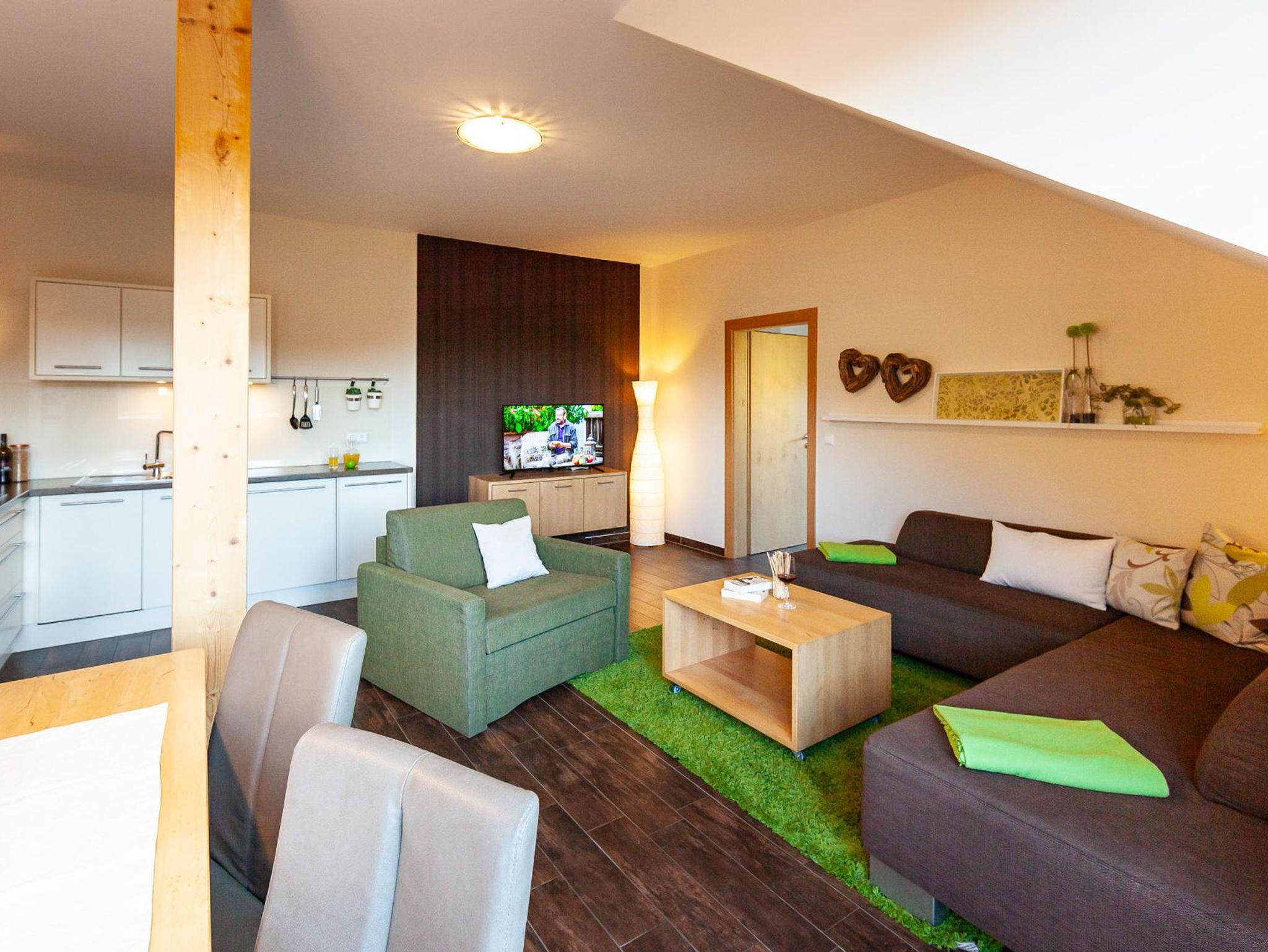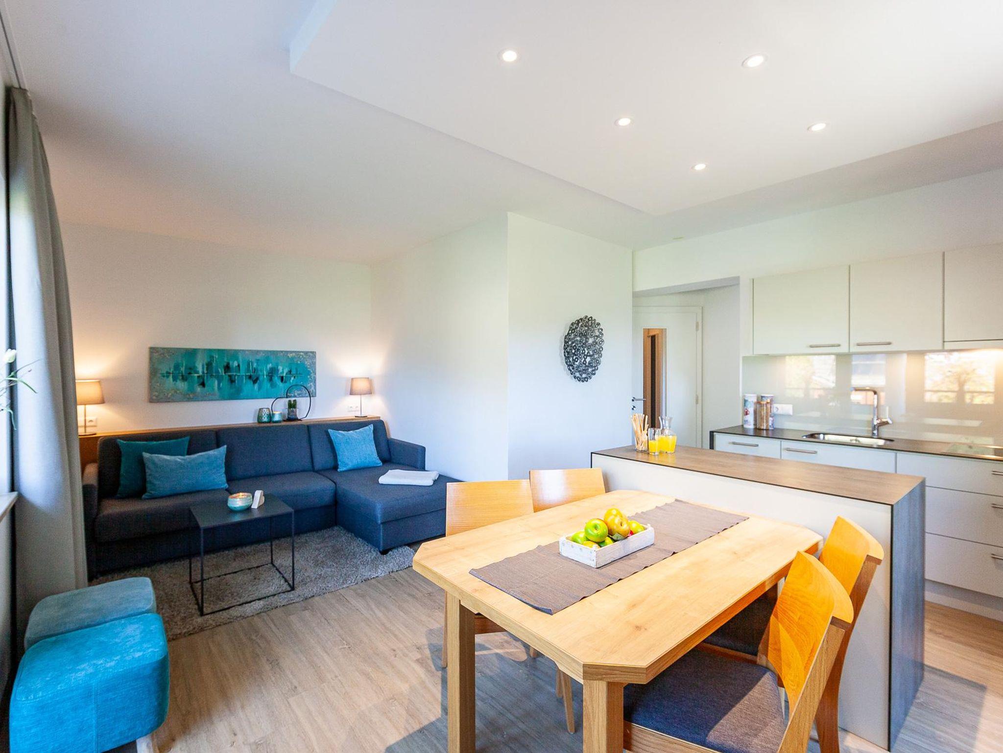 Im Schlafzimmer befindet sich neben dem Doppelbett noch zusätzlich ein bequemes Zustellbett, das einen weiteren Schlafplatz bietet. Der Wohnraum ist offen gestaltet und bietet neben der gut ausgestatteten Küche auch einen gemütlichen Essbereich. Eine große Couch mit Schlaffunktion sorgt für flexible Schlafmöglichkeiten und zusätzlichen Komfort.
