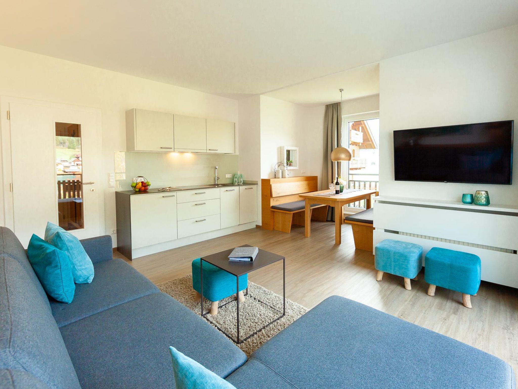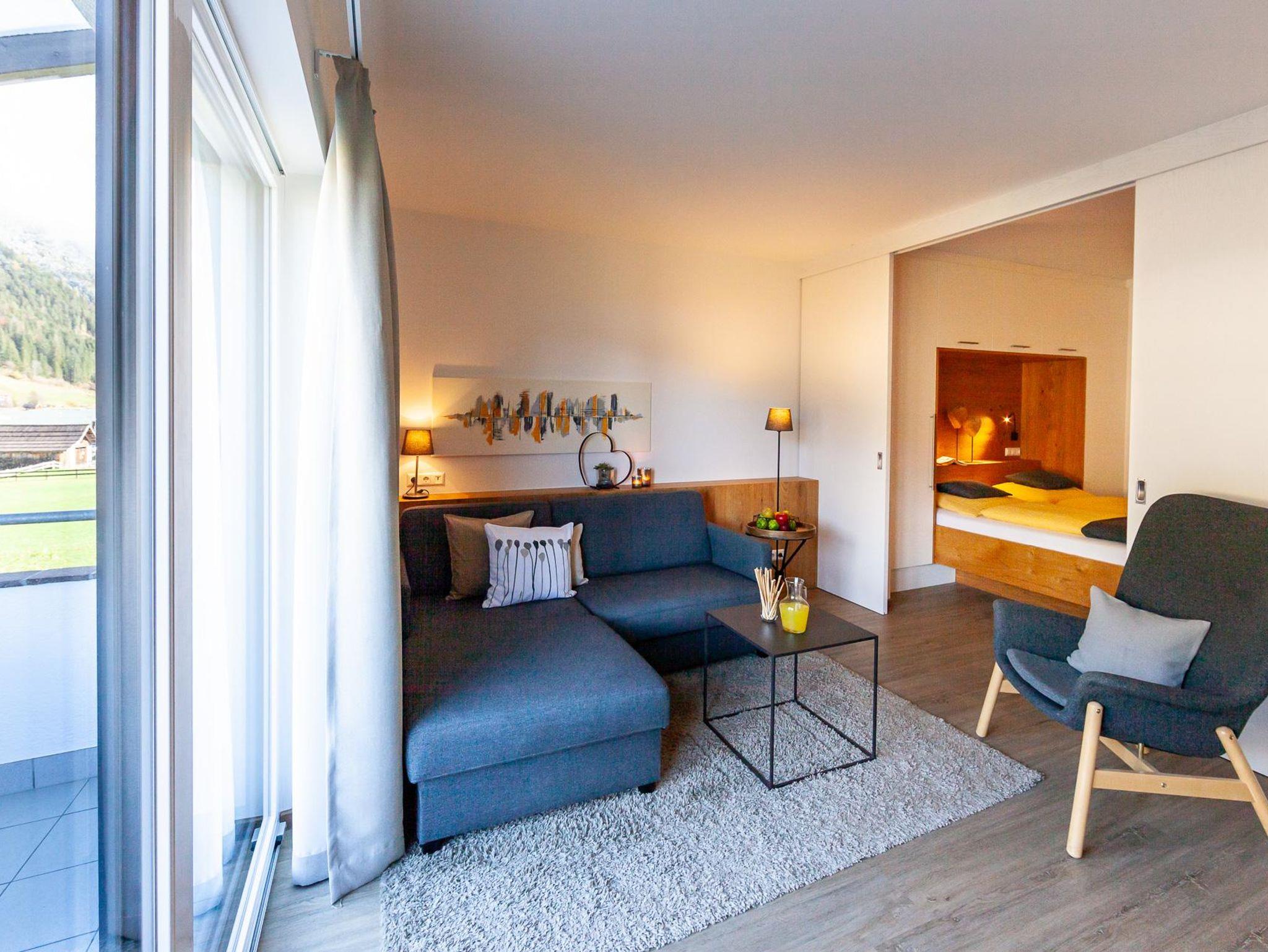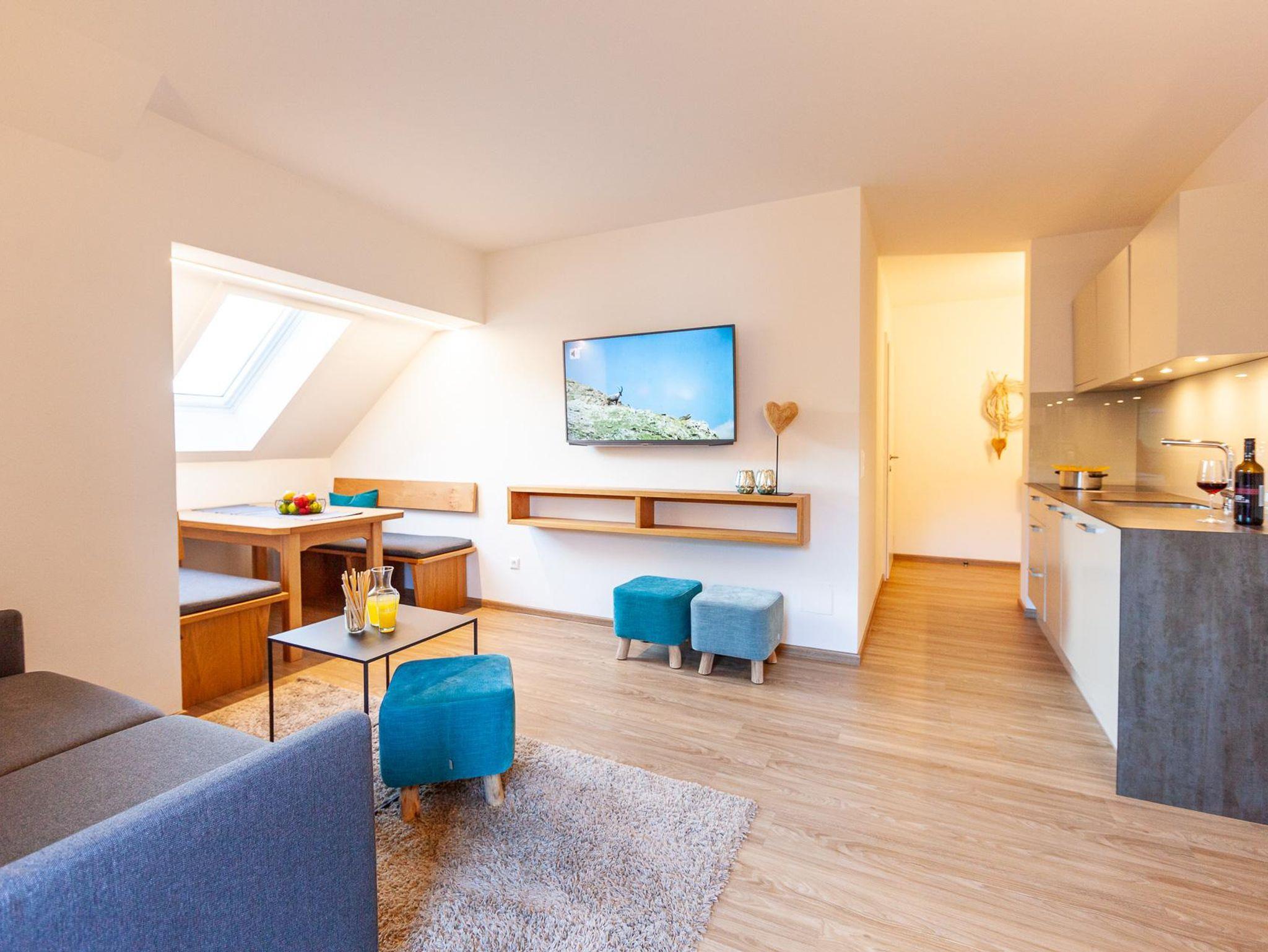 Im Schlafzimmer befindet sich neben dem Doppelbett noch zusätzlich ein bequemes Zustellbett, das einen weiteren Schlafplatz bietet. Der Wohnraum ist offen gestaltet und bietet neben der gut ausgestatteten Küche auch einen gemütlichen Essbereich. Eine große Couch mit Schlaffunktion sorgt für flexible Schlafmöglichkeiten und zusätzlichen Komfort.